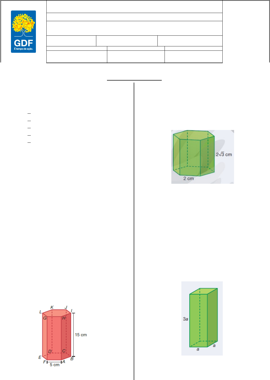 Valor: 5,0 Nota: ___________ CENTRO EDUCACIONAL 06 DE TAGUATINGA E.M. – ENSINO MÉDIO NOME DO(A) ALUNO(A) ANNA JÚLIA SANTANA SOARES DATA SEGMENTO: SEMESTRE: ___/___/2024 1ª SÉRIE 3º/4º/2024 PROFESSOR(A) DISCIPLINA TURMA JÚNIOR MATEMÁTICA/ GEO. ESPACIAL C ATIVIDADE 1 1) A diagonal do cubo cuja área total é 150 m2, mede em m: a) 5 b) 5 c) 6 d) 6 e) 7 2) A área total de um cubo cuja diagonal mede 5√3 cm é: 3) Um cubo possui lados de medida de 5 cm. Calcule: a) área lateral b) área da base c) área total 4) Calcule os volumes dos seguintes cubos: a) com profundidade de 10 m b) com largura de 15 cm c) com comprimento de 1,5 m 5) Observe o prisma hexagonal regular a seguir. a) Determine AD e AK. b) Qual a área e o perímetro do triângulo BEL? 6) Em relação ao prisma hexagonal regular abaixo, calcule: a) a área da base. b) a área lateral. c) a área total. 7) Um paralelepípedo reto retângulo, cuja base é um quadrado, tem a altura igual ao triplo do comprimento das arestas da base. Se o volume desse paralelepípedo é qual é o comprimento da aresta de sua base? 8) Qual o volume de concreto utilizado na construção de uma laje de 80 centímetros de espessura em uma sala com medidas iguais a 4 metros de largura e 6 metros de comprimento? 9) Uma calha em forma de prisma reto, conforme a figura abaixo, possui 5 m de comprimento e uma secção transversal ABC, na forma de V, tal que AB = AC = 40 cm e BÂC = 60°. Qual o volume que essa calha comporta? (Considere =1,73). 10) O volume V do paralelepípedo reto retângulo representado a seguir é igual a: Resolução das Questões image3.png image4.png image5.png image6.png image1.png image2.png