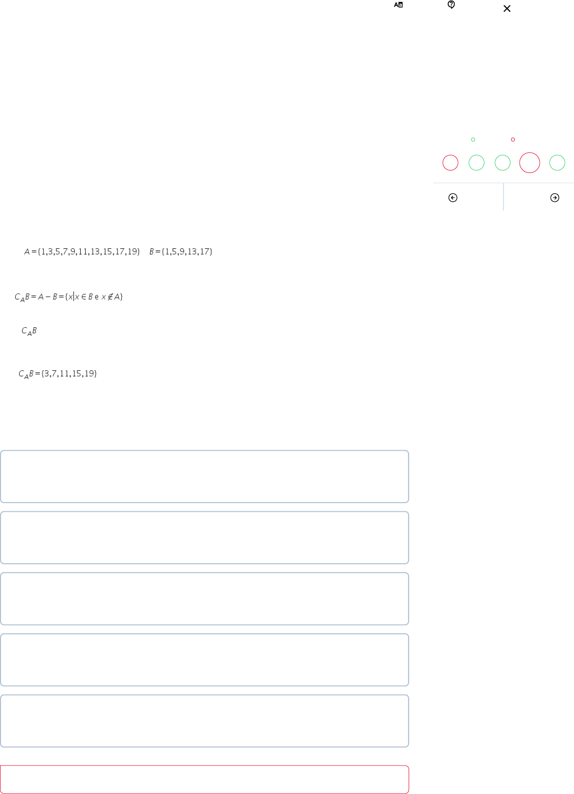 Questão 4 Respondida Como o nome indica, o complementar de um conjunto relativo a outro conjunto que o contém é uma ideia intuitiva de criar um conjunto a partir de dois outros, juntando todos os elementos que pertençam ao primeiro conjunto e que falta ao segundo para completar o primeiro. (UNIVERSIDAE FEDERAL DE SERGIPE (SE). Centro de Educação Superior a Distância. Fundamentos de Matemática. Sergipe: CESAD, [2006?]. Disponível em: https://www.cesadufs.com.br/ORBI/public/uploadCatalago/15245816022012Fundamentos_de_Matematica_aula_9.pdf. Acesso em: 15 mar. 2020.) Sejam e , e as seguintes definições a respeito do complementar de B em relação a A: I. O . II, O consiste no conjunto formado por elementos que pertencem exclusivamente a A, quando comparados com os elementos de B. III, O . É correto o que se afirma apenas em III, apenas. I e II, apenas. I e III, apenas. II e III, apenas. I, II e III. III, apenas. Sua resposta Prova final Lógica e Matemática Computacional Acertos 3 de 5 Nota 6 pontos Corretas Erradas 1 2 3 4 5 Anterior Próxima Correção da prova Tamanho da fonte Dúvidas ao tutor O complemento de B em relação a A consiste no conjunto constituído por todos os elementos pertencentes a B que não pertencem a A. Assim, O consiste no conjunto formado por elementos que pertencem exclusivamente a A, quando comparados com os elementos de B (a afirmação II é correta). Logo, tem-se que (a afirmação III é correta). Simbolicamente, podemos representar pela diferença (a afirmação I não é correta).