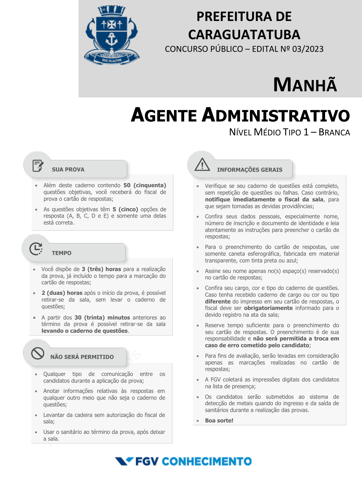 pcimarkpci MDAwMDowMDAwOjAwMDA6MDAwMDowMDAwOmZmZmY6MmQwNzoxYTg4:V2VkLCAxNiBPY3QgMjAyNCAxOTo1Nzo1NSAtMDMwMA== www.pciconcursos.com.br PREFEITURA DE CARAGUATATUBA CONCURSO PÚBLICO – EDITAL Nº 03/2023 MANHÃ AGENTE ADMINISTRATIVO NÍVEL MÉDIO TIPO 1 – BRANCA Além deste caderno contendo 50 (cinquenta) questões objetivas, você receberá do fiscal de prova o cartão de respostas; As questões objetivas têm 5 (cinco) opções de resposta (A, B, C, D e E) e somente uma delas está correta. Verifique se seu caderno de questões está completo, sem repetição de questões ou falhas. Caso contrário, notifique imediatamente o fiscal da sala, para que sejam tomadas as devidas providências; Confira seus dados pessoais, especialmente nome, número de inscrição e documento de identidade e leia atentamente as instruções para preencher o cartão de respostas; Para o preenchimento do cartão de respostas, use somente caneta esferográfica, fabricada em material transparente, com tinta preta ou azul; Assine seu nome apenas no(s) espaço(s) reservado(s) no cartão de respostas; Confira seu cargo, cor e tipo do caderno de questões. Caso tenha recebido caderno de cargo ou cor ou tipo diferente do impresso em seu cartão de respostas, o fiscal deve ser obrigatoriamente informado para o devido registro na ata da sala; Reserve tempo suficiente para o preenchimento do seu cartão de respostas. O preenchimento é de sua responsabilidade e não será permitida a troca em caso de erro cometido pelo candidato; Para fins de avaliação, serão levadas em consideração apenas as marcações realizadas no cartão de respostas; A FGV coletará as impressões digitais dos candidatos na lista de presença; Os candidatos serão submetidos ao sistema de detecção de metais quando do ingresso e da saída de sanitários durante a realização das provas. Boa sorte! Você dispõe de 3 (três) horas para a realização da prova, já incluído o tempo para a marcação do cartão de respostas; 2 (duas) horas após o início da prova, é possível retirar-se da sala, sem levar o caderno de questões; A partir dos 30 (trinta) minutos anteriores ao término da prova é possível retirar-se da sala levando o caderno de questões. Qualquer tipo de comunicação entre os candidatos durante a aplicação da prova; Anotar informações relativas às respostas em qualquer outro meio que não seja o caderno de questões; Levantar da cadeira sem autorização do fiscal de sala; Usar o sanitário ao término da prova, após deixar a sala. SUA PROVA TEMPO NÃO SERÁ PERMITIDO INFORMAÇÕES GERAIS pcimarkpci MDAwMDowMDAwOjAwMDA6MDAwMDowMDAwOmZmZmY6MmQwNzoxYTg4:V2VkLCAxNiBPY3QgMjAyNCAxOTo1Nzo1NSAtMDMwMA== www.pciconcursos.com.br pcimarkpci MDAwMDowMDAwOjAwMDA6MDAwMDowMDAwOmZmZmY6MmQwNzoxYTg4:V2VkLCAxNiBPY3QgMjAyNCAxOTo1Nzo1NSAtMDMwMA== www.pciconcursos.com.br PREFEITURA DE CARAGUATATUBA FGV CONHECIMENTO AGENTE ADMINISTRATIVO – MANHÃ TIPO BRANCA – PÁGINA 3 Língua Portuguesa 1 Assinale a opção que apresenta o processo de construção que está identificado corretamente. (A) Processo anafórico: Ele vai indicar três soluções. Duas são simples de executar, mas a terceira apresentará problema. (B) Inversão sujeito e verbo: Há muita gente do lado de fora. (C) Passiva impessoal: Fizeram muita bagunça na festa. (D) Destaque de termo: Cabral, o descobridor, morreu cedo. (E) Tempo simultâneo: Logo que chegou, começou a espirrar. 2 Uma frase interrogativa é a que formula uma pergunta. Quando a resposta pode ser sim/não, dizemos que a interrogação é total, e, em caso contrário, parcial. Assinale a frase que mostra uma interrogação total. (A) O que você vai fazer neste final de semana? (B) Você, como eu, tem medo de escuridão? (C) Você está no vestibular para Medicina ou Enfermagem? (D) Para onde você vai amanhã de manhã? (E) Como você descobriu meu telefone? 3 Assinale a opção que apresenta a frase em que o sujeito está anteposto. (A) Na praia de Copacabana, são encontradas pessoas de todo o país. (B) No fundo da floresta vivia um lobo solitário. (C) Através da folhagem passavam os raios de sol. (D) A aldeia se encontrava a alguns quilômetros da cidade. (E) No fundo do vale corria um regato límpido. 4 Todas as frases a seguir permitem a inferência de um local em que estão inseridas; assinale a frase em que o local indicado está inadequado à frase. (A) Depois da refeição, minha mãe lava a louça na cozinha. / hotel. (B) O barulho dos aviões que decolam encobre a nossa voz. / aeroporto. (C) Estávamos famintos e ficamos contentes quando a garçonete se aproximou de nós. / restaurante. (D) Quando soa a campainha, os meninos correm para o pátio. / escola. (E) O motorista pede às crianças que se sentem antes de arrancar. / ônibus. 5 Em todos os exemplos a seguir há um termo sublinhado e um pronome que retoma esse mesmo termo; assinale a frase em que o pronome utilizado para a retomada pertence a um tipo diferente dos demais. (A) Joana encontrou um emprego dentro de sua especialidade. Ela vai começar amanhã de manhã. (B) O professor deixou-nos uma semana para terminar esse relatório. Ele precisará, no entanto, que ele seja feito dentro da teoria explicada. (C) Sílvio tomou o trem das 10 horas. Apesar disso, pode ser que ele chegue um pouco atrasado. (D) Miguel está preparando um doce de amêndoas e um pão com passas. Ele ainda precisa de ajuda para terminar a tempo. (E) O filme da equipe do Carlos era muito estático. O teu era muito mais dinâmico. 6 Assinale a frase que se mostra sem ambiguidade. (A) João e Roberto gostam de esportes de salão, mas o esporte que ele prefere é o volibol. (B) Emília e Marta mudam brevemente; ela vai morar pertinho de mim. (C) David e Filipe querem os dois participar da equipe de basquetebol, segundo um deles me disse. (D) Houve uma briga entre Chico e seu irmão. A discussão entre eles foi violenta e os dois foram separados. Só na manhã 