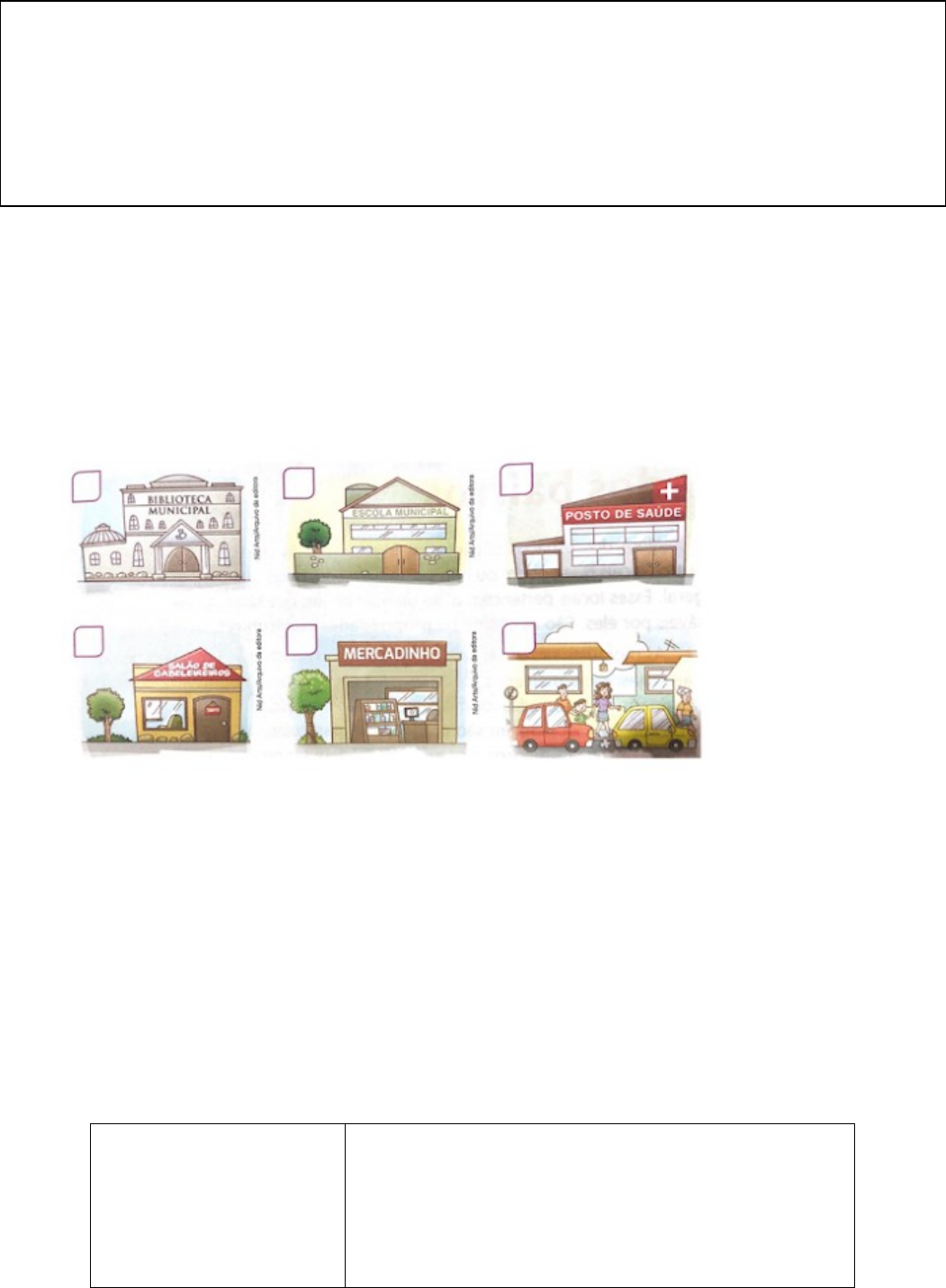 AVALIAÇÃO DE HISTÓRIAESCOLA: Municipal Rômulo Galvão. Data : 18 de setembro de 2023. Alunoª:___________________________________________________________________ Professora : Maronice Souza unidade_3ª_ 1.Observe a imagem e faça o que se pede: a) Circule na ilustração o espaço público . b)Marque um x nos espaço doméstico . c)pinte o quadradinho de espaço privado. 2.Preencham o quadro a seguir com exemplos de espaços públicos do nosso município . Espaço de lazer Espaço de educação Locais de prestação de serviços 3.identifique nas fotografias a seguir. Estufa do jardim botânico.Curitiba casa residencial.Livramento · Pinte de azul o quadrinho que identifica espaço doméstico e de verde o identifica espaço de conservação ambiental. 4.Responda : a)Lique os serviços públicos municipais ás respectivas atribuições. Prefeito Elaborar as leis que regularão o dia a dia do município e fiscalizar o trabalho da prefeitura . O trabalho da prefeitura Vereadores Administrar o município e garantir que os interesses da população sejam respeitados assegurados. b)faça um x nos espaços da nossa cidade que vocês já visitaram. image3.jpeg image4.jpeg image5.jpeg image6.jpeg image7.jpeg image8.png image1.png image2.jpeg