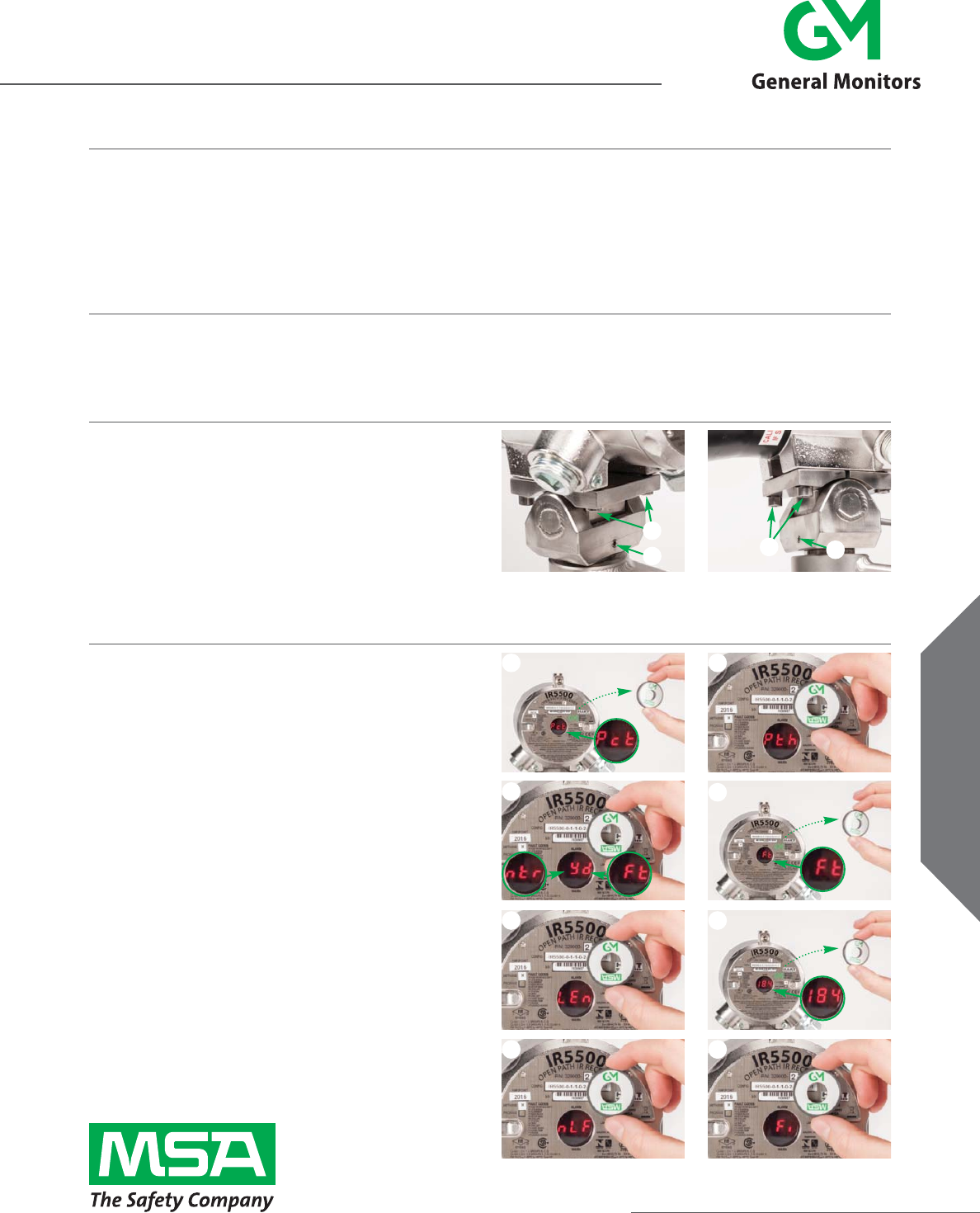 Because every life has a purpose... Alignment Guide— IR5500 Open Path Gas Detector Tools Required • 1 x 5 mm Allen wrench • 2 x 2.5 mm hex wrenches • Range finder or Rolling Distance Measuring wheel • Alignment Scope (optional, P/N 329082-1) Clear Path and Measure Distance • Clear the path of any obstructions • Measure and record distance between Source and Receiver q Fully tighten back cap screws with 5 mm Allen wrench w Loosen front cap screw with 5 mm Allen wrench e Loosen fine adjust screws with 2.5 mm hex wrench so that they are flush with housing r Starting at Source, use the housing sights to aim the units at each other. Align the notch and pin of the sights with the center of the opposing unit Rough Align Source and Receiver q Hold the GM magnet over the GM logo on the label of the Receiver for approximately five seconds w The display will cycle between the menu options e Remove magnet when "Pct" appears to enter Percent Signal menu r Quickly apply magnet over "Pth" and hold there t Display will cycle through path length unit options Yard (“Yd”), Meter (“ntr”), Feet (“Ft”) y Select unit by removing magnet when unit is displayed u Quickly reapply magnet when “LEn” displays and hold i Enter measured distance between Source and Receiver by removing the magnet when the value displays o Options for Light Filter and Attenuator (short range only) will display: - “nLF” (no light filter), “LF” (light filter) - “nAT” (no attenuator), “AT” (attenuator) a Change option by applying magnet when option is displayed s Apply magnet over “Fi” when finished to enter alignment mode Enter Percent Signal Menu (PcT) and Path Information (Pth) Ensure that there is not combustible gas present in the background before proceeding. Failure to do this could desensitize the system to gas. Two people are recommended, but not required to complete the alignment process. Each person should have 2 x 2.5 mm hex wrenches. Installing open path gas detection in areas of high traffic or with permanent obstructions in the path will result in frequent critical faults. See Installation Guide for complete list of recommendations. l l  x2 q e r u t y a s e ew i Note: This Bulletin contains only a general description of the products shown. While uses and performance capabilities are described, under no circumstances shall the products be used by untrained or unqualified individuals and not until the product instructions including any warnings or cautions provided have been thoroughly read and understood. Only they contain the complete and detailed information concerning proper use and care of these products. Specifications subject to change without notice. ID 1465-019-MC / September 2016 © MSA 2016 Printed in U.S.A. Corporate Headquarters: MSA – The Safety Company 1000 Cranberry Woods Drive Cranberry Township, PA 16066 United States +1-724-776-8600 info.us@MSAsafety.com Design Center: General Monitors 26776 Simpatica Circle Lake Forest, CA 92630 United States +1-949-581-4464 info.gm@MSAsafety.com Additional locations can be found on our web site: www.MSAsafety.com MSAsafety.com/detection q The display will flash a value between 1–80 to indicate the percent signal received w Starting at Source, place a 2.5 mm hex wrench in each fine adjust screw. Tilt Source head up and down by simultaneously tightening one fine adjust screw while loosening the other. Do this until the percent signal reading on Receiver is maximized. a. Tightening the front screw will tilt Source head downwards. b. Tightening the back screw will tilt Source head upwards. e When finished with Source fine adjust, use the 5 mm Allen wrench to tighten all four cap screws. a. The percent signal value may decrease when the four cap screws are tightened. You may need to over compensate on fine adjust screws to accomodate the change from tightening the cap screws. r Move to Receiver and repeat step 2. The percent signal received should be at or above 100% for best performance and fault tolerance. The numbers will stop flashing to indicate that an acceptable value has been reached. a. The absolute minimum signal is 80% and the numbers will stop flashing at this point. b. It is highly recommended to get a value as high as possible. t When finished with Receiver alignment, tighten all four cap screws (see step 3). y Place magnet over the GM logo to exit. The unit will go through a zero calibration, and then return to normal operation. Optimize Percent Signal Using Fine Adjust Screws AJ Mode Alignment • IR5500s built before July 2016 do not have the “PcT” alignment mode • All of the same steps should be followed, except user will not be asked to enter path information • Instead of “PcT,” user will see “AJ” and select by removing magnet • Unit will go straight into the flashing A## menu • The “AJ” value should be maximized for the ranges provided below STD. CONFIG. RANGE (20-100 m) 20 m 30 m 40 m 50 m 60 m 70 m 80 m 90 m 100 m EXTENDED PATH RANGE (80-150 m) N/A 80 m 90 m 100 m 110 m 120 m 130 m 140 m 150 m AJ VALUE 72 to 67 65 to 60 59 to 54 53 to 48 49 to 43 45 to 38 43 to 35 39 to 32 35 to 30 “AJ” Mode is still available on models built after July 2016. Refer to operation manual for details. Failure to firmly tighten cap screws will result in critical faults due to misalignment. If using two people, have one at Source and one at Receiver. The percent signal mode will time out in 60 minutes. l  x2 í Aw Bw