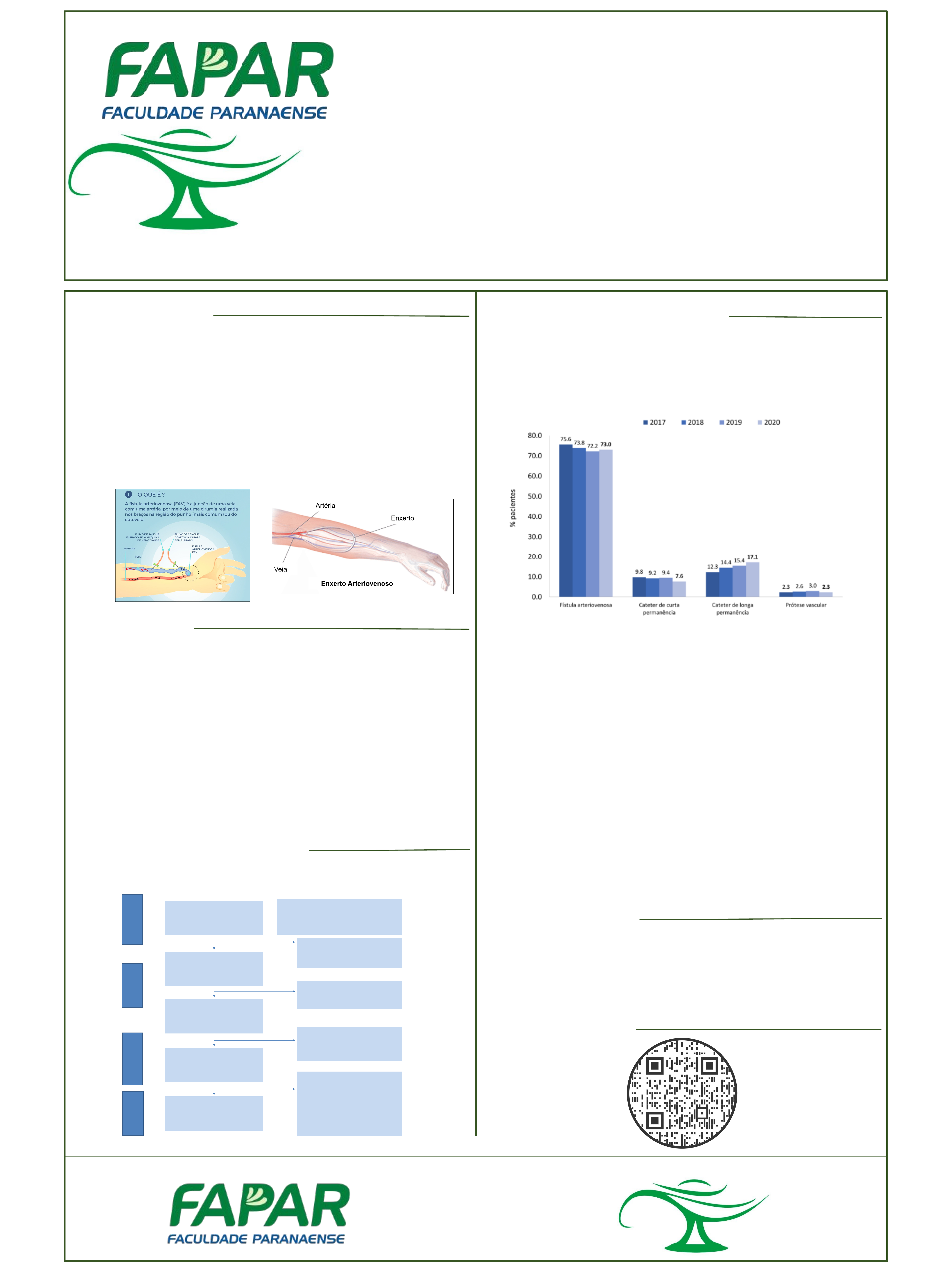 Apoio:Patrocínio: Autores: Ediney B. F. da Rocha e Síria P. dos Santos Orientador(a): Prof° Andrey Maciel de Oliveira, MS.c. Curso: Enfermagem MANEJO DO ENFERMEIRO FRENTE AOS ACESSOS DE FÍSTULAS E PRÓTESES PARA HEMODIÁLISE OBJETIVOS INTRODUÇÃO A Doença Renal Crônica (DRC) constitui-se em um problema de saúde pública mundial e crescente, que se caracteriza pela deterioração progressiva e irreversível da função renal. Pacientes que evoluem para Doença Renal Crônica Terminal (DRCT) necessitam de algum tipo de terapia renal substitutiva (TRS), sendo as modalidades disponíveis: a hemodiálise, a diálise peritoneal e o transplante renal (BRASIL, 2014). Pacientes dependentes de hemodiálise (HD) têm duas opções para acesso vascular permanente da extremidade superior: fístula arteriovenosa e enxerto arteriovenoso. As fístulas são criadas conectando cirurgicamente a veia de um paciente a uma artéria, enquanto os enxertos usam um tubo protético como um conduto entre uma artéria e uma veia (WOO,2015). Fonte: SBN (2023). Fonte: Blausen.com staff. "Blausen gallery 2014" O objetivo geral é identificar a importância do enfermeiro acerca dos cuidados com as fístulas arteriovenosas (FAV) e próteses para o tratamento de hemodiálise objetivando a manutenção e perviedade efetiva dos acessos a partir da assistência prestada ao cliente. Objetivos Específicos: 1. Reduzir o risco de infecções nos acessos de FAV e Próteses; 2. Aumentar a durabilidade e a permeabilidade dos acessos de FAV e Próteses; 3. Reduzir o risco de estenose ou trombose dos acessos de FAV e Próteses; 4. Orientar os pacientes renais crônicos acerca dos cuidados antes, durante e após as sessões de HD. MATERIAL E MÉTODOS - Fluxograma do processo de seleção dos artigos REFERENCIAL TEÓRICO O acesso vascular (AV) é um componente essencial do tratamento de Hemodiálise (HD), e a fístula arteriovenosa (FAV) nativa ainda é a primeira escolha de AV para a maioria dos pacientes incidentes em HD, dada sua morbidade mais baixa, baixo custo e patência a longo prazo em comparação com enxertos e cateteres venosos centrais (FRANCO, 2022). Conforme o gráfico a seguir: Fonte: NERBASS (2022, p. 354). De acordo com as diretrizes práticas atuais, a FAV radiocefálica é o primeiro tipo de acesso a ser escolhido, seguido da braquiocefálica e da braquiobasílica. A lógica a ser seguida é a que a criação do acesso mais distal contribui para preservação das veias proximais que podem estar disponíveis para uma futura FAV em caso de perda da atual, além de ser um acesso de criação relativamente mais simples e com menor incidência de complicações (CORREIA, 2021). A fístula está suscetível a diversas complicações como hipofluxosanguíneo, tromboses, aneurismas, infecções, isquemia da mão, edema de mão e sobrecarga cardíaca (PESSOA, 2015). A prevenção e o monitoramento de complicações da FAV configuram-se, atualmente, como uma das principais estratégias que devem ser instituídas pelas unidades de saúde como resposta ao desafio que se interpõem de aprimorar a qualidade da diálise oferecida pelo maior tempo possível com maior preservação da rede vascular de acesso (HUBER, 2016). Conforme descrito por Ishani (2014) apud Silva (2020) o enfermeiro tem competências cognitivas e habilidades para identificar as intercorrências que venham a comprometer o acesso vascular e saber como atuar nas mesmas, assim como também promover o ensino do cuidado à sua equipe, a fim de cooperar e contribuir para a segurança do paciente. PERSPECTIVAS Espera-se com esse estudo, colaborar para a sistematização das intervenções autônomas de enfermagem, contribuindo assim, para o desenvolvimento de competências que permitem ao enfermeiro, nas unidades de diálise, ser capaz de avaliar e interpretar de forma eficaz e capacitada os dados objetivos e subjetivos da FAV, contribuindo ainda para uma assistência segura com elevado destaque à função de examinador do enfermeiro. ENFERMAGEM REFERÊNCIAS Id e n ti fi c a ç ã o Se le çã o E le g ib ili d a d e In c lu s ã o Total de referências recuperadas pela estratégia de busca (n = 906) Total de referências identificadas (n = 598) Referências selecionadas pelo título e resumo (n = 308) Referências avaliadas e elegíveis na íntegra (n = 286) Referências incluídas (n = 175) Total de referências recuperadas pela busca manual (n = 22) Referências duplicadas removidas (n = 330) Referências excluídas pelo título e resumo (n = 290) Referências excluídas por indisponibilidade do arquivo (n = 22) Referências excluídas (n = 111) Motivos: Utilizaram citação secundária da definição, finalidade ou etapas da revisão integrativa Slide 1: MANEJO DO ENFERMEIRO FRENTE AOS ACESSOS DE FÍSTULAS E PRÓTESES PARA HEMODIÁLISE