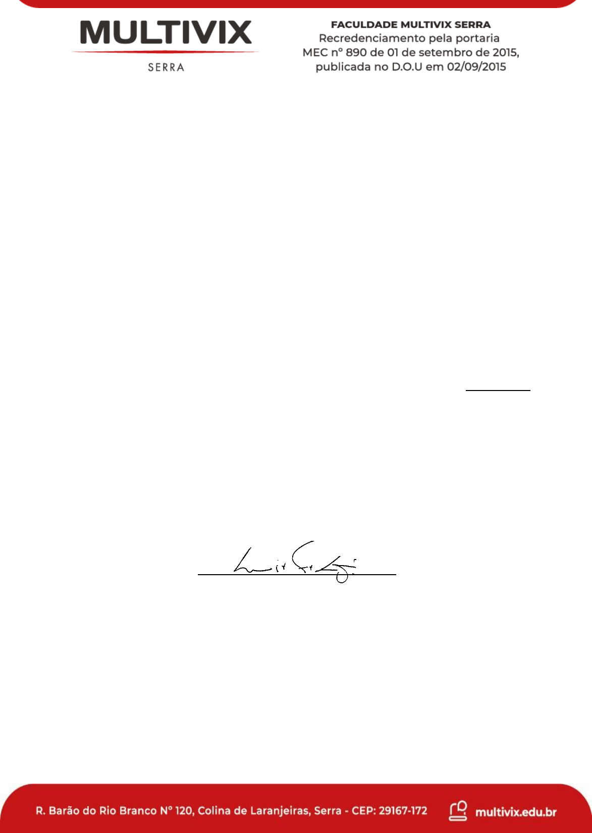 CARTA DE APRESENTAÇÃO DO ESTAGIÁRIO A Faculdade Multivix Serra acredita que a formação de seus alunos deve conjugar, desde o princípio, momentos de discussão teórica e momentos de vivências e experimentações das práticas cotidianas das escolas, dos sujeitos que nela convivem todos os dias – alunos, professores, funcionários não docentes e comunidade mais ampla, favorecendo uma percepção mais completa da dinâmica do processo educativo. Assim, a Faculdade encaminha para estágio na _________________________________________________________ o aluno regularmente matriculado nesta instituição de ensino, sob a matrícula nº___ ______. O regime da Faculdade Multivix Serra é semestral e a carga horária total do Estágio em questão é de 200 horas no período conforme Matriz Curricular Vigente. Luiz Felipe de Carvalho Macena Coordenação de Cursos ____________________________ do 4º Período do Curso de Gestão de Vendas, DECLARAÇÃO DE ACEITE DO ESTAGIÁRIO Declaro, para fins de comprovação junto à Coordenação de Estágio do Curso de Faculdade Multivix Serra, que o (a) aluno (a) _________________________________________ regularmente matriculado sob a matricula nº_____________________, no semestre Instituição, foi aceito como estagiário(a). Assinatura do responsável e carimbo da Instituição _________________,_______de______________de 2023 letivo de 2023/2 desta Gestão de Vendas da FICHA DE ESTÁGIO DE ACOMPANHAMENTO MENSAL ESTÁGIO SUPERVISIONADO FICHA DE ESTÁGIO DE ACOMPANHAMENTO MENSAL Estagiário(a): Semestre: Nº de Matrícula: Curso: Cidade: Período do Estágio: Professor Supervisor do Estágio: Data Horário Atividades Assinatura do Aluno Inicio Término Data Horário Atividades Assinatura do Aluno Inicio Término Total de Horas no semestre: /ES, / / Assinatura da(o)estagiária(o): Assinatura do (a) Supervisor (a) de campo: (todos os documentos deverão ser assinados e carimbados pelo Supervisor de Campo) Luiz Felipe de Carvalho Macena Coordenação de Cursos Total de Horas no semestre: