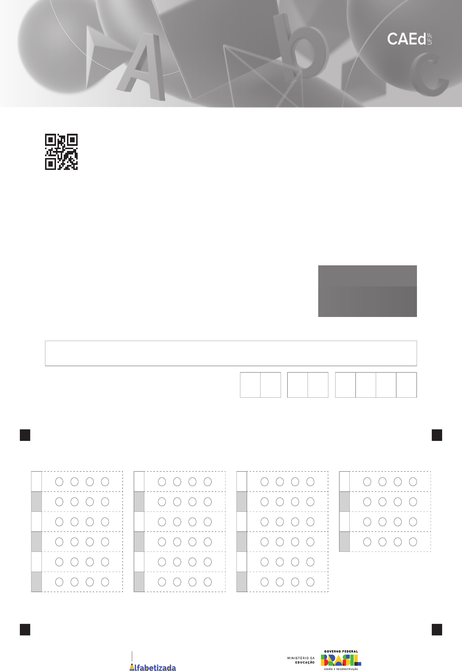 CADERNO Data de Nascimento do(a) estudante Nome do(a) estudante M 0 5 0 1 AVALIAÇÃO CONTÍNUA DA APRENDIZAGEM CICLO III 2024 1966M0501 5º ano do Ensino Fundamental MATEMÁTICA 44445544119977332299 01 02 03 04 05 06 07 08 09 10 11 12 13 14 15 16 17 18 19 20 21 22 A B C D A B C D A B C D A B C D Criança Compromisso Nacional BL01M05 Leia e observe as informações do quadro abaixo para responder às quatro questões a seguir. Marcos mora em um condomínio com vários prédios. Observe a representação da vista frontal de alguns desses prédios e Marcos brincando no parque em frente ao prédio em que ele mora. (M00076418_CEN) 01) (M00076421) Em um trabalho escolar, Marcos usou um diagrama de linhas e colunas para identificar o prédio em que mora e alguns ambientes desse condomínio. Observe esse diagrama abaixo. 4 3 Jardim Prédio 2 1 Portaria Parque J K L M N Pela representação feita por Marcos, qual é o par ordenado que corresponde à localização do prédio em que ele mora? A) M3. B) M2. C) J3. D) J1. 02) (M00076418) No condomínio em que Marcos mora há 12 prédios com 36 apartamentos em cada um deles. Qual é o número total de apartamentos nesse condomínio? A) 36. B) 48. C) 322. D) 432. M0501 1 BL01M05 03) (M00076419) Observe abaixo uma ilustração da placa que está no parquinho do condomínio em que Marcos mora. Qual é a altura máxima permitida, em centímetro, nesse parquinho? A) 13 cm. B) 103 cm. C) 130 cm. D) 1 300 cm. 04) (M00076420) A figura geométrica espacial abaixo corresponde a um cilindro reto e foi desenhada por Marcos para representar o formato da caixa d’água do condomínio. Qual é a planificação que corresponde a essa figura? A) B) C) D) M0501 2 BL02M05 Leia e observe as informações do quadro abaixo para responder às quatro questões a seguir. Observe, na imagem abaixo, Rafael se divertindo ao lado de alguns dos seus brinquedos e de um mosaico que ele fez e, em seguida, colocou em um quadro na parede. (M00076423_CEN) 05) (M00076423) Observe, no quadro abaixo, algumas peças de um brinquedo de Rafael. 20 3 20 5 20 2 20 4 Nesse quadro, as frações representam as quantidades de peças que Rafael possui para cada formato apresentado. Qual é a ordem crescente dessas quantidades? A) 20 3 , 20 5 , 20 2 , 20 4 . B) 20 2 , 20 3 , 20 4 , 20 5 . C) 20 5 , 20 4 , 20 3 , 20 2 . D) 20 4 , 20 2 , 20 5 , 20 3 . M0501 3 BL02M05 06) (M00076426) Observe, na malha quadriculada abaixo, o mosaico feito por Rafael. A medida da área de cada quadradinho da malha é igual a 1 decímetro quadrado. Qual é a medida total, em decímetro quadrado, da área desse quadro? A) 20 dm2. B) 24 dm2. C) 36 dm2. D) 64 dm2. 07) (M00076427) Observe abaixo as 20 peças de um brinquedo de Rafael. Uma dessas peças possui um adesivo com o desenho de um relógio. Qual é a fração que representa a quantidade de peças com o adesivo de um relógio em relação à quantidade total de peças? A) 3 1 . B) 5 1 . C) 19 1 . D) 20 1 . 08) (M00076424) O quebra‑cabeça que Rafael está montando tem 850 peças. Ele guarda todas essas peças em 5 caixas diferentes, colocando a mesma quantidade de peças em cada uma. Quantas peças desse quebra‑cabeça Rafael coloca em cada uma dessas caixas? A) 17. B) 110. C) 170. D) 4 250. M0501 4 BL03M05 Leia e observe as informações do quadro abaixo para responder às quatro questões a seguir. Observe, na imagem abaixo, uma professora durante sua explicação e parte da sala de aula. (M00076428_CEN) M0501 5 BL03M05 09) (M00076430) Observe abaixo uma representação da pirâmide que está na mesa da professora. Qual a planificação correspondente a essa figura? A) B) C) D) 10) (M00076428) Nessa turma estudam, ao todo, 20 alunos. Nesse dia, 4 alunos faltaram à aula. Qual é a fração que representa a quantidade de alunos que faltou em relação ao total de alunos dessa turma? A) 20 4 . B) 16 4 . C) 4 16 . D) 4 20 . M0501 6 BL03M05 11) (M00076431) Conforme a imagem abaixo, um dos estudantes possui uma garrafa de água onde está escrita sua capacidade em mililitro. Qual é a capacidade, em litro, dessa garrafa? A) 75 L. B) 7,5 L. C) 0,75 L. D) 0,075 L. 12) (M00076432) Nessa aula, a professora construiu um gráfico com a quantidade de jogos doados pelos alunos do 5º ano A e do 5º ano B para uma atividade na escola. Observe a abaixo o gráfico construído pela professora. Jogo da memória Quebra-cabeça 5 10 15 20 25 30 0 5º ano A 5º ano B 35 Jogos Q ua nt id ad e de jo go s Dama Dominó Quantidade de jogos doados p 5º anoelas turmas do De acordo com os dados do gráfico, qual foi o jogo mais doado pelas turmas do 5º ano? A) Dama. B) Dominó. C) Jogo da memória. D) Quebra‑cabeça. M0501 7 BL05M05 13) (M00074531) Observe os números apresentados no quadro abaixo. 1 003 1 036 1 360 3 006 O algarismo 3 tem o valor posicional 30 em qual desses números? A) 1 003. B) 1 036. C) 1 360. D) 3 006. 14) (M00074536) Observe a figura geométrica apresentada abaixo. Qual é essa figura? A) Quadrado. B) Retângulo. C) Trapézio. D) Triângulo. 15) (M00074534) Helena e Ana trabalham em uma loja. No ano passado, Helena fez 2 470 vendas e Ana fez 1 158. Quantas vendas, no total, Helena e Ana fizeram no ano passado? A) 3 628. B) 3 525. C) 2 470. D) 1 312. 16) (M00074540) Observe, na tabela abaixo, a quantidade de clientes de uma loja, divididos por faixa etária, que torcem para um dos dois times de uma cidade. Time dos clientes Faixa etária Bola clube Estrela Jovens 20 31 Adultos 25 38 Idosos 35 24 De acordo com essa tabela, quantos clientes adultos são torcedores do time Estrela? A) 38. B) 31. C) 25. D) 20. M0501 8 BL07M05 17) (M00074555) Observe os polígonos abaixo. I II III IV Qual dessas figuras é um pentágono? A) I. B) II. C) III. D) IV. 18) (M00068649) Sebastião vai reformar o piso da varanda de sua casa. O formato desse piso está representado na malha quadriculada abaixo. 1 m 1 m Qual é a medida da área, em metro quadrado, do piso dessa varanda? A) 22