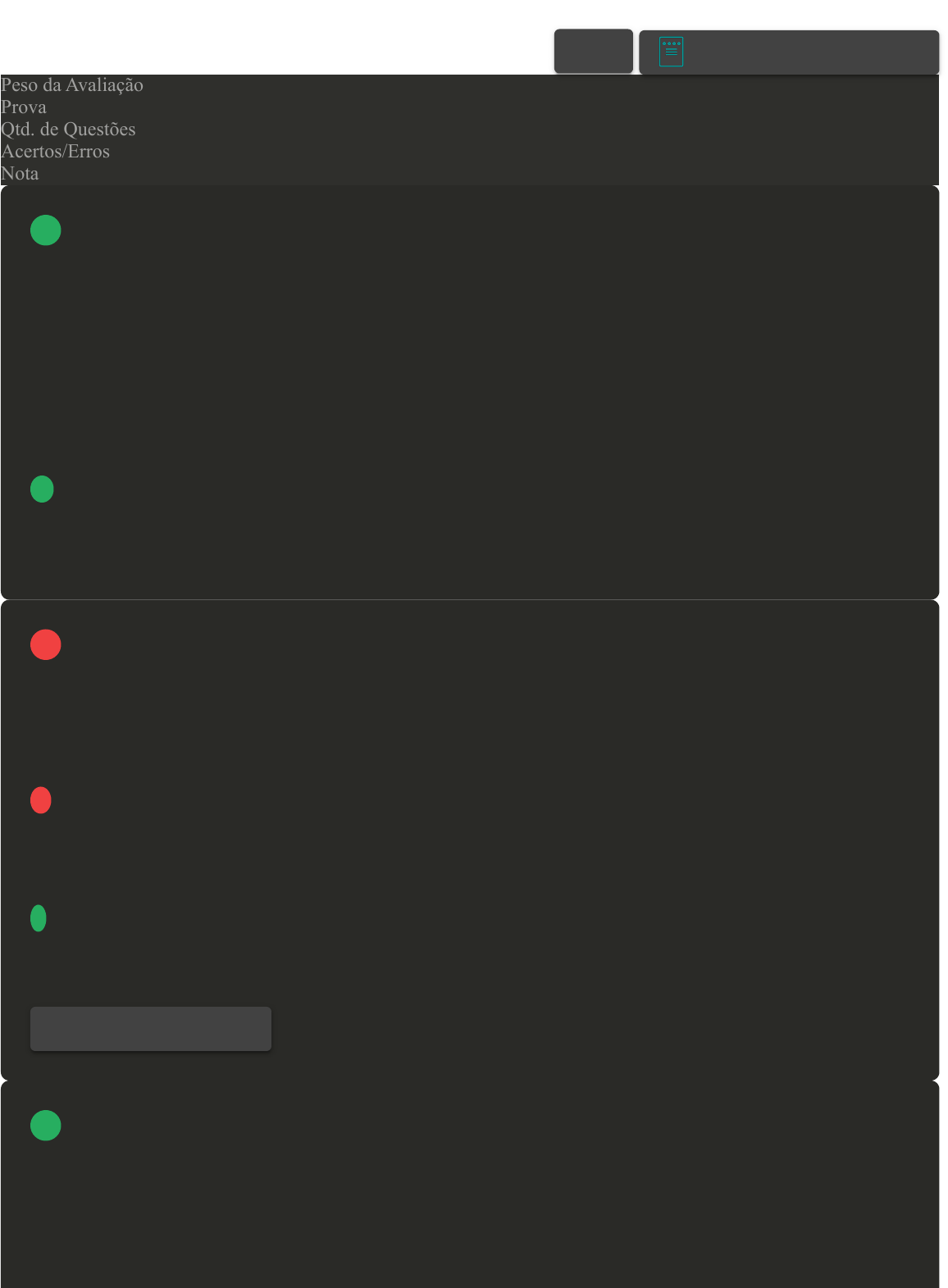 Prova Impressa GABARITO | Avaliação Final (Objetiva) - Individual (Cod.:987918) Peso da Avaliação 4,00 Prova 92299761 Qtd. de Questões 10 Acertos/Erros 9/1 Nota 9,00 Um orçamento organizacional deve ser preparado de forma a atender à organização em todas as fases de sua operacionalização. O orçamento é uma ferramenta de controle, que tem como função operacionalizar (ou quantificar) o planejamento tático e operacional.Sobre o conceito de orçamento, assinale a alternativa CORRETA: Fonte: ALMEIDA, R. G. de. Controladoria. Maringá: UniCesumar, 2019. FIGUEIREDO, S.; CAGGIANO, P. C. Controladoria. São Paulo: Atlas, 2017. A O cumprimento do orçamento é um compromisso/obrigação firmado pelo controller. B Um orçamento não deve ser consonante ao planejamento estratégico da organização. C O orçamento anual das organizações contempla medidas financeiras como vendas, despesas operacionais e margem bruta. D Margem operacional, lucro bruto e lucro líquido não compõem um orçamento. Há distinções entre a Controladoria e a Contabilidade. Segundo Padoveze (2012), a Controladoria é mais ampla que a Contabilidade, ou seja, a Controladoria tem entre suas funções a função contábil, o que significa que as funções da Controladoria se estendem para funções administrativas, econômicas, gestão de riscos, entre outras.Considerando o exposto e o tema funções da controladoria, assinale a alternativa CORRETA: Fonte: PADOVEZE, Clóvis Luís. Controladoria e Estratégia operacional: conceitos, estrutura, aplicação. 3. ed. São Paulo: Cengage Learning, 2012. A A controladoria na função tributária volta-se para analisar as opções de mercado (preços dos concorrentes) e gestão de riscos de mercado. B A controladoria na função de proteção e controle de ativos volta-se para análise das variações orçamentárias e análise dos riscos. C A controladoria na função de gestão de riscos volta-se para elaboração das políticas de controles de riscos e análise de indicadores para reduzir a exposição da organização aos riscos. D A controladoria na função de gestão de riscos volta-se para a elaboração das demonstrações contábeis e políticas contábeis. Uma ferramenta útil para as organizações realizarem uma análise ambiental interna e externa é a análise SWOT, que se refere à sigla de strengths (forças), weaknesses (fraquezas), opportunities (oportunidades) e threats (ameaças). Considerando o tema Análise do Ambiente Interno e Externo, analise as sentenças a seguir: I- Um exemplo de fator interno da organização e que afeta o desempenho são os efeitos das legislações emitidas pelo governo. II- Um exemplo de fator externo da organização e que afeta o desempenho são os efeitos das crises econômicas. VOLTAR A+ Alterar modo de visualização 1 2 Revisar Conteúdo do Livro 3 III- Um exemplo de fator externo da organização e que afeta o desempenho é a qualidade do produto.Assinale a alternativa CORRETA: Fonte: ALMEIDA, Rodrigo Gaspar. Controladoria. Maringá-PR.: Unicesumar, 2019. A As sentenças I e III estão corretas. B As sentenças I e II estão corretas. C Somente a sentença II está correta. D Somente a sentença I está correta. A organização Bem Experta Ltda. está realizando a sua avaliação de desempenho e, para tanto, selecionou quatro indicadores: saldo das contas caixa e banco; índice de satisfação do cliente; quantidade de produtos devolvidos; quantidade de reclamações. Após analisar cada um dos indicadores, os gestores da Bem Experta Ltda. decidirão se continuarão com as atividades da organização.Considerando os indicadores financeiros e não financeiros da empresa Bem Experta Ltda., assinale a alternativa CORRETA: A O indicador índice de satisfação dos clientes é um exemplo de indicador financeiro que a Bem Experta Ltda. pode utilizar para avaliar o seu desempenho. B O indicador quantidade de produtos devolvidos é um exemplo de indicador financeiro que a Bem Experta Ltda. pode utilizar para avaliar o seu desempenho. C O indicador quantidade de reclamações é um exemplo de indicador financeiro que a Bem Experta Ltda. pode utilizar para avaliar o seu desempenho. D O indicador saldo das contas caixa e banco é um exemplo de indicador financeiro que a Bem Experta Ltda. pode utilizar para avaliar o seu desempenho. A organização Competitiva Ltda. está realizando a sua avaliação de desempenho e, para isso, selecionou os seguintes indicadores financeiros e não financeiros: endividamento; índice de assiduidade dos funcionários; índice de rotatividade dos funcionários; liquidez geral; corrente e seca. Destarte, a organização Competitiva Ltda. possui um sistema robusto de feedback de cada um desses indicadores, visando à melhoria contínua. Sobre os indicadores financeiros, avalie as asserções a seguir e a relação proposta entre elas: I- O indicador endividamento é um exemplo de indicador financeiro que a Competitiva Ltda. utiliza para avaliar o seu desempenho. PORQUE II- Os indicadores liquidez geral, corrente e seca são exemplos de indicadores financeiros.Assinale a alternativa CORRETA: A As duas asserções são proposições verdadeiras, e a segunda é uma justificativa correta da primeira. B A primeira asserção é uma proposição falsa, e a segunda é uma proposição verdadeira. C A primeira asserção é uma proposição verdadeira, e a segunda é uma proposição falsa. D As duas asserções são proposições verdadeiras, mas a segunda não é uma justificativa correta da primeira. A sexta edição do Código das Melhores Práticas de Governança Corporativa, lançado em 2023 pelo Instituto Brasileiro de Governança Corporativa, estabeleceu cinco princípios básicos de Governança Corporativa: integridade, transparência, equidade, responsabilização (accountability) e sustentabilidade. Tais 4 5 6 princípios são norteadores das ações da organização. Fonte: https://conhec