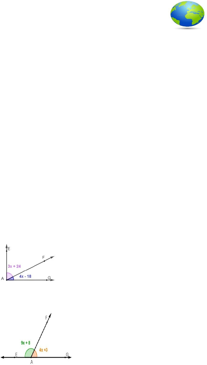 ESCOLARECANTODOSABER AV.SANTOSDUMONT,S/N–CENTRO– SATUBA CEP:57120-000TEL:98726-2468.E-MAIL:RECANTO2015@HOTMAIL.COM Atividade de Matemática 1. Sobre a classificação dos ângulos, marque a alternativa correta: A) Um ângulo é classificado como reto quando ele possui medida menor ou igual a 90º. B) Dois ângulos são complementares quando a soma deles é igual a 180º. C) Um ângulo é classificado como agudo quando a sua medida é menor do que 90º. D) Dois ângulos cuja soma é igual a 90º graus são conhecidos como ângulos obtusos. 2. Sabendo que o ângulo EÂG é reto, o valor do ângulo x é: 3. Sabendo que os ângulos são suplementares, e analisando a imagem a seguir, o valor de x é igual a: 4. Observe o triângulo ABC a seguir. As medidas, em graus, dos ângulos A, B e C são: 5. No paralelogramo abaixo, determine as medidas de x e y. image1.jpeg image2.png image3.png image4.png image5.png