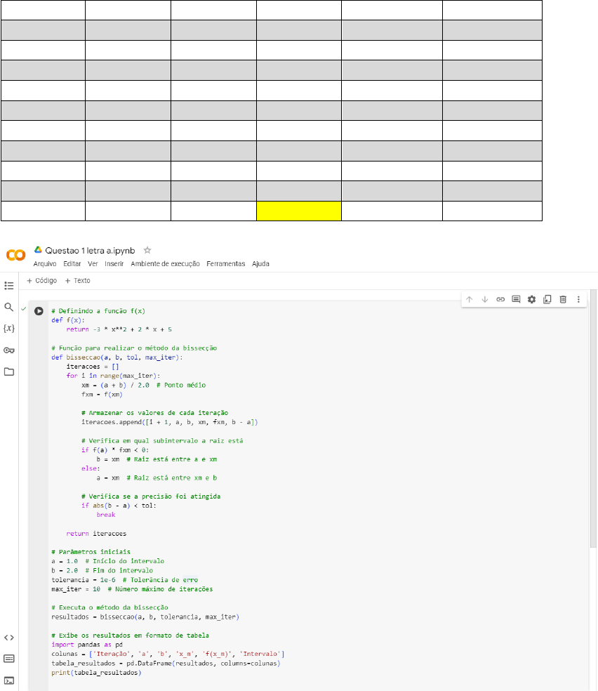 ATIVIDADE PRÁTICA Cálculo Numérico / Métodos Numéricos Aplicados João Martins da Silveira Neto RU 3112537 QUESTÃO 1: Raízes reais de Funções Determine a raiz da função 𝑓(𝑥)=−3𝑥2+2𝑥+5 contida no intervalo [1; 2]. Utilize os métodos: a. Método da Bissecção com 10 iterações. Iteração a b xm f(xm) Intervalo 1 1.000000 2.000000 1.500000 1.250000 1.000000 2 1.500000 2.000000 1.750000 -0.687500 0.500000 3 1.500000 1.750000 1.625000 0.328125 0.250000 4 1.625000 1.750000 1.687500 -0.167969 0.125000 5 1.625000 1.687500 1.656250 0.083008 0.062500 6 1.625250 1.687500 1.671875 -0.041748 0.031250 7 1.625250 1.671875 1.664062 0.020813 0.015625 8 1.664062 1.671875 1.667969 -0.010422 0.007812 9 1.664062 1.667969 1.666016 0.005207 0.003906 10 1.666016 1.667969 1.666992 -0.002604 0.001983 b. Método da Posição falsa com 10 iterações. Iteração a b c (aprox) f(a) f(b) f(c) 1 1.000000 2.000000 1.571429 4.000000e+00 -3.000000 7.346939e-01 2 1.574129 2.000000 1.655738 7.346939e-01 -3.000000 8.707337e-02 3 1.655738 2.000000 1.665448 8.707337e-02 -3.000000 9.745696e-03 4 1.665448 2.000000 1.666531 9.745696e-03 -3.000000 1.083735e-03 5 1.666531 2.000000 1.666652 1.083735e-03 -3.000000 1.204259e-04 6 1.666652 2.000000 1.666665 1.204259e-04 -3.000000 1.338079e-05 7 1.666665 2.000000 1.666666 1.338079e-05 -3.000000 1.486756e-06 8 1.666666 2.000000 1.666667 1.486759e-06 -3.000000 1.651952e-07 9 1.666667 2.000000 1.666667 1.651952e-07 -3.000000 1.835502e-08 10 1.666667 2.000000 1.666667 1.835502e-08 -3.000000 2.039448e-09 c. Método Iterativo Linear com 10 iterações. Iteração x0 (valor anterior) x1 (novo valor) Erro 1 1.000000 2.333333 1.333333 2 2.333333 3.222222 0.888889 3 3.222222 3.814815 0.598593 4 3.814815 4.209877 0.395062 5 4.209877 4.473251 0.263374 6 4.473251 4.648834 0.175583 7 4.648834 4.765889 0.117055 8 4.765889 4.843926 0.078037 9 4.843926 4.895951 0.052025 10 4.895951 4.930634 0.034683 d. Método de Newton-Raphson com 10 iterações. Iteração x f(x) f’(x) x (aprox) 1 1.500000 1.250000e+00 -7.000000 1.678571 2 1.678571 -9.566327e-02 -8.071429 1.666719 3 1.666719 -4.214158e-04 -8.000316 1.666667 4 1.666667 -8.323935e-09 -8.000000 1.666667 5 1.666667 8.881784e-16 -8.000000 1.666667 6 1.666667 8.881784e-16 -8.000000 1.666667 7 1.666667 8.881784e-16 -8.000000 1.666667 8 1.666667 8.881784e-16 -8.000000 1.666667 9 1.666667 8.881784e-16 -8.000000 1.666667 10 1.666667 8.881784e-16 -8.000000 1.666667 e. Determine a raiz real da função de forma algébrica, e determine o erro relativo dos valores estimados pelos diferentes métodos. Raiz real determinada: -1.0 Método Valor aproximado Erro relativo (%) Bissecção 1.666992 266.6992 Posição Falsa 1.666667 266.6667 Iterativo Linear 4.930634 593.0634 Newton-Raphson 1.666667 266.6667 1. Solução algébrica: Formula de Bhaskara onde a = -3, b = 2 e c = 5: resultado x= −2 ± 8 / −6 Assim temos duas soluções: x1 = −2+8 / −6 = 6 / -6 = −1 x2=−2−8 / −6= −10 / −6 = 5 / 3 ≈1.67 QUESTÃO 2: Integração Numérica Integre a função adotando 12 subintervalos. Utilize os métodos: a. Método dos Retângulos com a altura tomada pela esquerda. Iteração x_1 f(x_1) Área 1 0.00 1.000000 0.250000 2 0.25 1.321006 0.330252 3 0.50 1.824361 0.456090 4 0.75 2.587750 0.646938 5 1.00 3.718282 0.929570 6 1.25 5.362929 1.340732 7 1.50 7.722534 1.930633 8 1.75 11.070555 2.767639 9 2.00 15.778112 3.944528 10 2.25 22.347406 5.586851 11 2.50 31.456235 7.864059 12 2.75 44.017238 11.004309 ≈ 37,051601 b. Método dos Retângulos com a altura tomada pela direita. Iteração x_1 (direita) f(x_1) Área 1 0.25 1.321006 0.330252 2 0.50 1.824361 0.456090 3 0.75 2.587750 0.646938 4 1.00 3.718282 0.929570 5 1.25 5.362929 1.340732 6 1.50 7.722534 1.930633 7 1.75 11.070555 2.767639 8 2.00 15.778112 3.944528 9 2.25 22.347406 5.586851 10 2.50 31.456235 7.864059 11 2.75 44.017238 11.004309 12 3.00 61.256611 15.314153 ≈ 52.115754 c. Método dos Trapézios. Iteração x_1 f(x_1) 1 0.25 1.321006 2 0.50 1.824361 3 0.75 2.587750 4 1.00 3.718282 5 1.25 5.362929 6 1.50 7.722534 7 1.75 11.070555 8 2.00 15.778112 9 2.25 22.347406 10 2.50 31.456235 11 2.75 44.017238 12 3.00 61.256611 ≈ 44.58368 d. Regra 1/3 de Simpson. Iteração x_1 f(x_1) Multiplicador Contribuição 1 0.25 1.321006 4 5.284025 2 0.50 1.824361 2 3.648721 3 0.75 2.587750 4 10.351000 4 1.00 3.718282 2 7.436564 5 1.25 5.362929 4 21.451715 6 1.50 7.722534 2 15.445067 7 1.75 11.070555 4 44.282219 8 2.00 15.778112 2 31.556224 9 2.25 22.347406 4 89.389623 10 2.50 31.456235 2 62.912470 11 2.75 44.017238 4 176.068951 12 3.00 61.256611 2 122.513222 ≈ 54.38303 e. Regra 3/8 de Simpson. Iteração x_1 f(x_1) Multiplicador f(x_1) * Contribuição 1 0.25 1.321006 3 3.963019 2 0.50 1.824361 3 5.473082 3 0.75 2.587750 2 5.175500 4 1.00 3.718282 3 11.154845 5 1.25 5.362929 3 16.088786 6 1.50 7.722534 2 15.445067 7 1.75 11.070555 3 33.211664 8 2.00 15.778112 3 47.334337 9 2.25 22.347406 2 44.694811 10 2.50 31.456235 3 94.368705 11 2.75 44.017238 3 132.051713 12 3.00 61.256611 1 61.256611 ≈ 44.176701 QUESTÃO 3: Sistemas Lineares Determine a solução do Sistema Linear abaixo pelos métodos: a. Regra de Cramer. b. Gauss-Jacobi com 10 iterações. c. Gauss-Seidel com 10 iterações. QUESTÃO 4: Ajuste de curvas A taxa de fecundidade corresponde ao número de filhos vivos nascidos por mulher na idade reprodutiva. “Na verdade, desde a década de 70, 80, vem diminuindo a taxa de fecundidade no território brasileiro de forma significativa. Na década de 60, por exemplo, essa taxa estava em torno de seis filhos por mulher; na década de 80, eram quatro filhos por mulher; no ano de 2000, essa taxa de fecundidade era de 2,2 e, em 2020, uma média de 1,65 filhos. Nós temos um comportamento demográfico hoje, principalmente nesse quesito de fecundidade, muito semelhante à maior parte dos países ricos. Essa taxa de fecundidade vinha diminuindo já por uma série de fatores estruturais, mas n