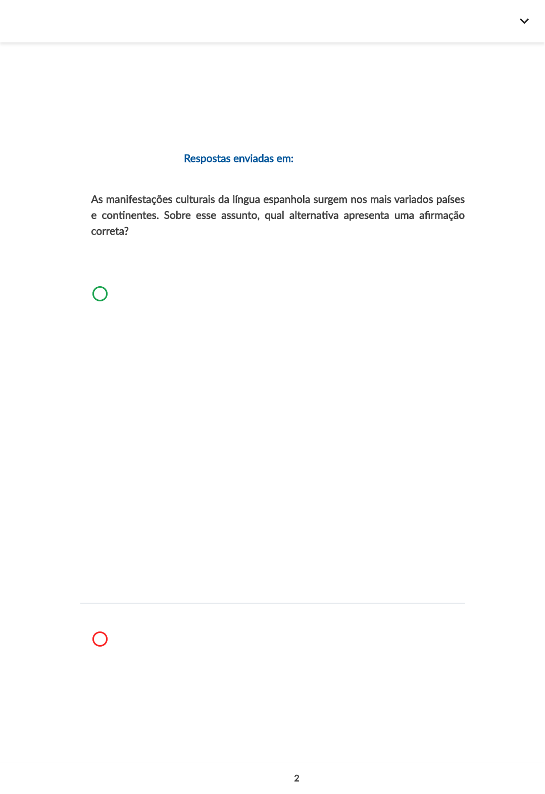 Exercícios Respostas enviadas em: 08/04/2024 22:07 2. As manifestações culturais da língua espanhola surgem nos mais variados países e con�nentes. Sobre esse assunto, qual alterna�va apresenta uma afirmação correta? Você acertou! A. Na Espanha, há muitas fes�vidades, como Las Fallas e San Fermín. Cada região da língua espanhola tem suas manifestações culturais, as quais iden�ficam a língua como elemento cultural. Na Espanha, há diversas fes�vidades, como Las Fallas e San Fermín. No Chile, encontramos muitas construções arquitetônicas semelhantes às europeias, embora tenha sido uma região conquistada tardiamente pelos espanhóis. Cuba revela uma mistura de influências, principalmente entre espanhóis e africanos. Porto Rico tem forte influência espanhola, mas, por par�cularidades da sua história, tem influência direta dos Estados Unidos, inclusive na oralidade. A diversidade entre as regiões se acentua quando se nota que há três con�nentes diferentes com hispanofalantes: Europa, América e África. Resposta incorreta. B. O Chile sofreu muita influência europeia, já que foi um dos primeiros países a ser conquistado pela Espanha. Cada região da língua espanhola tem suas manifestações culturais, as quais iden�ficam a língua como elemento cultural. Na Espanha, há diversas fes�vidades, como Las Fallas e San Fermín. No Chile, encontramos muitas construções arquitetônicas semelhantes às europeias, embora tenha sido uma região conquistada tardiamente 2 de 5 perguntas Anterior Próximo CS pelos espanhóis. Cuba revela uma mistura de influências, principalmente entre espanhóis e africanos. Porto Rico tem forte influência espanhola, mas, por par�cularidades da sua história, tem influência direta dos Estados Unidos, inclusive na oralidade. A diversidade entre as regiões se acentua quando se nota que há três con�nentes diferentes com hispanofalantes: Europa, América e África. Resposta incorreta. C. Cuba afastou-se de qualquer influência espanhola, visto que se dedicou ao Socialismo. Cada região da língua espanhola tem suas manifestações culturais, as quais iden�ficam a língua como elemento cultural. Na Espanha, há diversas fes�vidades, como Las Fallas e San Fermín. No Chile, encontramos muitas construções arquitetônicas semelhantes às europeias, embora tenha sido uma região conquistada tardiamente pelos espanhóis. Cuba revela uma mistura de influências, principalmente entre espanhóis e africanos. Porto Rico tem forte influência espanhola, mas, por par�cularidades da sua história, tem influência direta dos Estados Unidos, inclusive na oralidade. A diversidade entre as regiões se acentua quando se nota que há três con�nentes diferentes com hispanofalantes: Europa, América e África. Resposta incorreta. D. Os hispanohablantes vivem na Europa e na América La�na. Cada região da língua espanhola tem suas manifestações culturais, as quais iden�ficam a língua como elemento cultural. Na Espanha, há diversas fes�vidades, como Las Fallas e San Fermín. No Chile, encontramos muitas construções arquitetônicas semelhantes às europeias, embora tenha sido uma região conquistada tardiamente pelos espanhóis. Cuba revela uma mistura de influências, principalmente entre espanhóis e africanos. Porto Rico tem forte influência espanhola, mas, por par�cularidades da sua história, tem influência direta dos Estados Unidos, inclusive na oralidade. A diversidade entre as regiões se acentua quando se nota que há três con�nentes diferentes com hispanofalantes: Europa, América e África. 2 de 5 perguntas Anterior Próximo CS Resposta incorreta. E. Porto Rico é uma região em que a oralidade é muito semelhante à oralidade espanhola. Cada região da língua espanhola tem suas manifestações culturais, as quais iden�ficam a língua como elemento cultural. Na Espanha, há diversas fes�vidades, como Las Fallas e San Fermín. No Chile, encontramos muitas construções arquitetônicas semelhantes às europeias, embora tenha sido uma região conquistada tardiamente pelos espanhóis. Cuba revela uma mistura de influências, principalmente entre espanhóis e africanos. Porto Rico tem forte influência espanhola, mas, por par�cularidades da sua história, tem influência direta dos Estados Unidos, inclusive na oralidade. A diversidade entre as regiões se acentua quando se nota que há três con�nentes diferentes com hispanofalantes: Europa, América e África. Voltar Próximo 2 de 5 perguntas Anterior Próximo CS