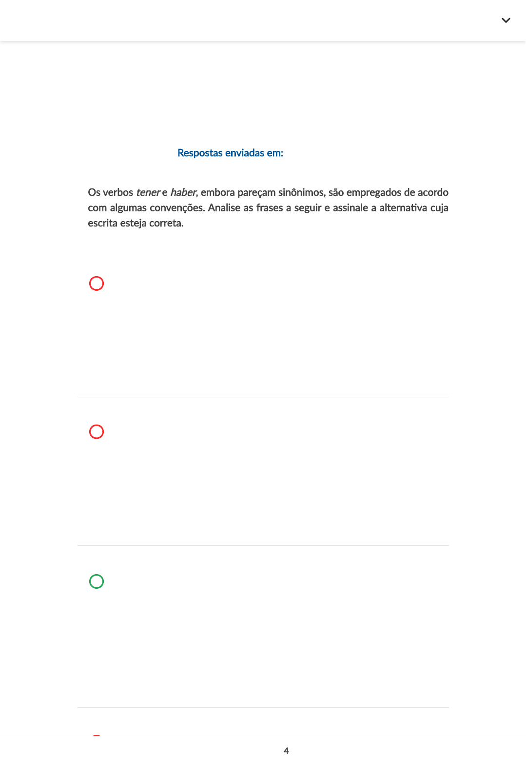 Exercícios Respostas enviadas em: 08/04/2024 22:07 4. Os verbos tener e haber, embora pareçam sinônimos, são empregados de acordo com algumas convenções. Analise as frases a seguir e assinale a alterna�va cuja escrita esteja correta. Resposta incorreta. A. Tienen 10 alumnos en la sala. O verbo tener indica posse e haber indica existência. Como na frase a intenção é indicar existência, deve-se usar haber. Este é um verbo impessoal, que deve ser flexionado no singular. Resposta incorreta. B. Tiene 10 alumnos en la sala. O verbo tener indica posse e haber indica existência. Como na frase a intenção é indicar existência, deve-se usar haber. Este é um verbo impessoal, que deve ser flexionado no singular. Você acertou! C. Hay 10 alumnos en la sala. O verbo tener indica posse e haber indica existência. Como na frase a intenção é indicar existência, deve-se usar haber. Este é um verbo impessoal, que deve ser flexionado no singular. Resposta incorreta. D. Han 10 alumnos en la sala. 4 de 5 perguntas Anterior Próximo CS O verbo tener indica posse e haber indica existência. Como na frase a intenção é indicar existência, deve-se usar haber. Este é um verbo impessoal, que deve ser flexionado no singular. Resposta incorreta. E. Habían 10 alumnos en la sala. O verbo tener indica posse e haber indica existência. Como na frase a intenção é indicar existência, deve-se usar haber. Este é um verbo impessoal, que deve ser flexionado no singular. Voltar Próximo 4 de 5 perguntas Anterior Próximo CS