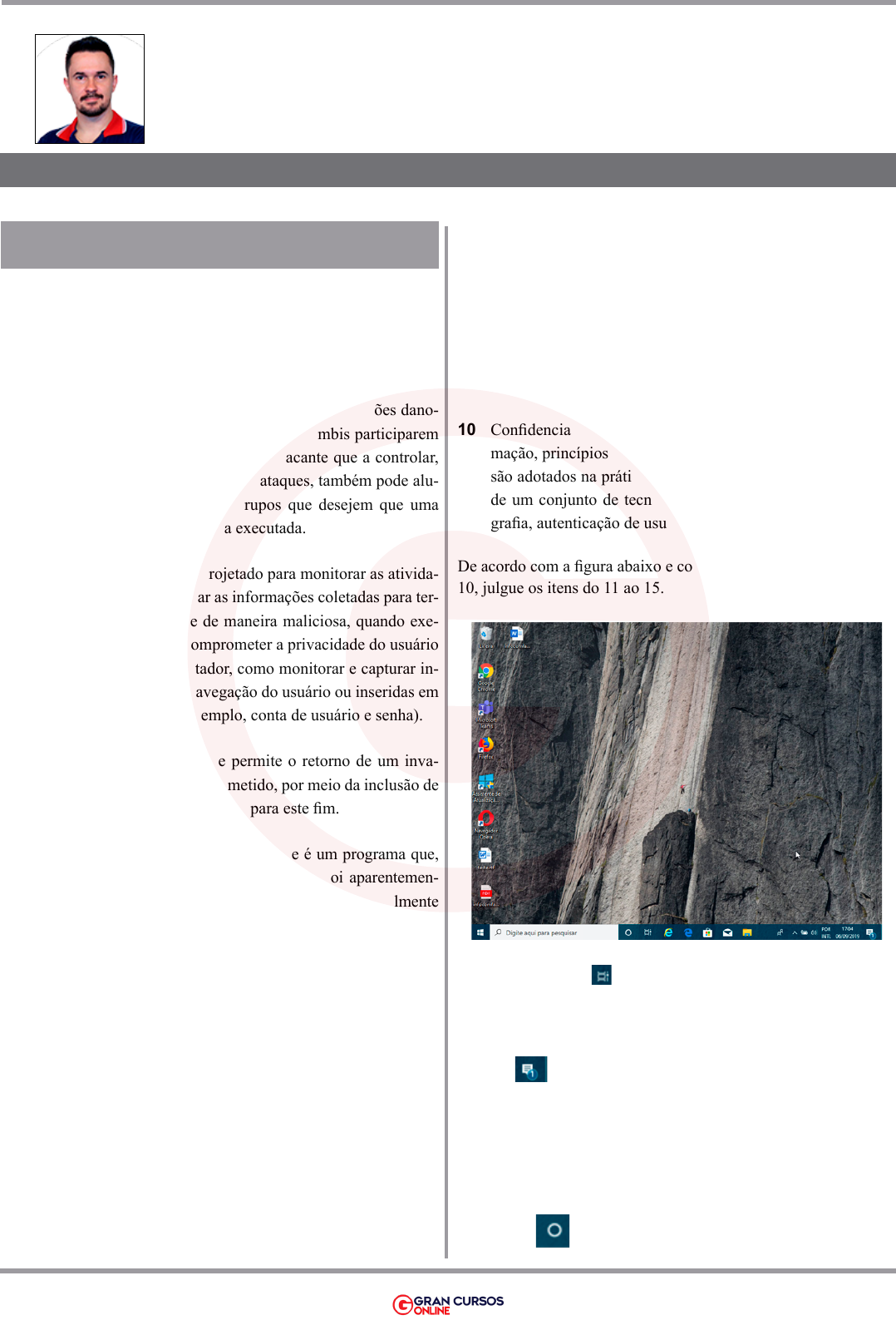 SIMULADO INSS SIMULADO INSS – INFORMÁTICABaseado no formato de prova aplicado pela banca Cespe Fabrício Melo Graduado em Sistemas de Informação, especialista em concursos públicos, professor em diversos cursos prepara- tórios de Brasília e de São Paulo desde 2005. Com mais de 70 cursos na área de Informática, suas aulas se desta- cam pela excelente didática voltada para conhecimentos práticos aplicados às questões mais recentes de provas de concursos públicos. INFORMÁTICA 1 Os worms, ao se propagarem, inserem cópias de seu próprio código em outros programas, enquanto os vírus se propagam pelas redes, explorando, geralmente, alguma vulnerabilidade de outros softwares. 2 Botnet é uma rede formada por centenas ou milhares de com- putadores zumbis e que permite potencializar as ações dano- sas executadas pelos bots. Quanto mais zumbis participarem da botnet, mais potente ela será. O atacante que a controlar, além de usá-la para seus próprios ataques, também pode alu- gá-la para outras pessoas ou grupos que desejem que uma ação maliciosa específica seja executada. 3 Spyware é um programa projetado para monitorar as ativida- des de um sistema e enviar as informações coletadas para ter- ceiros. É usado somente de maneira maliciosa, quando exe- cuta ações que podem comprometer a privacidade do usuário e a segurança do computador, como monitorar e capturar in- formações referentes à navegação do usuário ou inseridas em outros programas (por exemplo, conta de usuário e senha). 4 Adware é um programa que permite o retorno de um inva- sor a um computador comprometido, por meio da inclusão de serviços criados ou modificados para este fim. 5 Cavalo de troia, Trojan ou Trojan-horse é um programa que, além de executar as funções para as quais foi aparentemen- te projetado, também executa outras funções normalmente maliciosas e sem o conhecimento do usuário. Um exemplo de Trojan é o Trojan Clicker, que redireciona a navegação do usuário para sites específicos, com o objetivo de aumentar a quantidade de acessos a esses sites ou apresentar propagandas. 6 Política de Uso Aceitável (PUA), também chamada de "Termo de Uso" ou "Termo de Serviço", define as regras de uso dos recursos computacionais, os direitos e as responsabilidades de quem os utiliza e as situações que são consideradas abusivas. 7 Na Assinatura Digital, a chave privada do remetente de uma mensagem eletrônica é utilizada para assinar a mensagem. 8 Em um processo de criptografia de chave pública, uma mensa- gem enviada do Gran Online para Fabrício é criptografada e de- criptografada, respectivamente, pela chave pública do Gran On- line que o Fabrício tem conhecimento e pela chave privada do Gran Online que somente ele (Gran Online) tem conhecimento. 9 Através de um Firewall, é possível proteger uma rede tanto de ataques de crackers quanto de ataques de bots. 10 Confidencialidade, integridade, e disponibilidade da infor- mação, princípios fundamentais de segurança da informação, são adotados na prática, nos ambientes tecnológicos, a partir de um conjunto de tecnologias, como, por exemplo, cripto- grafia, autenticação de usuários e o uso de nobreaks. De acordo com a figura abaixo e conhecimentos sobre o Windows 10, julgue os itens do 11 ao 15. 11 Através do botão , o usuário tem aceso ao recurso “Linha do Tem- po”, que permite a visualização dos últimos sites e arquivos acessados. 12 É correto inferir que a Área de Notificação, acessada pelo bo- tão , possui uma notificação para ser exibida ao usuário. 13 O Windows 10 possui uma Assistente Digital, Cortana, que foi desenvolvida para ajudar você a realizar tarefas. Imedia- tamente pronta para oferecer respostas e realizar tarefas bá- sicas, a Cortana aprende com o tempo e torna-se mais útil a cada dia. Para ter acesso a essa assistente, basta clicar no botão . SIMULADO INSS – INFORMÁTICABaseado no formato de prova aplicado pela banca Cespe 14 O novo navegador da Microsoft, Edge, permite uma navega- ção mais rápida, intuitiva e responsiva. É uma grande apos- ta da Microsoft no mercado dos browsers. O Edge, pode ser acessado através do botão . 15 Através do ícone , tem-se acesso à loja de aplicativos do Google Play, onde é possível fazer o download de softwares de maneira gratuita ou paga, dependendo do software escolhido. De acordo com a figura abaixo e conhecimentos sobre o Windows 10, julgue os itens 16 e 17. 16 Através da categoria “Contas de Usuário”, pode-se ter acesso à criação de uma conta Quiosque. Um dispositivo no modo de Quiosque executa um aplicativo especificado sem acesso a outras funções, menus ou configurações do dispositivo. 17 Na categoria “Rede e Internet”, tem-se o ícone de acesso ao Firewall do Windows, que ajuda a impedir que hackers ou softwares mal-intencionados obtenham acesso ao PC através da Internet ou de uma rede. 18 Através da combinação de teclas WINDOWS + I, o usuário tem acesso às Configurações do Windows, onde é possível vincular um smartphone para a realização de uma sincronização. Com o smartphone sincronizado, é possível acessar páginas usando o Edge no dispositivo móvel e continuar no computador. 19 O editor de textos nativo do Windows 10, MS-Word, tem compatibilidade com arquivos do LibreOffice Writer, .odt. 20 O Windows 10 gerencia discos no formato FAT 32 e tem como sistema de arquivos nativo o NTFS. Sobre conceitos e tecnologias relacionados a internet, intranet, extranet e navegadores, julgue os itens do 21 ao 27. 21 O OSI é um conjunto de protocolos de comunicação entre compu- tadores em rede. Seu nome vem de dois protocolos: o TCP e o IP. 22 A computação em nuvem é um modelo para habilitar o acesso por rede ubíquo, conveniente e sob demanda a um conjunto compartilhado de recursos de computação (como redes, servi- dores, armazenamentos, aplicações e serviços) que possam ser rapidam