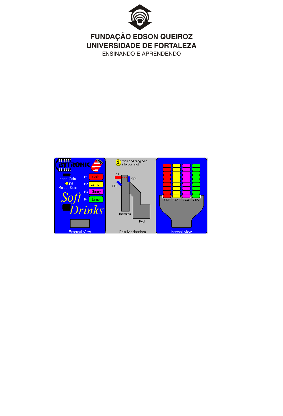 1 Curso: Engenharia de Controle e Automação Disciplina: Instrumentação de Controle - 2010.2 Exercícios de Simulação de Programação em Ladder Utilizando o LadSim 1. Máquina de refrigerantes O dinheiro é introduzido no entalhe da moeda. Uma vez que a moeda é detectada, se uma tecla da bebida for pressionada, a bebida correta será liberada e a moeda mantida, ou se a tecla da rejeição for pressionada, a moeda será devolvida e nenhuma bebida será liberada. As entradas são: IP0 - sensor da moeda IP1 - refrigerante de coca cola IP2 - refrigerante de limão IP3 - refrigerante de cereja IP4 - refrigerante de lima IP5 - tecla da rejeição As saídas são: OP0 - atuador de moeda aceita OP1 - atuador de moeda rejeitada OP2 - liberação do refrigerante de coca cola OP3 - liberação do refrigerante de limão OP4 - liberação do refrigerante de cereja OP5 - liberação do refrigerante de lima 2 2. Estacionamento 1.Quando um carro é detectado no sensor da entrada, a barreira deve abrir e permitir que o carro entre. 2.Quando um carro é detectado no sensor de saída, a barreira deve abrir e permitir que o carro saia. 3.Quando o estacionamento de carro está cheio, a luz “cheio” deve estar acesa 4.Quando o estacionamento de carro está vazio, a luz “vazio” deve estar acesa 5.Quando há vagas no estacionamento de carro, a luz de vagas deve estar acesa. 6.O número de vaga deve ser indicado em todas as vezes através do acumulador do contador. Obs. As barreiras devem levantar suficiente para que os carros entrem ou retirem no parque de carro. As entradas e as saídas são: IP0 sensor de entrada IP1 sensor de saída OP0 lâmpada de estacionamento cheio OP1 lâmpada de vagas no estacionamento OP2 lâmpada de estacionamento vazio OP3 barreira de entrada OP4 barreira de saída 3 3. Planta de seleção de caixas Uma caixa é transportada em uma esteira. Quando alcança a mesa giratória, ela deve girar para a esquerda ou direita dependendo do tamanho da caixa. O atuador correspondente deve empurrar a caixa na esteira correta. As entradas e as saídas são: IP0 sensor do comprimento da caixa IP1 sensor do comprimento da caixa IP2 sensor de rotação da mesa giratória IP3 sensor da esteira horizontal IP4 sensor da esteira vertical IP5 botão de partida OP0 atuador da esteira vertical OP1 atuador da esteira horizontal OP2 motor da esteira comum OP3 motor da esteira vertical OP4 motor da esteira horizontal OP5 rotação da mesa a direita OP6 rotação da mesa a esquerda 4 4. Planta de Engarrafamento A esteira 1 funciona continuamente onde é alimentado uma garrafa de cada vez. Cada garrafa desloca-se ao longo da esteira e é direcionado pelas guias para a posição onde é enchida e tampada. A garrafa então continua ao longo do transporte na esteira 2, fase em que o rótulo é colocado na garrafa, após essa etapa a garrafa espera então na extremidade do transporte até que haja 3 garrafas no total. Estas são empurradas então no empilhador. Isto é repetido outras 2 vezes de modo que haja 9 garrafas no empilhador. O empilhador deve então descer e as garrafas seguem na esteira 3. As entradas e as saídas são: IP0 sensor de nivel IP1 sensor de detecção da garrafa IP2 sensor de acionamento do rotulador IP3 sensor do contador IP4 sensor de detecção da tampa IP5 interruptor de limite do pistão do empilhador OP0 atuador de parada da garrafa OP1 atuador de datação da tampa OP2 atuador de empilhamento OP3 atuador de colocação da tampa OP4 atuador da válvula de enchimento OP5 esteira 1 OP6 esteira 2 OP7 empilhador da esteira 3