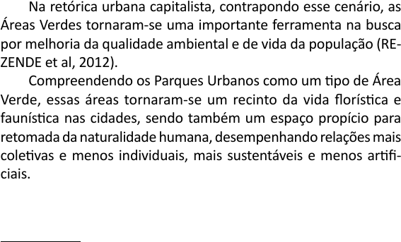 339 ANÁLISE CONCEITUAL E HISTÓRICA DOS PARQUES URBANOS: IDENTIFICAÇÃO DE CENÁRIOS APTOS EM RONDONÓPOLIS-MT Werlen Gonçalves Raasch1 Antonia Marilia Medeiros Nardes2 INTRODUÇÃO O espaço geográfico urbano ou rural está sujeito as relações sociais e as da natureza. Atuando de forma sistemática ou não, são as ações derivadas desse sistema, que operam na produção do espaço geográfico. Considerando a sinopse histórica dos problemas socioam- bientais que emergiram, sobretudo pós-revolução industrial, no ápice do sistema, a luta de ambientalistas, Instituições e os vários setores da sociedade civil organizada, garantiram via jurisprudên- cia, ferramentas de proteção a biodiversidade global, bem como a sensibilização por ações mais sadias entre o homem e a natureza, almejando qualidade ambiental e bem-estar social. Na retórica urbana capitalista, contrapondo esse cenário, as Áreas Verdes tornaram-se uma importante ferramenta na busca por melhoria da qualidade ambiental e de vida da população (RE- ZENDE et al, 2012). Compreendendo os Parques Urbanos como um tipo de Área Verde, essas áreas tornaram-se um recinto da vida florística e faunística nas cidades, sendo também um espaço propício para retomada da naturalidade humana, desempenhando relações mais coletivas e menos individuais, mais sustentáveis e menos artifi- ciais. Nesse sentido, ao compreender a evolução dos Parque nos processos histórico, social, ambiental e urbano e a identificação dos cenários aptos à implantação de Parques em Rondonópolis a 1 Graduando em Licenciatura Plena em Geografia/CUR/UFMT. Membro do Grupo de Pesquisa Planejamento, Ambiente e Educação Ambiental - PLANEA. Bolsista PIBIC. 2 Prof. Drª. Associada do Depto de Geografia CUR/UFMT. Líder do Grupo de Pesquisa- PLANEA. jefer Realce jefer Realce jefer Realce 340 proposta científica é de grande importância para as comunidades científica e em geral. Trazendo essa temática para a área de estudo, a cidade de Rondonópolis não dispõe de nenhuma Área Verde com perfil de Parque Urbano apto ao uso, por sua vez, oito Parques já foram criados na cidade a partir de 2005, mas não foram implantados. Na busca por respostas, a especulação imobiliária é um dos fatores a ser considerado. E a ausência de políticas públicas efetivas que visam a implementação de áreas com esse perfil também corrobora com este cenário atual. No entanto, na mancha urbana de Rondonópolis existem áreas que possuem fragmentos de vegetação e cursos d’água, contendo atributos ambientais relevantes para efetivar o lazer, o bem-estar social e desenvolver a estética paisagística urbana, configurando-se como cenários aptos a implantação de Parques Urbanos, mesmo que com menores proporções territoriais. O Parque Urbano é um espaço necessário para a efetivação da unidade urbana com as amenidades ambientais, correlacionando a (Re) produção social e os elementos bióticos e abióticos em um ambiente equilibrado. Parques Urbanos: Análise Conceitual As obras literárias acerca do conceito de Parque Urbano, con- sideram o Parque como um tipo de Área Verde, que foram englo- badas pela definição maior de Espaços Livres. Nos estudos de Ferreira (2005), Loboda & Angelis (2005), Benini & Martin (2014) e Bargos & Matias (2011), todos fazem referência a definição presente no Artigo de Lima et al. (1994), intitulado de “Problemas de Utilização na Conceituação de Termos como Espaços Livres, Áreas Verdes e Correlatos”, publicado em 1994 nos Anais do II Congresso Brasileiro de Arborização Urbana, em São Luís/MA. O artigo conclui que Espaço Livre é mais abrangente e este integra os demais conceitos que visam definir os espaços constru- ídos em áreas urbanas que se tenha a presença do verde e visa, sobretudo o lazer, o estético e a qualidade ambiental. Contudo “tal conceito tem que ser integrado ao uso do espaço, sua escala jefer Realce jefer Realce 341 e função, devendo, esta última, satisfazer três objetivos principais: ecológicos, estético e de lazer (LIMA et al., 1994)”. Com base nos conceitos de Lima et al (1994), elaboramos um organograma (Figura 1), para melhor contextualizar essa definição. Espaços Livres É uma Área Verde, com função ecológica, estética e de lazer, entretanto com uma extensão maior que as chamadas Praças e Jardins Públicos. Como Área Verde, tem a função principal de lazer. Uma praça, inclusive, pode não ser uma Área Verde, quando não tem vegetação e é impermeabilizada (caso das praças da Sé e Roosevelt, na cidade de São Paulo); no caso de ter vegetação é considerada Jardim. Parque Urbano ÁREAS VERDES Onde há o predomínio de vegetação arbórea; engloba as praças, os jardins públicos e os parques urbanos. Os canteiros centrais e trevos também de vias públicas, que tem apenas funções estética e ecológica, devem conceituar- se como Área Verde. Entretanto, as árvores que acompanham o leito das vias públicas, não devem ser consideradas como tal. Arborização Urbana Praça Diz respeito aos elementos vegetais de porte arbóreo, dentro da urbe, tais como árvores e outras. Nesse enfoque, as árvores plantadas em calçadas, fazem parte da Arborização Urbana, porém, não integram o Sistema de Áreas Verdes. Figura 1: Organograma adaptado do conceito de LIMA et al. (1994) Fonte: RAASCH (2017) jefer Realce jefer Realce 342 Nessa perspectiva, a Resolução N° 369/2009 da CONAMA, Art. 8, § 1°, considera Área Verde urbana “[...] o espaço de domínio público que desempenhe função ecológica, paisagística e recre- ativa, propiciando a melhoria da qualidade estética, funcional e ambiental da cidade, sendo dotado de vegetação e espaços livres de impermeabilização”. Em suma, áreas que possuem cobertura vegetal arbórea, arbustiva e/ou gramíneas, que venha contribuir para a qualidade de vida e o equilíbrio ambiental da 