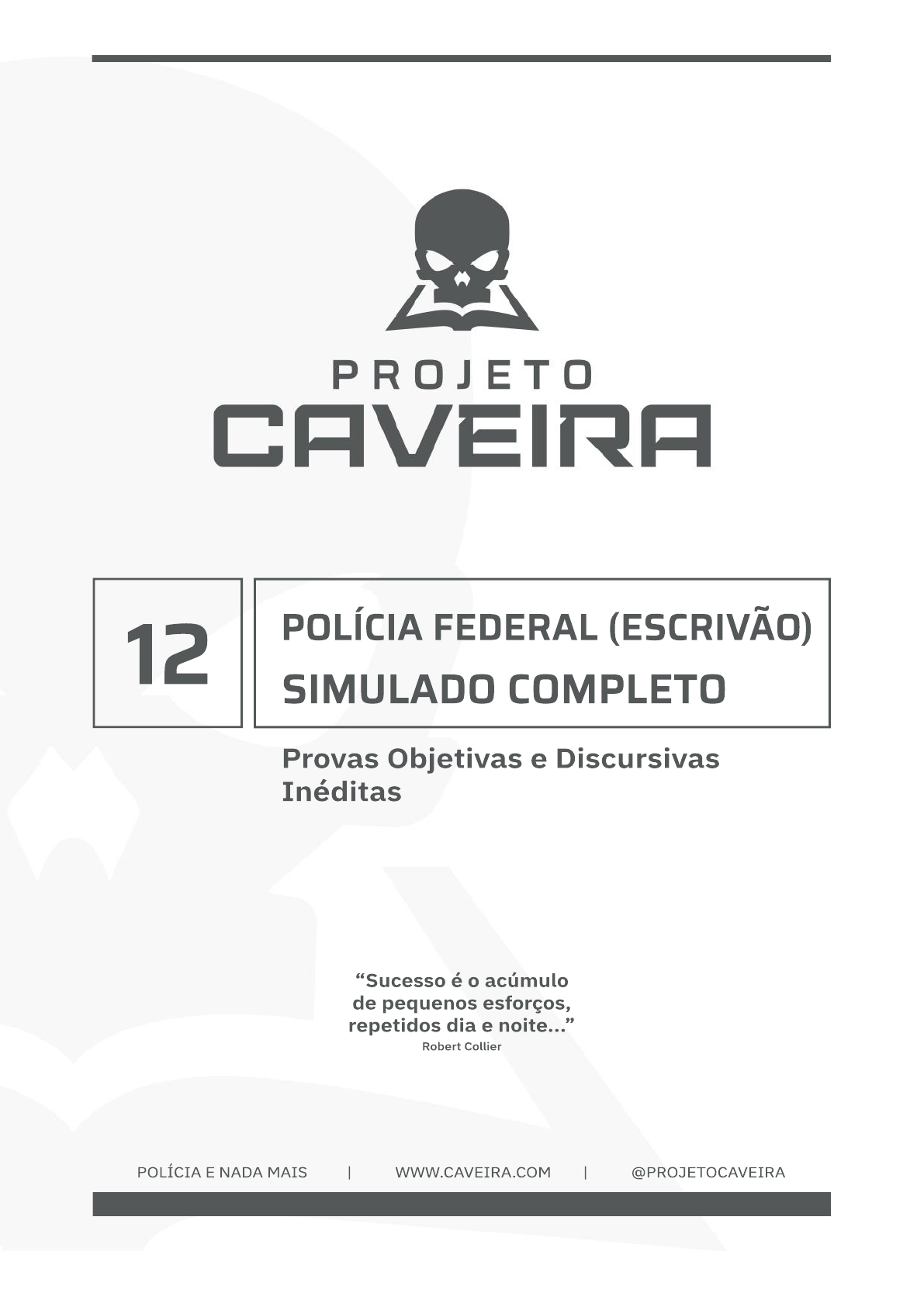 POLÍCIA FEDERAL (ESCRIVÃO)12 SIMULADO COMPLETO Provas Objetivas e Discursivas Inéditas POLÍCIA E NADA MAIS | WWW.CAVEIRA.COM | @PROJETOCAVEIRA “Sucesso é o acúmulo de pequenos esforços, repetidos dia e noite...” Robert Collier 584884.26/09/2023 021.135.745-60.90389 PROJETO CAVEIRA 12º SIMULADO - PF 2023 1 BLOCO I Língua Portuguesa: Já tinha descoberto toda a aventura antes de ela me dizer. Entretanto, eu errei feio sobre como seria essa aventura. Apesar de ser chamado de “vidente”, dessa vez eu cometi um erro. Acho que já estou puído. Como professor, sou muito leitor. Ler é o que me faz “prever” as coisas. A leitura abrange isso: conhecimento. E assim podemos ser chamados de “videntes” e na verdade só temos o conhecimento. Às vezes, pergunto-me se tudo isso não passa de ilusão. Mas, na verdade, sei que não. Também me pergunto: “será que a leitura mudará?” É como uma breve história, que conheci quando pequeno. A leitura é um cantinho mágico. É o meu cômodo favorito. De lá eu não sairei. De lá eu gosto. Contarei aqui nesse trecho. Se você ler muito, vai melhorar o cérebro. Simples, mas é bem isso. Faça o que eu mando. Leia isso. Estude aquilo. Explore isso. Entenda aquilo. Essas ordens, podem parecer bizarras, mas foi o que me mudou. Sim, foi essa a história. Não fez sentido pra você? Simples: a dúvida é o preço da pureza. Vá ler! 01. O autor do texto perdeu os poderes de vidente dele com o tempo. 02. Infere-se do texto que a leitura faz a pessoa ter conhecimento sobre coisas, podendo imaginar e até prever, em alguns casos, o que acontecerá. 03. No penúltimo parágrafo temos um exemplo de tipologia descritiva. 04. O vocábulo “erro”, primeiro parágrafo, está como sinônimo de “burilo”. 05. No primeiro período do texto, o termo “tinha descoberto” pode ser substituído corretamente por “descobrira”. 06. O vocábulo “mudará”, presente no texto, é acentuado por ser uma oxítona. 07. O quarto parágrafo é composto por períodos simples e compostos. 08. A palavra “cantinho” recebe o sufixo “inho” como tom de ironia utilizado pelo autor. 09. Em “A leitura é um cantinho mágico.”, o trecho está no sentido denotativo de linguagem. 10. O vocábulo “me”, primeiro período do terceiro parágrafo, feitos os devidos ajustes, pode ficar posposto ao verbo, caso a vírgula seja removida, sem prejuízo semântico. 11. O termo “Entretanto”, no primeiro parágrafo, passa a ideia de adversidade. 12. O penúltimo período do primeiro parágrafo passa a ideia de explicação. 13. O vocábulo “SE”, em “Se você ler muito, vai melhorar o cérebro.”, pode ser substituído por “Caso”, desde que o verbo “ler” seja modificado para “leia”. 14. O vocábulo “conhecimento”, no segundo parágrafo, é complemento direto do verbo “ter”. 15. Caso fosse inserido um dos “porquês”, na lacuna gerada para esta questão, em “Também me pergunto: ‘_____será que a leitura mudará?’”, o correto seria o uso do “Por que”. 16. O verbo destacado em “Acho que já estou puído.” passa a ideia de cansado. Julgue os próximos de maneira que se mantenham os sentidos e os aspectos gramaticais da reescrita do fragmento do texto Como professor, sou muito leitor. Ler é o que me faz “prever” as coisas. 17. Como professor, tenho que ler muito. Ler é o que me faz “prever” as cousas. 18. Como professor, sou muito leitor. Ler o que me faz “prever” as coisas é bom. Julgue os próximos itens baseado no “Texto do documento” exposto no Manual de Redação da Presidência da República. 19. Nos casos em que não seja usado para encaminhamento de documentos, o expediente deve conter a seguinte estrutura: introdução, desenvolvimento e conclusão. 20. O texto do documento oficial deve seguir a seguinte padronização de estrutura quando forem usados para encaminhamento de documentos: introdução e desenvolvimento. 21. O alinhamento deve ser à direita. Avalie os próximos itens no que tange ao assunto “Fechos para comunicações” exposto no Manual de Redação da Presidência da República. 22. O fecho das comunicações oficiais objetiva, além da finalidade óbvia de arrematar o texto, saudar o destinatário. 23. O alinhamento deve ser à margem esquerda da página. 24. O fecho para autoridades de hierarquia superior à do remetente, inclusive o Presidente da República, deve ser o: Atenciosamente. 584884.26/09/2023 021.135.745-60.90389 PROJETO CAVEIRA 12º SIMULADO - PF 2023 2 Direito Administrativo: Referente aos poderes administrativos, julgue o item abaixo. 25. É consenso nos Tribunais Superiores a plena delegação do poder de polícia, em todas as suas fases, às entidades de direito privado da administração indireta. Nos termos da Lei nº 8.112/90, que versa sobre o Estatuto dos servidores públicos civis da União, julgue o item a seguir. 26. Ao servidor estudante que mudar de sede no interesse da administração é assegurada, na localidade da nova residência ou na mais próxima, matrícula em instituição de ensino congênere, em qualquer época, independentemente de vaga. Consoante o previsto na Lei de Licitações - Lei nº 8.666/93, julgue o item subsequente. 27. Modalidade obrigatória para a venda de móveis que não servem mais para a administração é o leilão. Direito Constitucional: Acerca dos direitos e garantias fundamentais, julgue os próximos itens. 28. O direito de propriedade é uma norma de eficácia plena. 29. O autor da ação popular fica isento de custas e de ônus de sucumbência, salvo comprovada má-fé. Acerca da Segurança Pública, julgue o item subsequente. 30. Para o Supremo Tribunal Federal, as guardas municipais fazem parte do sistema de segurança pública. Direito Penal e Processual Penal: Tendo por base a parte especial do Código Penal, julgue os próximos itens. 31. O delito de importunação sexual é considerado crime h