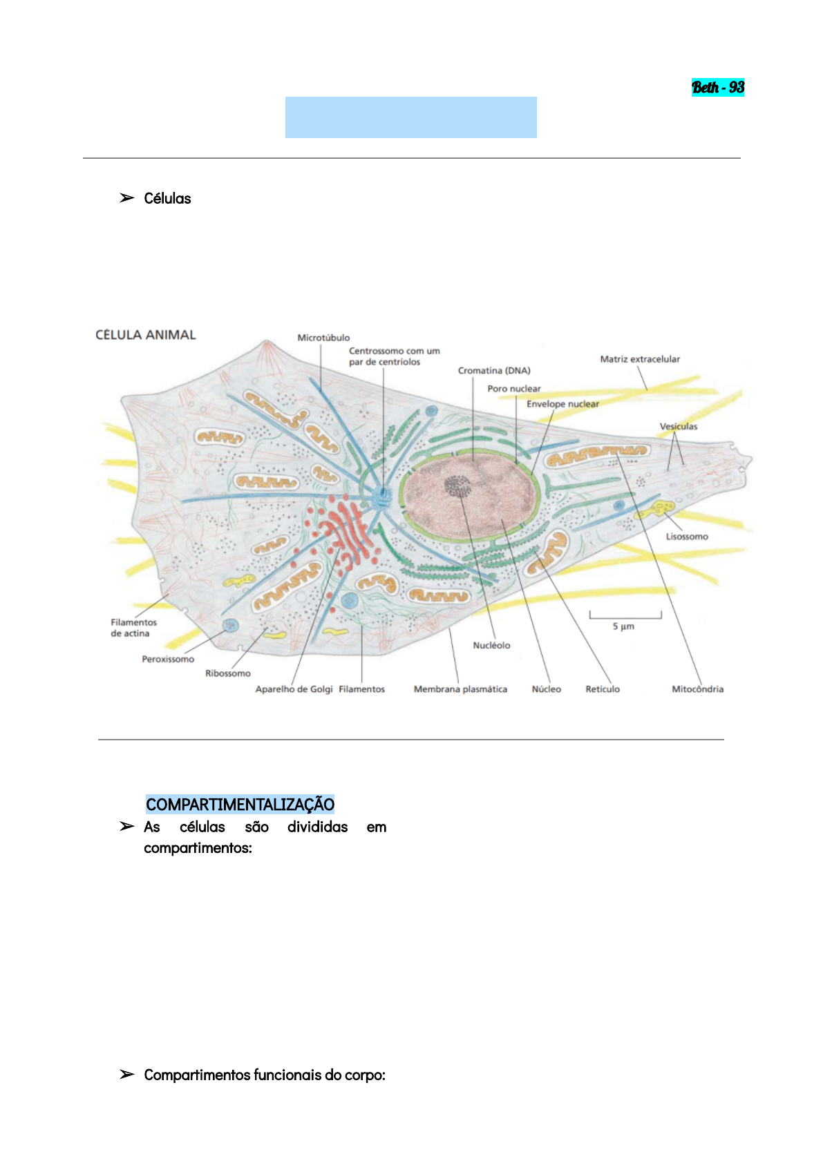 Bet� - 93 Organização celular básica ➢ Células São as unidades funcionais dos organismos vivos, e uma célula individual pode executar todos os processos da vida. Os organismos cujas células têm um núcleo são chamados de eucariotos (a partir das palavras gregas eu, significando "verdadeiro" ou “real”, e karyon, uma “parte central” ou “núcleo”). Os organismos cujas células não têm um núcleo são chamados de procariotos (de pro, significando “antes”). COMPARTIMENTALIZAÇÃO ➢ As células são divididas em compartimentos: Os compartimentos apresentam vantagens e desvantagens para os organismos. Pelo lado vantajoso, os compartimentos separam processos bioquímicos que poderiam, caso contrário, entrar em conflito um com o outro. A desvantagem dos compartimentos é que as barreiras entre eles podem dificultar o transporte dos materiais necessários de um compartimento a outro. ➢ Compartimentos funcionais do corpo: O corpo humano é um compartimento complexo, separado do mundo externo por camadas celulares. Anatomicamente, o corpo é dividido em três principais cavidades: a cavidade craniana (comumente chamada de crânio), a cavidade torácica (chamada de tórax) e a cavidade abdominopélvica. Além das cavidades do corpo, há vários compartimentos anatômicos distintos preenchidos com líquido. Os vasos sanguíneos, contendo o sangue, e o coração formam um compartimento no sistema circulatório. Os nossos olhos são esferas ocas cheias de líquido subdivididas em dois compartimentos, preenchidos com os humores aquoso e vítreo. O encéfalo e a medula espinal são cercados por um compartimento de líquido especial, denominado líquido cerebrospinal (LCS). Os sacos membranosos que circundam os pulmões (sacos pleurais) e o coração (pericárdio) também contêm pequenos volumes de líquido. ➢ Lúmen: O interior de qualquer órgão oco é chamado de lúmen. Um lúmen pode ser total ou parcialmente preenchido com ar ou líquido. Por exemplo, os lumens dos vasos sanguíneos são preenchidos com o líquido que chamamos de sangue. ➢ Funcionalmente, o corpo tem três compartimentos líquidos Se pensarmos em todas as células do corpo como uma unidade, podemos dividir o corpo em dois compartimentos: ○ (1) o líquido extracelular (LEC), fora das células; ○ (2) o líquido intracelular (LIC), dentro das células; ○ Membrana celular, parede que divide o LEC e o LIC. O LEC subdivide-se ainda em - Plasma, a porção fluida do sangue; - Líquido intersticial (“estar entre”), que circunda a maioria das células do corpo. MEMBRANAS BIOLÓGICAS (Membrana plasmática, plasmalema ou membrana celular) Por volta de 1890, os cientistas concluíram que a superfície externa das células, a membrana celular, era uma fina camada de lipídios que separa o fluido aquoso do interior da célula do seu meio externo. Agora, sabemos que a membrana consiste em camadas duplas, ou bicamadas, de fosfolipídios com proteínas inseridas neles. A palavra membrana mencionada pode ser aplicada a um tecido ou a uma camada limitante de fosfolipídeos e proteínas. ➢ funções gerais da membrana celular incluem: 1. Isolamento físico. A membrana celular é uma barreira física que separa o líquido intracelular, dentro da célula, do líquido extracelular que a circunda. 2. Regulação das trocas com o seu ambiente externo (líquido extracelular). A membrana celular controla a entrada de íons e nutrientes na célula, a eliminação de resíduos celulares e a liberação de produtos da célula. 3. Comunicação entre a célula e o seu ambiente externo. A membrana celular contém proteínas que permitem à célula reconhecer e responder a moléculas ou a mudanças no seu meio externo. Qualquer alteração na membrana celular pode afetar as atividades celulares. 4. Suporte estrutural. Proteínas na membrana celular fixam o citoesqueleto, o arcabouço estrutural intracelular, para manter a forma da célula. Proteínas de membrana também criam junções especializadas entre células adjacentes ou entre células e a matriz extracelular, que é o material extracelular sintetizado e secretado pelas células. Junções célula a célula e célula-matriz estabilizam a estrutura dos tecidos. ➢ As membranas são constituídas principalmente de lipídeos e proteínas. ○ Os lipídios das membranas biológicas são principalmente fosfolipídeos arranjados em uma bicamada, de forma que as cabeças de fosfato se encontram nas superfícies da membrana, e as caudas lipídicas ficam ocultas no centro da membrana. A membrana celular é crivada com moléculas de proteínas. ○ A proporção de proteínas em relação aos lipídeos varia muito, dependendo da origem da membrana. Em geral, a membrana mais ativa metabolicamente é a que contém mais proteínas. Por exemplo, 75% da membrana interna de uma mitocôndria, que contém enzimas para a produção de ATP, é constituída por proteínas. ○ No início dos anos 1970, micrografias eletrônicas em criofraturas revelaram o real arranjo tridimensional de lipídeos e proteínas nas membranas celulares. Com base no que os cientistas aprenderam a partir da observação de membranas submetidas à criofratura, S. J. Singer e G. L. Nicolson, em 1972, propuseram o modelo de membrana do mosaico fluido. ➢ Lipídeos de membrana criam uma barreira hidrofóbica Os três principais tipos de lipídeos que compõem a membrana celular são os fosfolipídeos, os esfingolipídeos e o colesterol. Os fosfolipídeos são constituídos de um arcabouço de glicerol com dois ácidos graxos apontando para um lado e um grupo fosfato para o outro. A cabeça glicerol-fosfato da molécula é polar e hidrofílica. A “cauda” de ácido graxo é apolar e, portanto, hidrofóbica. Esse arranjo pode ser visto em três estruturas: 1. Membranas celulares: Os fosfolipídeos são os principais lipídeos das membranas, mas algumas membranas também têm uma quantidade significat