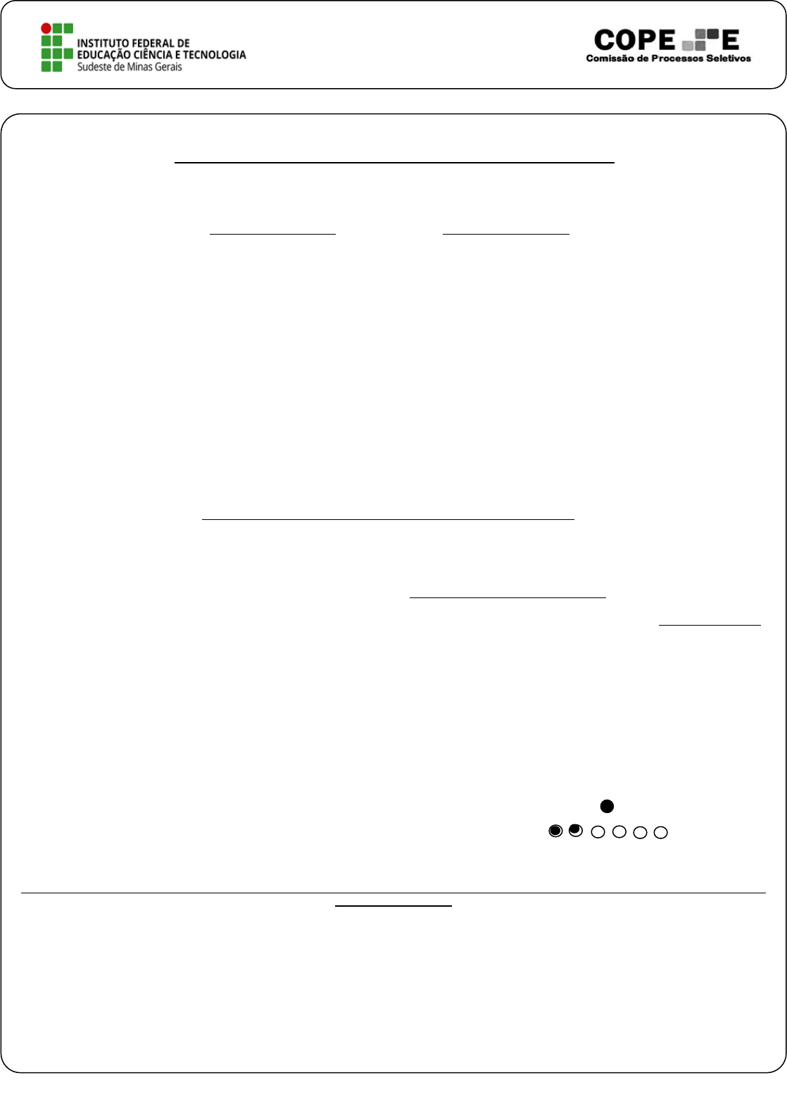 PROCESSO SELETIVO 2024/1 Cursos Integrados Instituto Federal de Educação, Ciência e Tecnologia do Sudeste de Minas Gerais – COPESE Pag. 1 de 23 TEMPO DE DURAÇÃO DA PROVA: 03 HORAS E 30 MINUTOS INSTRUÇÕES PARA A REALIZAÇÃO DA PROVA OBJETIVA 1. Abra este caderno de provas somente quando autorizado(a). 2. O número de seu CPF, o curso, o turno e o campus encontram-se no seu comprovante definitivo de inscrição e no identificador de sua carteira. Atenção: verifique seu caderno de provas 3. Este caderno de provas contém 45 questões (numeradas de 01 a 45), sendo: 12 (onze) questões de Língua Portuguesa (01 a 12); 11 (onze) questões de Matemática (13 a 23); 12 (doze) questões de Ciências (24 a 35); 5 (cinco) questões de Geografia (36 a 40); 5 (cinco) questões de História (41 a 45). 4. Cada questão contém 5 (cinco) alternativas. 5. Caso haja algum problema, solicite a substituição de seu caderno de provas. 6. Em hipótese alguma, haverá substituição da folha de respostas. Atenção: administre o tempo de prova 7. Controle o tempo disponível para a resolução das questões e a marcação da folha de respostas. Não haverá tempo adicional. 8. Você só poderá deixar o local de prova após 1 (uma) hora do início da aplicação, e somente poderá levar o caderno de prova após 2 (duas) horas do início da aplicação. 9. Você será avisado quando restarem 30 (trinta) minutos para o final da prova. 10. Não deixe para preencher sua folha de respostas nos momentos finais da prova, pois não haverá tempo adicional para a realização dessa atividade. 11. Os 3 (três) últimos candidatos deverão permanecer na sala para entrega simultânea da folha de respostas e deverão acompanhar o procedimento de finalização da aplicação da prova. INSTRUÇÕES PARA O PREENCHIMENTO DA FOLHA DE RESPOSTAS Atenção: folha de respostas 1.Ao receber sua folha de respostas, verifique o seu número de inscrição e o seu nome, além da modalidade, o campus, o curso, o turno e o grupo de concorrência para os quais você se inscreveu. 2. Confira todos os seus dados pessoais impressos. Caso alguma informação esteja incorreta, comunique ao fiscal. 3. Ao receber a folha de respostas, assine-a imediatamente. A COPESE não se responsabilizará por folhas de respostas não assinadas. 4. Não amasse, não dobre, não rasgue, não rasure a folha de respostas, nem use corretivo. 5. Terminada a resolução da prova, preencha a folha de respostas com as suas opções, conforme o seguinte: A marcação das respostas deve, OBRIGATORIAMENTE, ser feita com caneta esferográfica com tinta azul ou preta. A letra correspondente à questão escolhida deve ser totalmente preenchida, evitando-se ultrapassar a linha que margeia a letra. A marcação de mais de uma opção para uma mesma questão implica a anulação da questão. A COPESE não se responsabilizará por problemas na leitura causados por marcação inadequada da folha de respostas, ou pela utilização de material não especificado para tal. AO ASSINALAR SUAS RESPOSTAS, PREENCHA TOTALMENTE A LETRA CORRESPONDENTE A SUA RESPOSTA. NÃO FAÇA UM X, NEM QUALQUER OUTRA MARCA. FORMA CORRETA DE PREENCHIMENTO: NÃO PREENCHA ASSIM: NOTAS E RESULTADOS Gabarito e provas: 18 horas do dia 27 de novembro de 2023. Notas da prova objetiva: 18 horas do dia 13 de dezembro de 2023. Resultado final: 18 horas do dia 22 de dezembro de 2023. x − * PROCESSO SELETIVO 2024/1 Cursos Integrados Instituto Federal de Educação, Ciência e Tecnologia do Sudeste de Minas Gerais – COPESE Pag. 1 de 23 PROPOSTA DE REDAÇÃO ORIENTAÇÕES: A redação deve obrigatoriamente: • ter um título; • ser escrita em prosa e seguir os parâmetros da norma padrão da Língua Portuguesa; • ter de 15 a 30 linhas; • dar preferência à letra cursiva. Se optar por letra de forma (letra de imprensa), use, adequadamente, maiúsculas e minúsculas; • ser escrita à tinta azul ou preta. ATENÇÃO: As redações que apresentarem menos de 15 linhas escritas serão anuladas. As linhas excedentes (a partir da 31ª linha) não serão avaliadas. Os textos a seguir são apenas motivadores para a redação. Caso queira se referir a eles em sua produção, deve fazê-lo de acordo com as normas redacionais adequadas. Os textos não devem, portanto, ser meramente copiados, sob pena de anulação de sua produção textual. PROCESSO SELETIVO 2024/1 Cursos Integrados Instituto Federal de Educação, Ciência e Tecnologia do Sudeste de Minas Gerais – COPESE Pag. 1 de 23 LÍNGUA PORTUGUESA E LITERATURA Leia o texto a seguir para responder às questões 1, 2 e 3. TEXTO I Morte e Vida Severina: auto de natal pernambucano - Somos muitos Severinos iguais em tudo na vida: na mesma cabeça grande que a custo é que se equilibra, no mesmo ventre crescido sobre as mesmas pernas finas e iguais também porque o sangue que usamos tem pouca tinta. - E se somos Severinos iguais em tudo na vida, morremos de morte igual, mesma morte severina: que é a morte de que se morre de velhice antes dos trinta, de emboscada antes dos vinte de fome um pouco por dia (de fraqueza e de doença é que a morte severina ataca em qualquer idade, e até gente não nascida). - Somos muitos Severinos iguais em tudo e na sina: a de abrandar estas pedras suando-se muito em cima, a de tentar despertar terra sempre mais extinta, - a de querer arrancar algum roçado da cinza. Mas, para que me conheçam melhor Vossas Senhorias e melhor possam seguir a história de minha vida, passo a ser o Severino que em vossa presença emigra. NETO, João Cabral de Melo. Morte e vida Severina e outros poemas. Rio de Janeiro: Objetiva, 2007. p. 117. Questão 1: No início do trecho do poema, o personagem diz que sua vida é marcada por alguns problemas que são inerentes a várias outras pessoas. Marque a alternativa que demonstra CORRETAMENTE a compreensão do que o personagem diz no fragmento lido. a) Todos os Severinos buscam o mesmo padrão cor