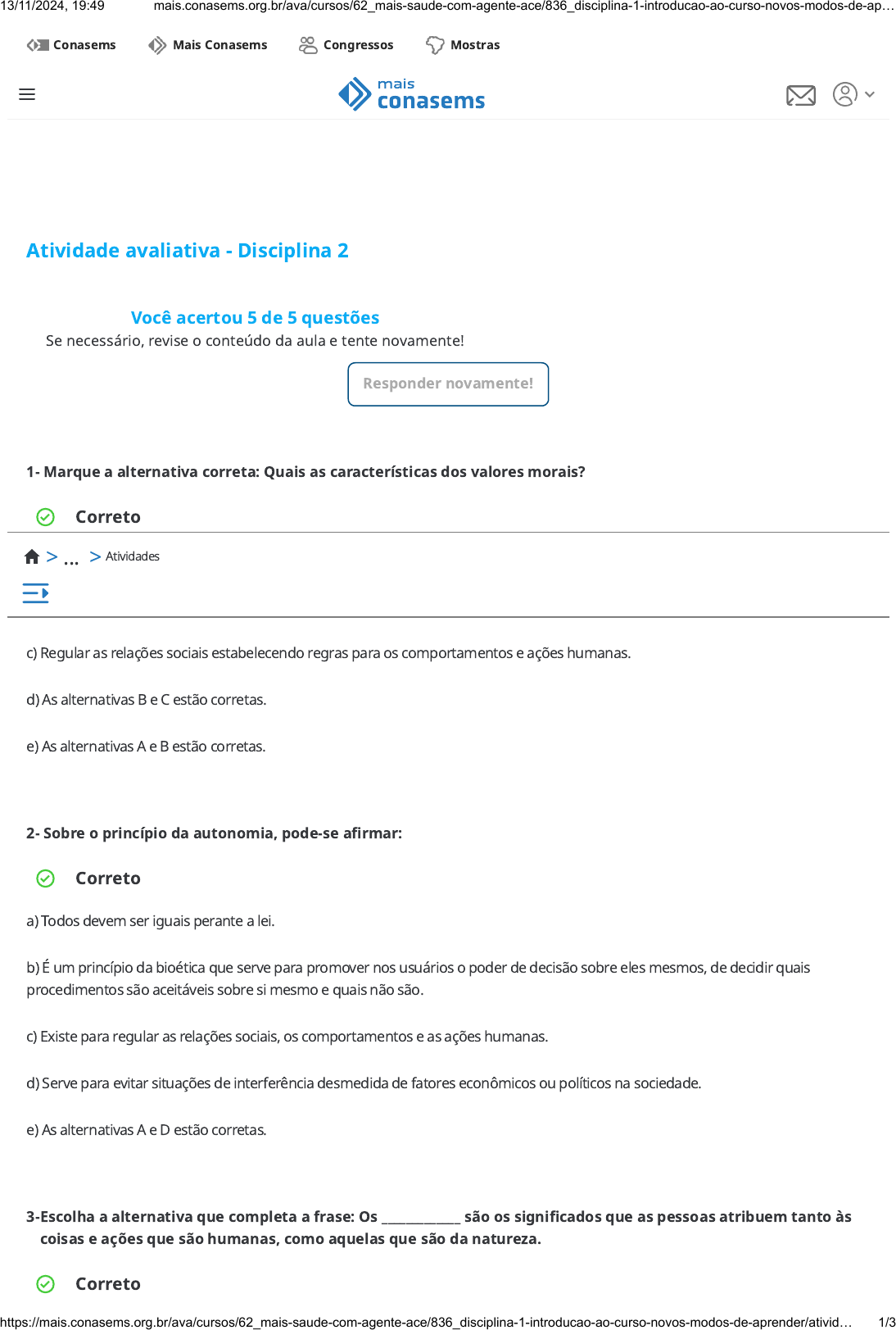 Atividade avaliativa - Disciplina 2 Você acertou 5 de 5 questões Se necessário, revise o conteúdo da aula e tente novamente! Responder novamente! 1- Marque a alternativa correta: Quais as características dos valores morais? Correto a) Ser iguais para todos os povos em qualquer tempo e espaço. b) Criar sistemas de normas que informam o que é o “bem” e “mal”, o certo e o errado, o justo e o injusto. c) Regular as relações sociais estabelecendo regras para os comportamentos e ações humanas. d) As alternativas B e C estão corretas. e) As alternativas A e B estão corretas. 2- Sobre o princípio da autonomia, pode-se a�rmar: Correto a) Todos devem ser iguais perante a lei. b) É um princípio da bioética que serve para promover nos usuários o poder de decisão sobre eles mesmos, de decidir quais procedimentos são aceitáveis sobre si mesmo e quais não são. c) Existe para regular as relações sociais, os comportamentos e as ações humanas. d) Serve para evitar situações de interferência desmedida de fatores econômicos ou políticos na sociedade. e) As alternativas A e D estão corretas. 3-Escolha a alternativa que completa a frase: Os _____________ são os signi�cados que as pessoas atribuem tanto às coisas e ações que são humanas, como aquelas que são da natureza. Correto Conasems Mais Conasems Congressos Mostras > ... > Atividades 13/11/2024, 19:49 mais.conasems.org.br/ava/cursos/62_mais-saude-com-agente-ace/836_disciplina-1-introducao-ao-curso-novos-modos-de-ap… https://mais.conasems.org.br/ava/cursos/62_mais-saude-com-agente-ace/836_disciplina-1-introducao-ao-curso-novos-modos-de-aprender/ativid… 1/3 https://mais.conasems.org.br/ https://mais.conasems.org.br/ava/mensagens?start=0&rows=30 https://portal.conasems.org.br/ https://mais.conasems.org.br/ https://congressos.conasems.org.br/ https://mostras.conasems.org.br/ https://mais.conasems.org.br/ a) valores b) princípios éticos c) direitos d) conflitos éticos e) elementos naturais 4-Sobre a Declaração Universal dos Direitos Humanos (DUDH), são verdadeiras as alternativas: I – Todos nascem livres e iguais em dignidade e em direitos, sem nenhuma distinção de raça, de cor, de sexo, língua, religião, opinião política, de origem nacional ou social, de fortuna, de nascimento ou de qualquer outra situação. II - Acesso à alimentação, ao vestuário, à moradia, à assistência à saúde e aos serviços sociais que dão segurança no desemprego, na doença, na invalidez, na viuvez, na velhice. III – Todos possuem liberdade de pensamento, de consciência, de religião, além de direito a um nível de vida que assegure a si e à sua família saúde e bem-estar. IV - Humanos inclui o direito à vida, à liberdade e à segurança pessoal, a�rmando que ninguém deve ser mantido em escravatura ou em servidão. Correto a) I, II e III. b) I e III. c) III e IV. d) I, II e IV. e) I, II, III e IV. 5-I - O cidadão ético é aquele que sabe buscar os seus direitos e os seus benefícios sociais em conformidade com a lei. II- A ética acompanha o desenvolvimento das sociedades humanas em todos os tempos. III – A ética está presente em todas as nossas atitudes e comportamentos, em todas as relações com familiares, amigos, colegas de trabalho, usuários. IV – Devemos ter uma visão ética ampliada de valorização da vida com postura consciente, solidária, responsável e virtuosa de todos os seres humanos. Assinale a alternativa correta: Correto a) I e II estão corretas b) I e III estão corretas c) II e IV estão corretas d) I, II e IV estão corretas e) I, II, III e IV estão corretas 13/11/2024, 19:49 mais.conasems.org.br/ava/cursos/62_mais-saude-com-agente-ace/836_disciplina-1-introducao-ao-curso-novos-modos-de-ap… https://mais.conasems.org.br/ava/cursos/62_mais-saude-com-agente-ace/836_disciplina-1-introducao-ao-curso-novos-modos-de-aprender/ativid… 2/3 13/11/2024, 19:49 mais.conasems.org.br/ava/cursos/62_mais-saude-com-agente-ace/836_disciplina-1-introducao-ao-curso-novos-modos-de-ap… https://mais.conasems.org.br/ava/cursos/62_mais-saude-com-agente-ace/836_disciplina-1-introducao-ao-curso-novos-modos-de-aprender/ativid… 3/3