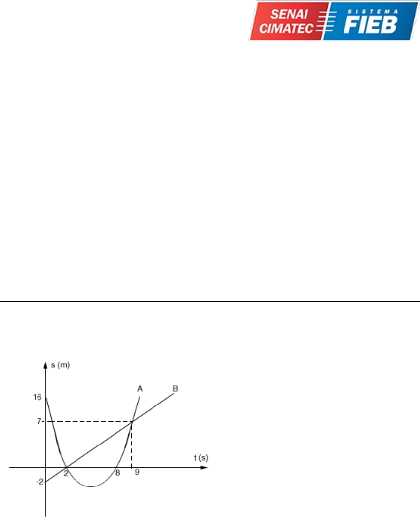 CENTRO UNIVERSITÁRIO SENAI-CIMATEC Coordenação das Engenharias Disciplina: Física A Teórica Prof.: Dr. Dourival Edgar dos Santos Júnior Aluno(a): Nome R.A. Semestre 2020.2 ---------------------------------------------------------------------------------------------------------- Avaliação da 1a unidade Observações: -A prova deverá ter o nome e número de matrícula do aluno. -A prova deve ser enviada em pdf ou doc. -Todas as questões ter que ter memória de cálculo. I. O gráfico posição contra tempo abaixo mostra o movimento de dois móveis A e B. Escreva na folha de respostas a alternativa correta. a) A velocidade inicial do móvel A é 10m/s. b) Ao chegar no ponto mínimo, o móvel A percorreu a distância de 9m, a partir do seu ponto inicial. c) O móvel B estará a 8m da origem em t=10s. d) Em t=2s a velocidade do móvel A é zero. e) No 2o encontro o móvel B percorreu 7m, a partir do seu ponto inicial. II. Um pequeno foguete tem um movimento dado por, s (t)=−t3+5. t2+2. t+2 (em metros e segundos): a) Ao chegar a altura máxima um paraquedas instalado no foguete é acionado. Após quanto tempo o paraquedas será acionado? b) Qual a velocidade do foguete após 2s do lançamento? c) Qual a aceleração do foguete para t=2s? III. Uma partícula parte da posição 3m. Sua velocidade é dada por, v (t )=12. t2+0,3.e(−1,5.t ) , (em unidades de metros e segundos). Quais os valores de posição e aceleração da partícula após 0,5s?