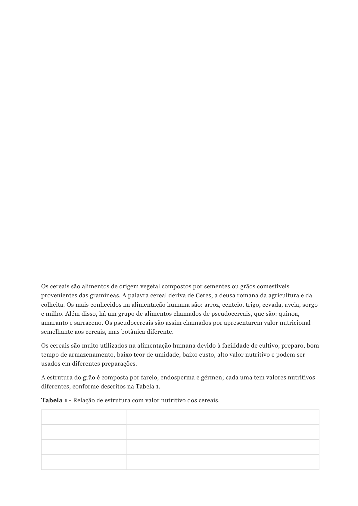 Lição 04 Cereais Técnica Dietética Começar a aula 1. Introdução Os cereais são alimentos de origem vegetal compostos por sementes ou grãos comestíveis provenientes das gramíneas. A palavra cereal deriva de Ceres, a deusa romana da agricultura e da colheita. Os mais conhecidos na alimentação humana são: arroz, centeio, trigo, cevada, aveia, sorgo e milho. Além disso, há um grupo de alimentos chamados de pseudocereais, que são: quinoa, amaranto e sarraceno. Os pseudocereais são assim chamados por apresentarem valor nutricional semelhante aos cereais, mas botânica diferente. Os cereais são muito utilizados na alimentação humana devido à facilidade de cultivo, preparo, bom tempo de armazenamento, baixo teor de umidade, baixo custo, alto valor nutritivo e podem ser usados em diferentes preparações. A estrutura do grão é composta por farelo, endosperma e gérmen; cada uma tem valores nutritivos diferentes, conforme descritos na Tabela 1. Tabela 1 - Relação de estrutura com valor nutritivo dos cereais. Estrutura Valor Nutritivo Casca, farelo ou parte externa Predomínio de celulose, minerais, proteínas e vitaminas do complexo B. Endosperma ou parte central Rico em carboidratos (amido) e pequenas quantidades de proteínas. Gérmen ou embrião Lipídios, proteínas, minerais, vitamina E e vitaminas do complexo B. Vistas as estruturas dos grãos de cereais, cabe ressaltar que o polimento é um processo que retira os componentes mais externos, como farelo, por isso, os cereais polidos apresentam menores teores de fibras, vitaminas e minerais. O incentivo para o consumo de cereais integrais é devido a este motivo, maior valor nutricional associado. Grão de cereal. 2. Composição nutricional e características dos cereais A composição nutricional dos cereais é dada por carboidratos (amido), proteínas (albuminas, globulinas, prolaminas e glutelinas) e lipídeos (principalmente ácido palmítico, oleico e linoleico). Além dos macronutrientes, os cereais possuem micronutrientes, vitaminas (tiamina, riboflavina, niacina, ácido pantotênico, vitamina E e minerais (potássio, fósforo, ferro, magnésio e cálcio). O cálcio tem absorção comprometida por formar fitina com o ácido fítico (presente no pericarpo do grão). O amido é o principal carboidrato dos cereais, compondo cerca de 70% dos grãos. O amido é composto de dois polissacarídeos, a amilose a amilopectina, que podem formar grânulos de cor branca, insolúveis em água e sem sabor. Este carboidrato pode sofrer um processo denominado de gelatinização, o qual é um fenômeno de dilatação dos grânulos de amido quando submetidos à água aquecida, com consequente aumento de volume. Existem alguns fatores que afetam a gelatinização do amido, como: • Temperatura: 70°C → líquido viscoso; 85°C → sólido gelatinoso; 95°C → máximo da gelatinização. • Açúcar: Adição → géis transparentes e macios; Excesso → compete pela água → xarope viscoso. • Ácido: Hidrolisa o amido e torna o gel mais fraco. Em preparações com ingredientes ácidos (suco de laranja, limão ou abacaxi), é preciso adicionar maiores quantidades de farinha. Além do processo de gelatinização, o amido pode sofrer uma modificação chamada de retrogradação, na qual há liberação de parte da água após a gelatinização. Há uma reversão do amido à sua insolubilidade em água fria. Em repouso, a rede do amido pode começar a contrair-se e expulsar grande parte de água, ocasionando no endurecimento do produto final. Exemplo: molho branco, mingau ou pudim em repouso. Outro processo de modificação do amido é a dextrinização, a qual é caracterizada como hidrólise do amido pelo aquecimento prolongado, calor seco ou adição de ácido. As membranas que envolvem o amido são rompidas gradativamente e dextrina (substância parcialmente solúvel). Neste processo, ocorre a diminuição da amilose e o aumento de amilopectina. Além disso, a dextrinização favorece a digestão do amido, por isso, são utilizadas de farinhas dextrinizadas na alimentação infantil. Exemplo de preparações que sofrem dextrinização é a farofa (farinha de mandioca aquecida) ou preparações à base de leite (pudim de laranja). Por que ocorre a gelatinização? O amido é insolúvel em água fria, no entanto, com o aquecimento, a membrana que o envolve torna-se permeável e em contato com a água os grânulos de amido incham. A partir da temperatura de 85°C, as partículas de amido começam a se romper, liberando amilose e amilopectina ao meio aquoso, formando uma rede que retém água, formando uma pasta viscosa. O máximo de gelatinização ocorre em torno dos 95 °C, quando há formação de uma massa translúcida que constitui a goma do amido. As fibras também estão presentes nos grãos, sendo que a concentração varia conforme o tipo de cereal ou com o grão de extração ou refinamento da farinha. Por exemplo: a celulose é encontrada no farelo de trigo; hemicelulose é mais encontrada no farelo e grãos integrais; a lignina é encontrada no trigo; as gomas, principalmente na aveia e na cevada. As fibras são usadas na indústria de alimentos como estabilizantes, impedindo que os ingredientes suspensos se sedimentem (pudins e sorvetes). As proteínas mais encontradas nos cereais são albuminas, globulinas, prolaminas (gliadina) e glutelinas (glutenina). Estas são proteínas com baixa digestibilidade devido à presença de fatores antinutricionais; além disso, possuem a lisina, como aminoácido limitante. A gliadina e glutenina, na presença de água, formam o glúten, que é um complexo elástico que proporciona liga às preparações, além de reter gás carbônico, ocasionando em crescimento da massa. O glúten, em contato com calor, coagula e deixa a massa crocante, como é o caso do pão de sal (ou francês). O pão de sal, quando fica “velho”, se torna elástico devido à capacidade do glúten em abso