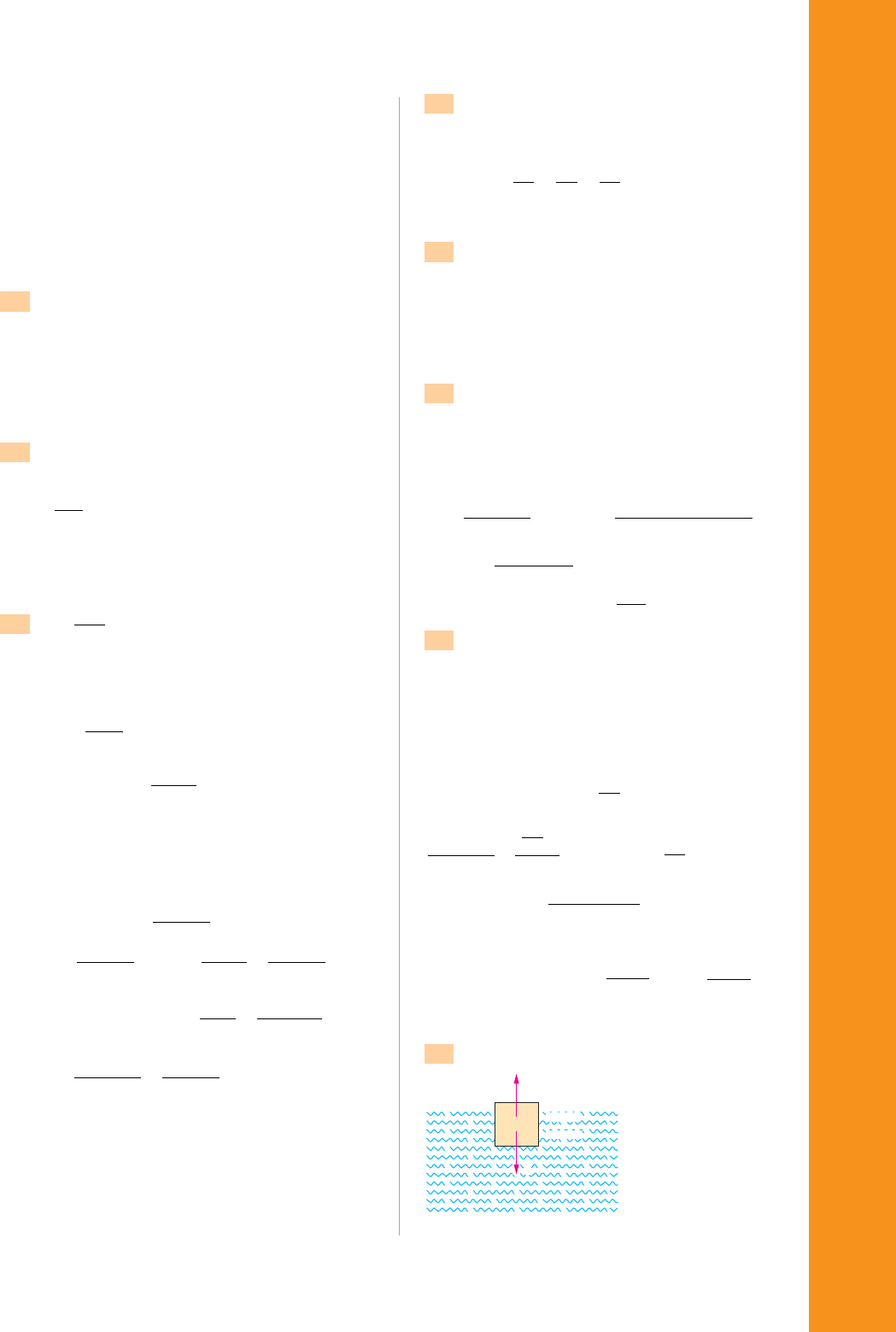 RESOLUÇÃO 199 SIM ULA DÃO : RE SOL UÇà O SIM ULA DÃO : RE SOL UÇà O b) É incorreta, pois de vc aumenta, dc diminui. Então, dc de, o que significa que o corpo irá subir até a superfície, e ficar com uma parte de seu volume flutu- ando fora do líquido. c) É correta, pois E � de � ve � g � me � g � plíq. desl. d) e e) São corretas, pois vc � vlíq. desl., já que o corpo está totalmente imerso no líquido. Como dc � de, en- tão mc � me. 290 Alternativa b. Como a canoa flutua em equilíbrio, a 2ª Lei de Newton exige que a resultante das forças na vertical seja nula. Sobre a canoa atuam apenas a força-peso e o empuxo recebido pela água. Logo, p � E. 291 Alternativa b. O volume submerso de um corpo (Vsub.) é dado por Vsub. � d d c e Vc. Note que ele independe do valor de g. Também a situação do corpo não se altera, pois em contrapartida à relação de seu peso, existe a redução no empuxo exercido pelo líquido. 292 VA � M dA ; onde dA � 800 kg/m3 M � 24 kg Logo, VA � 24 800 � 3,0 � 10�2 m3 a) Vemerso � VA � 1� d d A água ⎛ ⎝ ⎜ ⎞ ⎠ ⎟ ⇒ Vemerso � 3 � 10�2 � (1 � 0,8) p Vemerso � 0,6 � 10�2 m3 ou 6 � 103 m3, que equivale a 6 l. b) Após colocarmos o corpo B sobre o bloco A, o con- junto submerge mais Vemerso 2 , segundo o enunciado. V�s � Vs � Vemerso 2 → V�s � M d V água emerso� 2 V�s � 24 10 6 10 23 3 � � � Mas V�s � m d m M d conjunto água água � � V�s � 24 � 10�3 � 3 � 10�3 � 27 � 10�3 m3. m � M � Vs � � dágua ⇒ m � 24 � 27 � 10�3 � 103 m � 3 kg c) E � dágua � V�s � g ⇒ E � 103 � 27 � 10�3 � 10 E � 270 N 293 Alternativa a. Quanto maior for o volume imerso, menos denso será o líquido. Comparando as frações dos volumes imersos, vemos que 7 8 5 6 3 4 � � ⇒ X é o líquido menos denso e Z é o mais denso. 294 Alternativa b. Se o corpo está submerso e em equilíbrio, então dc � de � 0,7 g/cm3. Ao colocarmos esse corpo num recipiente com água, cuja densidade é 1 g /cm3, ele flutuará, pois dc dágua. Apesar disso, manterá 70% de seu volume submerso. 295 Alternativa b. dprancha � 200 kg/m3; e � 0,1 m; Vprancha � A � e; dágua � 1 000 kg/m3 M � 50 kg. Do enunciado, Vs � Vprancha Vs � m d conjunto água → A � e � M d A e d prancha água � � � A � 0,1 � 50 20 1000 � A 100 A � 50 � 20 A ⇒ A � 50 80 � 0,625 m2 296 Alternativa a. – O cubo mergulhado desloca um volume de água igual ao seu próprio volume, portanto: Vcubo maciço � 30 cm3. Como a sua massa é de 450 g, concluímos que a den- sidade da liga metálica é de 15 g/cm3. – O cubo oco flutua com 3 4 de aresta submersa, por- tanto: d d h h cubo oco água � 3 4 ⇒ dcubo oco � 3 4 g/cm3 – Mas dcubo oco � m V efetiva da liga cubo oco , portanto mefetiva da liga � 22,5 g – Finalmente, como dliga � m V liga liga � 15 � 22,5 Vliga . Logo: Vliga � 1,5 cm3. 297 Alternativa c. E 15 cm h � 15 P E � P ��gVi � �cgVc ��S(h � 15) � �cSh ��(h � 15) � �ch 1,03(h � 15) � 0,9 h 1,03 h � 15,45 � 0,9 h 0,13 h � 15,45 h � 119 cm 200 RESOLUÇÃO SIM ULA DÃO : RE SOL UÇà O SIM ULA DÃO : RE SOL UÇà O 298 Alternativa a. Como a densidade do ar diminui com a altitude, o empuxo também diminui. Inicialmente, se o balão se eleva na atmosfera, isto ocorre porque P E. Ele con- tinuará subindo acelerado até o ponto em que P � E, a partir do qual ele sobe em movimento retardado, pois passará a uma zona onde P � E. Chegará até uma posição onde sua velocidade de subida se anula, e in- verterá o sentido de movimento numa descida acele- rada até o ponto de P � E. A partir daí, desce em mo- vimento retardado (P E) até sua velocidade se anu- lar, e reinverte o sentido do movimento, oscilando em torno da altura, em que P � E. 299 A afirmação a é falsa, pois: di � m V i i � 120 400 � 0,3 g/cm3 A afirmação b é falsa, pois: Vs � d d i a � Vi Vs � 0,3 Vi ou 30% do volume total. A afirmação c é verdadeira, pois o empuxo é dado por: E � dágua � Vs � g em que dágua � 103 kg/m3 e Vs � 0,3 � 400 � 10�6 � 1,2 � 10�4 m3 � E � 103 � 1,2 � 10�4 � 10 → E � 1,2 N Para afundar totalmente a esfera, devemos ter: P � F� � E�, em que P � 1,2 N e E� � dágua � Vi � g � 103 � 4 � 10�4 � 10 � 4 N. Logo, F� � 2,8 N e a afirmação d é verdadeira. Para afundar a esfera pela metade, devemos ter: P � F� � E�, com E� � dágua � 0,5Vi � g � 2 N. Logo, F� � 0,8 N e a afirmação e é falsa. 300 Alternativa a. Pap � 3 4 p. Mas Pap � P � E. Logo, P � E � 3 4 p ⇒ E � P 4 . dágua Vágua � d V0 0 4 . Como o corpo está completamen- te mergulhado na água: Vágua � V0 dágua � V0 � d V0 0 4 ⇒ dágua � d0 4 ou d0 � 4 � dágua. 301 Alternativa d. A afirmação (I) é correta, pois o balão apresenta uma força resultante igual a (E � P) em módulo, na direção vertical e com sentido para cima. Como a força é cons- tante enquanto o balão está totalmente submerso, seu movimento de subida é acelerado uniformemente. A afirmação (II) é falsa, pois o empuxo independe da profundidade. A afirmação (III) é verdadeira. Se a pressão atmosféri- ca ao nível da superfície for muito menor que a pres- são no fundo do lago, o balão pode explodir. 302 Situação 1: P � E � Fe Em que: E � d0 � V � g Fe � k � h , e k é a constante elétrica da mola. P � d0 � V � g � k � h 1 Situação 2: P � E� � F�e, onde: E� � d � V � g F�e � kh 2 P � d � V � g � kh 2 2 Igualando as expressões 1 e 2 : d � V � g � kh 2 � d0 � V � g � k � h V � g (d � d0) � kh � kh 2 ⇒ V � kh g d d2 1 0 � �( ) 303 Alternativa d. Para desprezarmos o empuxo do ar: err