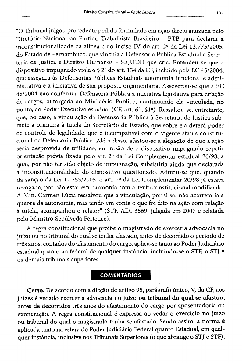 Direito Constitucional- Paulo Lépore 195 "O Tribunal julgou procedente pedido formulado em ação direta ajuizada pelo Diretório Nacional do Partido Trabalhista Brasileiro - PTB para declarar a inconstitucionalidade da alínea c do inciso IV do art. 2° da Lei 12.775/2005, do Estado de Pernambuco, que vincula a Defensoria Pública Estadual à Secre taria de Justiça e Direitos Humanos - SEJUDH que cria. Entendeu-se que o dispositivo impugnado viola o § 2° do art. 134 da CF, incluído pela EC 45/2004, que assegura às Defensorias Públicas Estaduais autonomia funcional e admi nistrativa e a iniciativa de sua proposta orçamentária. Asseverou-se que a EC 45/2004 não conferiu à Defensoria Pública a iniciativa legislativa para criação de cargos, outorgada ao Ministério Público, continuando ela vinculada, no ponto, ao Poder Executivo estadual (CF, art. 61, §1°). Ressaltou-se, entretanto, que, no caso, a vinculação da Defensoria Pública à Secretaria de Justiça sub mete a primeira à tutela do Secretário de Estado, que sobre ela deterá poder de controle de legalidade, que é incompatível com o vigente status constitu cional da Defensoria Pública. Além disso, afastou-se a alegação de que a ação seria desprovida de utilidade, em razão de o dispositivo impugnado repetir orientação prévia fixada pelo art. 2° da Lei Complementar estadual 20/98, a qual, por não ter sido objeto de impugnação, subsistiria ainda que declarada a inconstitucionalidade do dispositivo questionado. Aduziu-se que, quando da sanção da Lei 12.755/2005, o art. 2o da Lei Complementar 20/98 já estava revogado, por não estar em harmonia com o texto constitucional modificado. A Min. Cármen Lúcia ressalvou que a vinculação, por si só, não acarretaria a quebra da autonomia, mas tendo em conta o que foi dito na ação com relação à tutela, acompanhou o relator" (STF. ADI 3569, julgada em 2007 e relatada pelo Ministro Sepúlveda Pertence). A regra constitucional que proíbe o magistrado de exercer a advocacia no juízo ou no tribunal do qual se tenha afastado, antes de decorrido o período de três anos, contados do afastamento do cargo, aplica-se tanto ao Poder Judiciário estadual quanto ao federal de qualquer instância, incluindo-se o STF, o STJ e os demais tribunais superiores. COMENTÁRIOS Certo. De acordo com a dicção do artigo 95, parágrafo único, V, da CF, aos juízes é vedado exercer a advocacia no juízo ou tribunal do qual se afastou, antes de decorridos três anos do afastamento do cargo por aposentadoria ou exoneração. A regra constitucional é expressa ao vedar o exercício no juízo ou tribunal do qual o magistrado tenha se afastado. Sendo assim, a norma é aplicada tanto na esfera do Poder Judiciário Federal quanto Estadual, em qual quer instância, inclusive nos Tribunais Superiores (o que abrange o STJ e STF). 196 Questões Comentadas de Direito Administrativo e Direito Constitucional - CESPE De acordo com a CF, é obrigação dos tribunais de justiça estaduais, dos tribunais regionais federais e dos tribunais regionais do trabalho a instalação da justiça itinerante com competência para realizar atividades jurisdicionais, inclusive audiências, dentro dos limites territoriais da respectiva jurisdição. COMENTÁRIOS Certo. O artigo 125, §7°, da CF, estabelece, no âmbito dos Estados, que o Tribunal de Justiça instalará a justiça itinerante, com a realização de au diências e demais funções da atividade jurisdicional, nos limites territoriais da respectiva jurisdição, servindo-se de equipamentos públicos e comunitários. Por sua vez, o artigo 107, §2°, da CF, diz que os Tribunais Regionais Federais instalarão a justiça itinerante, com a realização de audiências e demais fun ções da atividade jurisdicional, nos limites territoriais da respectiva jurisdição, servindo-se de equipamentos públicos e comunitários. Por fim, o artigo 115, § 1 o, da CF, faz expressa previsão de que os Tribunais Regionais do Trabalho instalarão a justiça itinerante, com a realização de audiências e demais fun ções de atividade jurisdicional, nos limites territoriais da respectiva jurisdição, servindo-se de equipamentos públicos e comunitários. É exemplificativo o rol de funções atinentes ao MP no texto constitucional, cumprindo à legislação infraconstitucior.al conferir-lhe outras funções, desde que compatíveis com sua finalidade institucional. COMENTÁRIOS Certo. É exemplificativo o rol de funções atinentes ao MP no texto cons titucional. Isso decorre da dicção do artigo 129, IX, da CF, que prevê, dentre as competências do MP, exercer outras funções que lhe forem conferidas, desde que compatíveis com sua finalidade, sendo-lhe vedada a representação judicial e a consultoria jurídica de entidades públicas. (Cespe- Delegado de Polícia Federal - DPF/2013)Com base nas disposições da CF acerca das competências dos jufzes federais, julgue o item a seguir. Aos juízes federais compete processar e julgar, entre outros crimes, os que atentem contra a organização do trabalho e os de ingresso ou permanência irregular de estrangeiro no território nacional, bem como as disputas sobre direitos indígenas. Direito Constitucional- Paulo Lépore 197 COMENTÁRIOS ® Nota do autor: a competência estabelecida na CF é bastante abordada em con cursos públicos. Via de regra, as provas cobram o próprio texto constitucional, sendo, portanto, de grande importância que o candidato leia os artigos pertinentes. Certo. Aos juízes federais compete processar e julgar, entre outros crimes, os que atentem contra a organização do trabalho (art. 109, VI, CF) e os de ingresso ou permanência irregular de estrangeiro no território nacional (art. 109, X, CF), bem como as disputas sobre direitos indígenas (art. 109, XI, CF). -------------------------···--· (Cespe- Juiz de Direito Substituto - RN/2013) Considerando o disposto na Emenda Constit