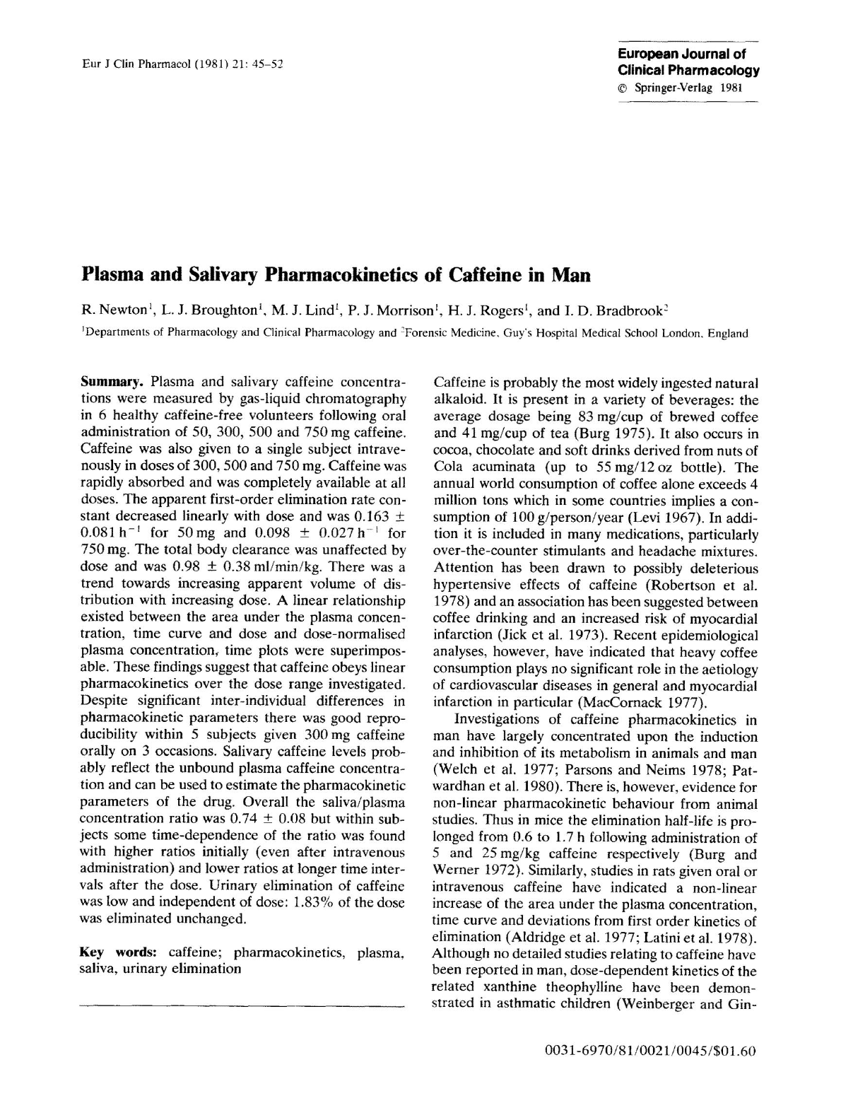 A cafeína também foi administrada a um único sujeito por via intravenosa em doses de 300, 500 e 750 mg. A cafeína foi rapidamente absorvida e estava completamente disponível em todas as doses. A taxa de eliminação aparente de primeira ordem constante diminuiu linearmente com a dose e foi de 0,163 _+ 0,081h -~ para 50 mg e 0,098 _+ 0,027h I para 750 mg. A depuração corporal total não foi afetada pela dose e foi de 0,98 _+ 0,38 ml/min/kg. Houve uma tendência para aumentar o volume aparente de distribuição com o aumento da dose. Existia uma relação linear entre a área sob a concentração plasmática, curva de tempo e dose e concentração plasmática normalizada pela dose, os gráficos de tempo eram sobreponíveis. Essas descobertas sugerem que a cafeína obedece à farmacocinética linear ao longo da faixa de dose investigada. A cafeína é provavelmente o alcaloide natural mais amplamente ingerido. Está presente em uma variedade de bebidas: a dosagem média é de 83 mg/xícara de café coado e 41 rag/xícara de chá (Burg 1975). Também ocorre em cacau, chocolate e refrigerantes derivados de nozes de Cola acuminata (até 55 mg/garrafa de 12 oz). O consumo mundial anual de café sozinho excede 4 milhões de toneladas, o que em alguns países implica um consumo de 100 g/pessoa/ano (Levi 1967). Além disso, está incluído em muitos medicamentos, particularmente estimulantes de venda livre e misturas para dor de cabeça. A atenção foi atraída para os possíveis efeitos hipertensivos deletérios da cafeína (Robertson et al. 1978) e uma associação foi sugerida entre o consumo de café e um risco aumentado de infarto do miocárdio (Jick et al. 1973). Análises epidemiológicas recentes, no entanto, indicaram que o consumo pesado de café não desempenha nenhum papel significativo na etiologia de doenças cardiovasculares em geral e do infarto do miocárdio em particular (MacCornack 1977). Palavras- chave : cafeína; farmacocinética, plasma, saliva, eliminação urinária Resumo. As concentrações de cafeína no plasma e na saliva foram medidas por cromatografia gás-líquido em 6 voluntários saudáveis sem cafeína após administração oral de 50, 300, 500 e 750 mg de cafeína. Apesar das diferenças interindividuais significativas nos parâmetros farmacocinéticos, houve boa reprodutibilidade em 5 indivíduos que receberam 300 mg de cafeína por via oral em 3 ocasiões. Os níveis de cafeína salivar provavelmente refletem a concentração plasmática de cafeína não ligada e podem ser usados para estimar os parâmetros farmacocinéticos do medicamento. No geral, a razão de concentração saliva/plasma foi de 0,74 + 0,08, mas dentro dos indivíduos foi encontrada alguma dependência temporal da razão com razões mais altas inicialmente (mesmo após administração intravenosa) e razões mais baixas em intervalos de tempo mais longos após a dose. A eliminação urinária de cafeína foi baixa e independente da dose: 1,83% da dose foi eliminada inalterada. R. Newton l, LJ Broughton ~, MJ Lind ~, PJ Morrison ~, HJ Rogers j, e ID Bradbrook -~ 1Departamentos de Farmacologia e Farmacologia Clínica e 2Medicina Forense, Guy's Hospital Medical School London. Inglaterra Eur J Clin Pharmacol (1981) 21:45-52 Embora não tenham sido relatados estudos detalhados relacionados à cafeína no homem, a cinética dose-dependente da xantina teofilina relacionada foi demonstrada em crianças asmáticas (Weinberger e Gin- 0031-6970/81/0021/0045/$01,60 Investigações sobre a farmacocinética da cafeína no homem se concentraram amplamente na indução e inibição de seu metabolismo em animais e no homem (Welch et al. 19771 Parsons e Neims 1978; Pat-wardhan et al. 1980). Há, no entanto, evidências de comportamento farmacocinético não linear em estudos com animais. Assim, em camundongos, a meia-vida de eliminação é prolongada de 0,6 para 1,7 h após a administração de 5 e 25 mg/kg de cafeína, respectivamente (Burg e Werner 1972). Da mesma forma, estudos em ratos que receberam cafeína oral ou intravenosa indicaram um aumento não linear da área sob a concentração plasmática, curva de tempo e desvios da cinética de eliminação de primeira ordem (Aldridge et al. 19771 Latini et al. 1978). Farmacologia Clínica © Springer-Verlag 1981 Revista Europeia de Farmacocinética plasmática e salivar da cafeína no homem Machine Translated by Google Materiais e métodos garantir que a cafeína estava ausente do plasma antes do início do estudo, uma amostra de sangue foi analisada para cafeína na noite anterior ao estudo. Após um jejum noturno, os indivíduos se reportaram ao laboratório e amostras de sangue e saliva mista foram coletadas para análises em branco. Cada indivíduo recebeu em ordem aleatória em ocasiões separadas base de cafeína (Sigma Chemicals) preparada em cápsulas de gelatina em doses de 50, 300, 500 ou 750 mg. As cápsulas foram engolidas com 100 ml de água. Um indivíduo recebeu apenas as doses de 300, 500 e 700 mg: este indivíduo também não produziu amostras salivares para a dose de 500 mg de cafeína. Os indivíduos foram autorizados a comer uma refeição leve (o que era padrão entre os indivíduos) 4 h após a dosagem. Amostras de sangue venoso (5 ml) foram coletadas em 0,5, 1, 1,5, 2, 2,5, 3, 4, 5, 6, 8, 10, 12, 24 e 48 h e amostras adicionais foram coletadas em 0,25 e 0,75 h após a dose de 750 mg. Amostras de saliva mista (estimuladas pela mastigação de filme de parafina) foram coletadas nesses momentos. Coletas completas de urina de 0-24 e 24-48 h foram feitas. Um intervalo de pelo menos 4 dias transcorreu antes de começar o próximo teste. Amostras de plasma, saliva e urina foram armazenadas a -20 °C até a análise. 1. A estimativa das concentrações de cafeína em amostras biológicas foi feita por cromatografia gasosa: a 0,5 ml de plasma ou saliva ou 0,2 ml de urina em um tubo com rolha de vidro moído foram adicionados 20 ~tl de