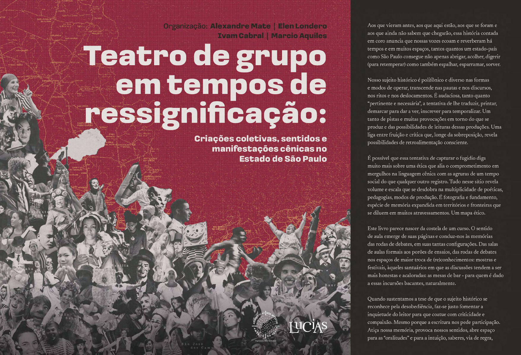 Organização: Alexandre Mate | Elen Londero Ivam Cabral | Marcio Aquiles Criações coletivas, sentidos e manifestações cênicas no Estado de São Paulo Teatro de grupo em tempos de ressignificação: A849e Associação dos Artistas amigos da Praça Teatro de grupo em tempos de ressignificação: criações coletivas, sentidos e manifestações cênicas no estado de São Paulo/ Alexandre Mate, Elen Londero, Ivam Cabral, Marcio Aquiles – 1. ed. – São Paulo:Lucias/Adaap, 2023. 876 p. ISBN 978-65-84800-39-7 _________________________________________________________________ 1. Teatro 2. Teatro de grupo 3. Artes Cênicas 4. São Paulo Bibliotecária: Mônica Madureiro – CRB8/10833 CDU: 791 Relicários (de lembrança) em forma de um “retábulo de maravilhas”1 Por se “encerrar” em 2021/2023, as trajetórias de vida de tanta “gente bamba”, cujas existências, em estado de beleza, foram dedicadas às manifestações artísticas (com ênfase à linguagem teatral), nossa homenagem e preito de gratidão, reconhecimento, carinho e respeito às memórias de: Aderbal Freire-Filho, Afonso Gentil, Alexandre Maradei, André Bubman, André Ceccato, Antonio Bivar, Antonio Netto, Antônio Pedro, Aracy Balabanian, Ari Buccioni, Armando Sérgio da Silva, Arnaldo Jabor, Artur Xexéo, Barba Amn (Bruno Martello Bon), Berta Zemel, Bete Sanches, Carlos Eduardo Colabone, Carlos Lupinacci, Cecil Thiré, Celina Fujii, Clara Rocha, Cláudia Gimenez, Cláudio Petraglia, Daisy Lucidi, Daisy Nery, Edson Montenegro, Edson Roberto Santana, Eduardo Ruiz, Edugair, Eliezer Rolim, Emílio Di Biasi, Ênio Carvalho, Érika Riedel, Eva Sielawa, Eva Wilma, Françoise Fourton, Flávio Migliaccio, Francisco Carlos, Francisco (Chiquinho) Medeiros, Gabriel Prata, Gésio Amadeu, Guaranah Ramos, Harlei Campos, Hugo Rodas, Humberto Braga, Iacov Hillel, Ismael Ivo, Jair Aguiar, João Acaiabe, João Isidoro, Jonas Mello, Jorge Fernando, José Celso Martinez Corrêa (Zé Celso), José Mojica Marins (Zé do Caixão), Jô Soares, Juliana Gontijo, Julio Calasso, Kiko Jaess, Léa Garcia, Leonardo Villar, Lizette Negreiros, Lygia Fagundes Telles, Lúcia Camargo, Luis Gustavo, Luís Felipe Bernardo dos Santos – Macalé, Luiz Carlos Araújo, Luiz Carlos Rossi, Luiz Parreiras, Luiz Pazzini, Marcelo Denny, Márcia Manfredini, Maria Alice Vergueiro, Maria Fernanda, Maria Sales, Marilena Ansaldi, Mario Cesar Camargo, Marizilda Rosa, Michel Fernandes, Milton Gonçalves, Miss Biá, Neusa Maria Faro, Nicette Bruno, Noemi Gerbelli, Paulo A. de Moraes, Paulo Gustavo, Paulo José, Paulo Motta, Penha Pietras, Renata Pallottini, Ricardo Devito, Roberto Ascar, Roberto Francisco, Roberto Innocente, Rosa Freitas, Rosaly Papadopol, Rubens Caribé, Sandro Martyns – o Belém, “Seo” Barbosa (Tusp), Sérgio Mamberti, Sérgio Ricardo, Severino João da Silva (pipoqueiro do Teatro Sergio Cardoso), Tanah Corrêa, Tarcísio Meira, Teresa Aguiar, Thereza Amayo, Thereza Austregésilo, Toni Edson, Vânia Toledo, Vera Gertel, Vera Nunes, William Moraes – Will, Wilma de Souza, Wilson Coca, Zeca Capellini... 1. Porque se aprende e pode-se ressignificar, cotidianamente, a partir de critérios e conhecimentos históricos, os sentidos de cada e todas as coi- sas (humanas, estéticas, emotivas, políticas...). A imagem aqui apresentada quer referir-se, também, à palavra estetizada, por exemplo, a partir do teatro e de todas as obras à beleza criada por Miguel de Cervantes e nomeada Retábulo das Maravilhas. Portanto, essa obra coletiva não poderia deixar de lado, ou esquecer, ou não destacar, as trajetórias de tanta e inesquecível gente do teatro. Uma imensa parte de nós, deve, sim, tributos permanentes aos que – sempre em luta e vencendo tantas dificuldades – vieram antes de nós... e que permanecem. FICHA TÉCNICA DA PUBLICAÇÃO -------- CONCEPÇÃO DA OBRA Alexandre Mate e Ivam Cabral CURADORIA (ARTISTAS E CONJUNTOS CRIADORES) Alexandre Mate, Elen Londero, Ivam Cabral, Marcio Aquiles CORO DE PROFISSIONAIS DA ADAAP Elen Londero, Gustavo Ferreira, Ivam Cabral, Márcia Daylin, Marcio Aquiles CONTATO, DISTRIBUIÇÃO E COMUNICAÇÃO COM CONJUNTOS CRIADORES Elen Londero, Gustavo Ferreira, Márcia Daylin, Marcio Aquiles CORO DE CRIAÇÃO (EM-REDE) NO ESTADO DE SÃO PAULO Alexandre Melinsky e Bárbara Teodósio (na coordenação), Renata Carvalho, Rodrigo Santiago, Evandro Cláudio, Charles Ferlete, Mário Irikura, Andressa Giacomini, Flavia Baxhix (Araçatuba); Weber Fonseca (na coordenação), Bruno Ismael Garbuio e Laís Justus (Araraquara e São Carlos); Osmildo Andrade, Adonias Garcia (Barretos); Luciano Dami (Batatais); Talita Neves (Bauru, na coordenação); Rogerio Carlos Fábio (Bebedouro); Willian Vasconcelos (Bertioga); Tiche Vianna, Eduardo Okamoto (na coordenação), Luzia Anhorein Meimes, Alice Possani, Lara Dau Vieira, Carlos Kiss, Claudia Monique Silva Ferreira, Leonardo Thim Agudo Caetano, Kara Katharina, Lays Ramires, Gabriel Gonçalves (Campinas); Marcos Brytto; Elis Rebouças e Sander Newton (Cubatão); Rafael Bougleux, Luciano Dami, Hélio Simões (Franca); Carlos Eduardo Veríssimo (Guarujá); Stefany Cristiny (por Itapeva); Paula Bittencourt e Ricardo Bagge (na coordenação), Sandro de Cássio Dutra, Danilo Alvez, Rafael Karnakis, Nelson Silva, Gui Bonfim, Renato Gonzalez (Assis e Marília); Rodrigo Alves de Souza (Mongaguá); Aline Prado (Peruíbe); Leandro Faria (Ourinhos); Antônio Chapéu e Edvaldo Oliveira (Piracicaba, na coordenação); Fernando Ávila, Luis Valente, Tiago Munhoz (Presidente Prudente, na coordenação); Fabiano Muniz (Registro); Miriam Fontana (na coordenação), Alessandra Constantino, Juliana Marques, Maikon Jefferson, Marcos Melo, Rafael Touso (Ribeirão Preto); Caio Martinez Pacheco, Júnior Brassaloti, Miriam Vieira, Platão Capurro Filho, Raquel Rollo, Zeca Sampaio (Santos/São Vicente); João Armando Fabbro, Flávio Melo e Thiago de Castro Leite (Sorocaba, na coordenação), Stefany Cristin