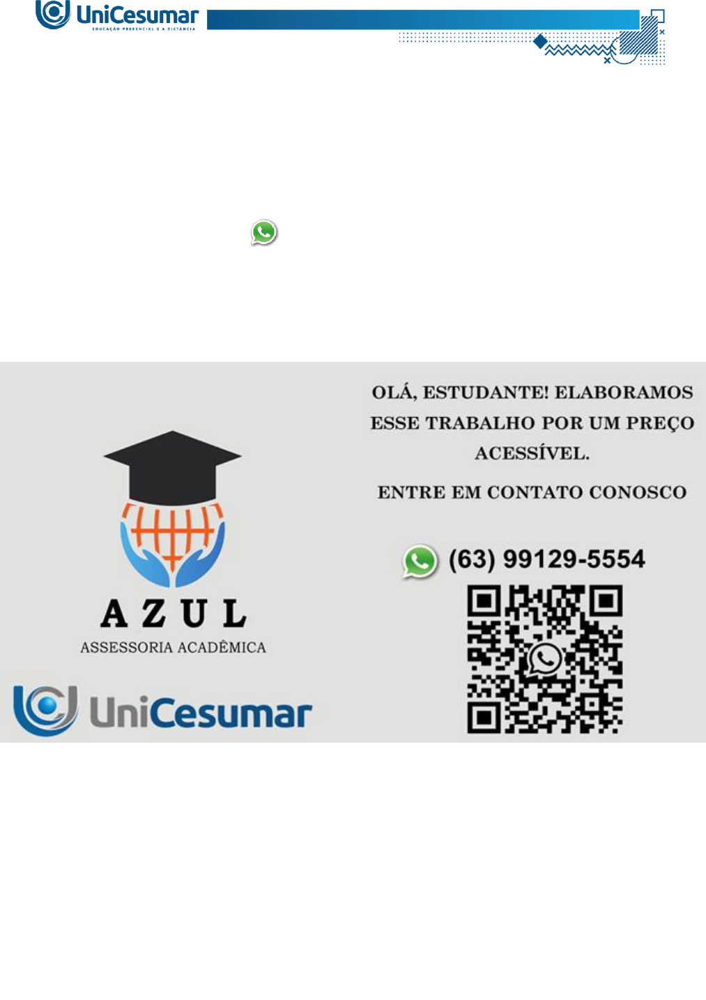 Olá, estudante! Elaboramos esse trabalho por um preço acessível!!! Entre em contato (63) 99129-5554 MAPA – PSICO - INSTRUMENTOS E AVALIAÇÃO PSICOPEDAGÓGICOS - 54_2024 O diagnóstico psicopedagógico é uma ferramenta essencial para compreender as dificuldades de aprendizagem e desenvolvimento de crianças e adolescentes. Dentro desse contexto, as provas piagetianas desempenham um papel fundamental, oferecendo informações valiosas sobre o funcionamento cognitivo e o estágio de desenvolvimento de cada indivíduo. A aplicação das provas piagetianas no contexto do diagnóstico psicopedagógico permite aos profissionais identificar não apenas as dificuldades específicas de uma criança em relação a determinados conceitos, mas também avaliar seu estágio de desenvolvimento cognitivo. Ao analisar as respostas e os processos de pensamento durante a execução dessas provas, os psicopedagogos podem diagnosticar possíveis defasagens no desenvolvimento e planejar intervenções educacionais adequadas. Em resumo, as provas piagetianas desempenham um papel crucial no diagnóstico psicopedagógico, ajudando os profissionais a entender melhor as necessidades e os desafios de cada criança em seu processo de desenvolvimento e aprendizagem. Fonte: CEREZUELA, C. Instrumentos e Avaliação Psicopedagógicos. Maringá: UniCesumar, 2020. Etapas da atividade: 1ª etapa: escolha uma das provas do diagnóstico operatório piagetiano (por exemplo, conservação de quantidade, classificação, seriação) que seja apropriada para a idade de uma criança que poderá participar da atividade com você. 2ª etapa: preparação da atividade: planeje a atividade prática, considerando os materiais necessários e o ambiente adequado para sua realização. Confeccione, adquira ou empreste os materiais necessários para a realização da sua prova. Certifique-se de que a atividade seja segura e adequada para a faixa etária escolhida. 3ª etapa: realize a atividade prática. Você deverá realizar a prova piagetiana escolhida seguindo as instruções do livro didático. 4ª etapa: registro da sua prática. Você anexará duas fotos: a primeira será uma foto sua, com o material da 2° etapa, pronto para aplicar a prova, a outra será uma foto da criança realizando a prova operatória (sem mostrar o rosto da criança). Descreva, em até 10 linhas, como foi a aplicação da prova. 5ª etapa: elabore um texto de até 20 linhas explicando a importância das provas piagetianas para a atuação psicopedagógica. ATENÇÃO! Faça o download do FORMULÁRIO-PADRÃO (localizado no ícone MATERIAL DA DISCIPLINA em seu Studeo), realize a atividade neste arquivo e, em seguida, faça o envio. Certifique-se de que está enviando o arquivo correto, pois haverá uma única oportunidade de envio, e não serão aceitos trabalhos por outro canal, apenas pelo campo específico de envio. Realize uma cuidadosa correção ortográfica em sua atividade antes de enviá-la. Acesse a Sala do Café. Lá, foram disponibilizadas orientações detalhadas para realização desta atividade. Se houver dúvidas, escreva uma mensagem no fórum tira-dúvidas do MAPA. Bons estudos!