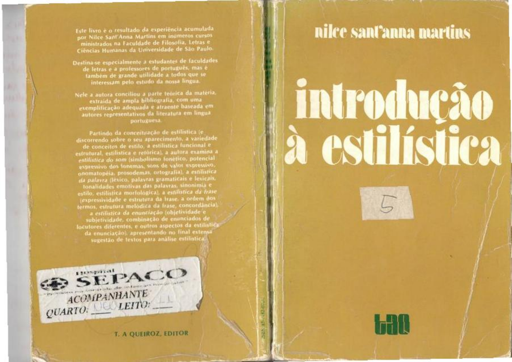 Este livro e o resultado da esporência acumulada por Nilce San Anna Martins em indmeros cursos ministrados na Faculdade de Filosólia, Letras € Ciências Humanas da Universidade de São Paulo. Destina-se especialmente 4 estudantes de faculdades de letras é à professores de português, imas é também de grande utilidade a todos que ve interessam pelo estudo da nossa lingua. Nele a autora concilou 4 parte teórica da matéria, estrálda de ampla bibliografia, Com uma esemplificação adequada e atraente bascada em autores ropresentativos da literatura em lingua portuguesa Partindo da comcettuação de estilistica (e discorendo sobre o seu aparecimento, à variedade de conceitos de estilo, a estilintica huncional & estrutural, esdilintica e pefórica), & aubira eodmina d estilistea do som [uimbaliamo fonético, potencial espresivo dos fonemas, som de valo csprenina, onomatopéia, prosodemas, ortografia), a estilistica da palavra (léxico, palavras gramaticais é honicais, tonalidades emotivas das palavras, snonimia é estilo, esiilintica mortológical a estilística da frade enpressividade e estrutura da irase, à ordem dos termos. estrutura melódica da frase, concordância), a estiliatica da enunciação (objetividade e subjetividade, combinação de enanciados de locutores difecentos, e oulros aspectos da estilisthéno da enunciação) apresentando no Final extensa sugestão de textos para amblige estilintica), a | | | ACOMPANE Erg nilee sanCanra martins introdução estilística UI COS TR: [SUS q vii ' 13 ANEC] Na] ORIVWAS | É re er, 0 A ESTILIS Prosedem 2] y s ou troços suprassegmento Acento de intensidade e duração 2 Entoação . 59 2.6 3 Simais de pontuação é entoação Topa Exemplificação complementar para exer Bibliografia. qe a ER (1 Ortografia. Conceituação de léxico ... Palavras gramaticais .. Eae Ped ge CR OTPETS É OO RE ERR Tonalidades emotivas das palavras 3.4.1 Palavras de te gnificado afetivo... see 3.4.2 Palavras que exprimem julgamento 3.4 3 Palavras com elemento avaliativo sobreposto ao signifi- cado nuclear 4 4 Sentido avalianvo reli icipnado a afixo; 3.4.5 Palavras evocalivas Ses Estrangeimnsmos oSbEERAES a 80 ERG PE “Ba a pa . 85 87 aco BB PA RR, As imagens segundo Bally ... assess 91] : o. 94 97 rr, l 3 Indigenismos .. .. caísmos cas tecer ronalismos 346 A indi gem figurada....... 346.1 346.2 346.3 A formulação do símile e da metáfora 346.4 As funções expressivas da metáfora . 3.4 6.53 A metonimi 346.6 A smédoque ..... ssces Sinonímia e estilo 3 As denominações imagem e metáfora. a (0) 102 pa pai 103 5.1 Dilerenças entre sinônimos RR ses 4105 35.2 A uti À estilística morfolopia ... zação dos sinônimos .. espadas ESEE VE E , TA rage panda Lo A perspectiva da esulística morfológica .. " LO 36.2 A expressividade relacionada com a flexão de gênero e número. RE ENESEaRÃA «111 A torm aci wras TREs A derivação sufixal ; ad = [ud EssIva 2 A derivação ref 3 A derivação imprópt 3.634 A prefixação ... us cas o el A denvação parass cr 3.636 A composição. Amálgamas . ,.. o | A supressão de prefixos e a desmontagem de palavras .. Exemplificação complementar pard exercicio ..... Re Dio ralo eteapiasa E id E saci Th DA FRASE msiderações espressividade ligada à estrutura da frase 42 1 O conceito de fr: 2 A frase completa... . gldes EVER 4221 A frase comple 4222 A frase A. B subordinação .. asc TS A extenção dos períodos . escoa incompleta... ss us mms RR Frases de dois membros. Frases de um só membro Frases fragmentár sl ehpée segundo alguns hngúistas; eb H Vicente Garcia de Die BO. Halhday e Hasan. | Guimarães Rosa para os diferen- pi ir tes casos de clipse Pleonasmo ....... ce Debriees antigas 25.1 E xemplificação dos casos de pleonasmo enume- rados por Mattoso Câmara. .. .. se. 2.6 Anacóluto . REI SUE EE 4.2.7 Partículas de realce .. RE TI E] werê ordem dos termos na frase 431 4.3.2 A ordei 433 A posição do advérbio dos termos no sinti PERGIS eee cume ERR e Ea (a E casa JMPÃexa cus. esa iria ca rii iiu E á AÇÃO! maos DErEE EO Pr 137 em pros: so direto à 3.3.1 Casos particulares de discurso direto + Os verbos de 5 O discurso IN 5 Anáhse dos » 536.1 R o JR 4d Rr Gu ES R 3 3.6.3 Josué Gui | José É Etta Pessoa NOTA PRÉVIA E AGRADECIMENTO Este livro, que resultou da experiência acumulada em sucessi- vos cursos de Estilística da Língua Portuguesa, ministrados na Fi culdade de Filosofia, Letras e Ciências Humanas da Universidade de São Paulo, nos níveis de graduação e pós-graduação, destina-se, de modo particular, a estudantes das Faculdades de Letras e a pro- fessores de português e, de modo geral, a todos que se interessam pelo estudo de nossa língua Empenhei-me em conciliar a parte teórica, extraída de ampla bibliografia, com exemplificação adequada e atraente, selecionada em autores representativos da literatura em língua portuguesa. Sen- do a matéria de considerável amplitude, não foi fácil condensá-la nos limites de um manual, Ciente de que este pode apresentar mut- tas falhas, receberer de bom grado as observações e crític estores de boa-vontade. dos A todos os que me mcentivaram na realização deste trabalho e, especialmente, aos colegas Antomo da Silveira Mendonça, Dino Preti, Edith Pimentel Pinto, Valter Kehdi, que me proporcionaram a valiosa colaboração de inteligentes sugestões, a expressão do meu reconhecimento. Nilce Sant'Anna Martins " = NOTA À 2º EDIÇÃO Esta 2º edição, revista com todo o cuidado, recebeu alguns acrés- cimos. Foram incluídos textos para estudo, os quais, na edição ante- nor, só eram sugeridos. O índice remissivo localiza termos de natu- reza metalingúística que não constam no sumário À relação dos autores citados remete aos passos em que são mencionados ou uti- lizados em exemplificação e inch as referências bibhográficas das obras literárias não arroladas na bibliografia que encerra cada capí- tulo M