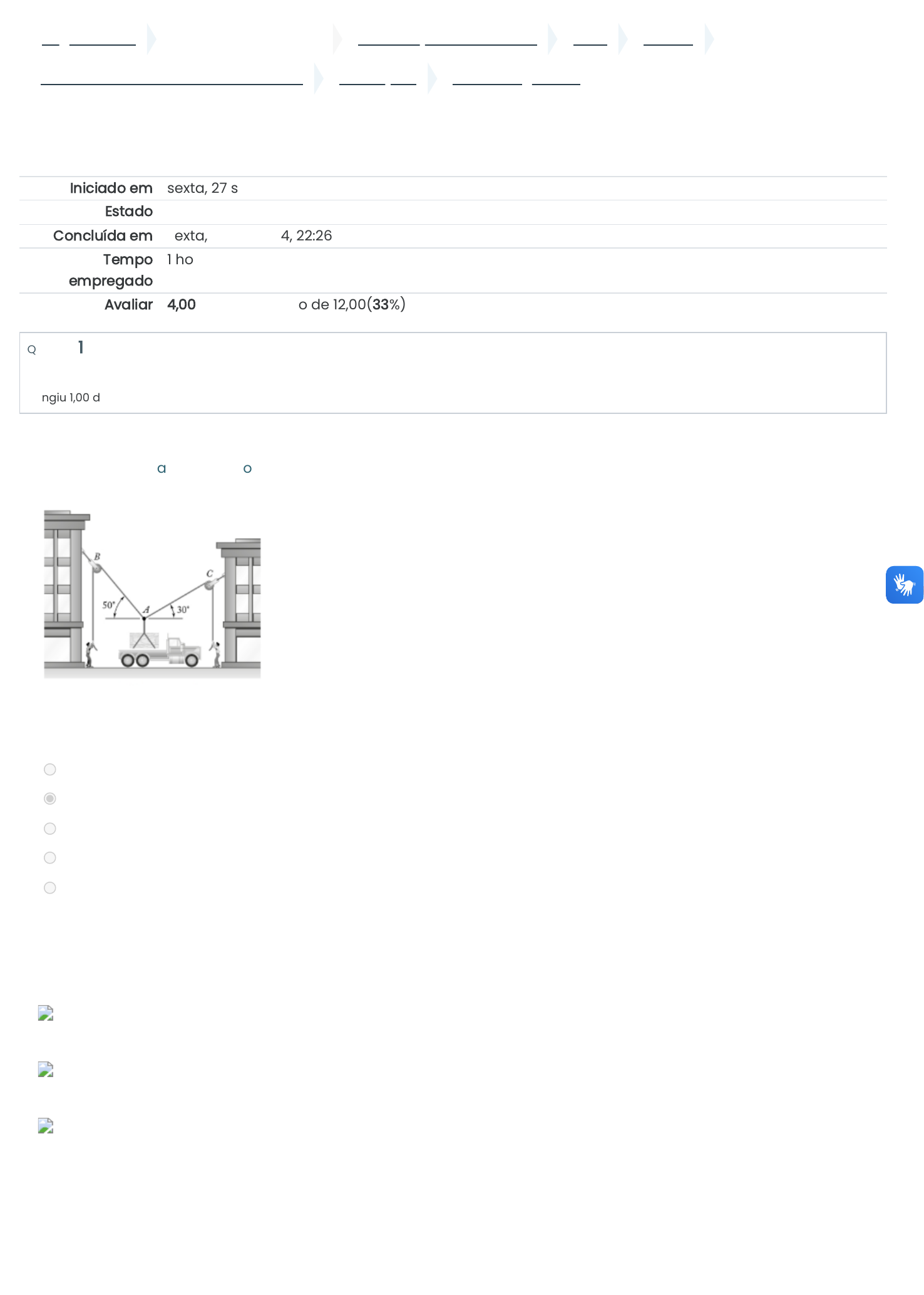 ... Página inicial Disciplinas e Espaços GRADUAÇÃO A DISTÂNCIA 2024 2024-3 Mecânica Estática - 2024_03_EAD_A Avaliações Prova Integradora Iniciado em sexta, 27 set 2024, 21:01 Estado Finalizada Concluída em sexta, 27 set 2024, 22:26 Tempo empregado 1 hora 25 minutos Avaliar 4,00 de um máximo de 12,00(33%) Questão 1 Correto Atingiu 1,00 de 1,00 A figura a seguir apresenta dois operários tentando içar uma carga de 75 kg. Determine a componente de força exercida por cada um dos operários na situação de equilíbrio. Escolha uma opção: a. Tab= 375N e Tac= 375N b. Tab= 647N e Tac= 480N c. Tab= 647N e Tac= 322N d. Tab= 322N e Tac= 480N e. Tab= 647N e Tac= 322N Sua resposta está correta. Com os dados do problema é possível montar o diagrama de corpo livre e o triângulo de forças abaixo. Calcule-se o valor da carga peso, aplicando as operações a seguir: E na sequência aplica-se a lei dos senos para determinar as componentes das forças: A resposta correta é: Tab= 647N e Tac= 480N 14/11/2024, 12:28 Prova Integradora https://ava.candidomendes.edu.br/moodle/mod/quiz/review.php?attempt=568162&cmid=509411 1/9 https://ava.candidomendes.edu.br/moodle/ https://ava.candidomendes.edu.br/moodle/course/index.php?categoryid=8 https://ava.candidomendes.edu.br/moodle/course/index.php?categoryid=175 https://ava.candidomendes.edu.br/moodle/course/index.php?categoryid=185 https://ava.candidomendes.edu.br/moodle/course/view.php?id=15055 https://ava.candidomendes.edu.br/moodle/course/view.php?id=15055§ion=4 https://ava.candidomendes.edu.br/moodle/mod/quiz/view.php?id=509411 Questão 2 Correto Atingiu 1,00 de 1,00 Uma força de 30 N atua na extremidade de uma alavanca de 3 m, como mostra a ilustração. Determine o momento da força em relação a O. Escolha uma opção: a. Momento de 30,8 Nm no sentido anti-horário. b. Momento de 90 Nm no sentido horário. c. Momento nulo. d. Momento de 90 Nm no sentido anti-horário. e. Momento de 30,8 Nm no sentido horário. Sua resposta está correta. A força é substituída por dois componentes, um P na direção OA e um componente Q perpendicular a OA. Como O está sobre a linha de ação de P, o momento de P em relação a O é nulo e o momento da força 30 N reduz-se ao momento de Q, que é no sentido horário e, portanto, representado por um escalar negativo. A resposta correta é: Momento de 30,8 Nm no sentido horário. 14/11/2024, 12:28 Prova Integradora https://ava.candidomendes.edu.br/moodle/mod/quiz/review.php?attempt=568162&cmid=509411 2/9 Questão 3 Incorreto Atingiu 0,00 de 1,00 Estampagem de metais: corte O corte, na estampagem de metais, é aplicado para se obter formas geométricas em chapas através de ferramentas de corte ou punção de corte, utilizando-se uma prensa que exerce pressão na chapa apoiada numa matriz. As figuras geométricas produzidas através do corte podem, em seguida, ser usadas para a estampagem profunda. Através da estampagem de metais por corte podemos obter componentes eletrônicos, peças de computador, gabinetes de CPU, dobradiças, modelos de aviões, réguas milimetradas, painel de fotos e muitos outros. https://www.ohub.com.br/ideias/tipos-de-estampagem-de-metais/. Acesso em 17/06/2020. Em seu galpão, Camila construiu um punção de corte para produzir peças, com formato curioso, como a representada na figura abaixo, a partir de chapas de latão. As coordenadas do centroide em relação à origem dos eixos coordenados é dada por: Escolha uma opção: a. x = 1,66cm e y = 1,66cm b. x = 2,94cm e y = 1,66cm c. x = 3cm e y = 2cm d. x = 2,94cm e y = 2,94cm e. x = 1,66cm e y = 2,94cm Sua resposta está incorreta. 14/11/2024, 12:28 Prova Integradora https://ava.candidomendes.edu.br/moodle/mod/quiz/review.php?attempt=568162&cmid=509411 3/9 https://www.ohub.com.br/ideias/tipos-de-estampagem-de-metais/ Questão 4 Incorreto Atingiu 0,00 de 1,00 Resposta correta: alternativa c. A resposta correta é: x = 2,94cm e y = 1,66cm Para a viga mostrada na figura, e sabendo que d=100 mm, determine o valor das reações de apoio. Escolha uma opção: a. A= 187,5 N (para cima); B= 112,5 N (para cima). b. A= 112,5 N (para cima); B= 187,5 N (para cima). c. A= 112,5 N (para baixo); B= 187,5 N (para cima). d. A= 112,5 N (para baixo); B= 187,5 N (para baixo). e. A= 187,5 N (para baixo); B= 112,5 N (para baixo). Sua resposta está incorreta. Aplica-se as equações do equilíbrio: ∑Ma=0 (horário positivo) -50*100+100*350+150*800-B*800=0 B= 187,5 N (para cima) ∑Fy=0 -50-100-150+187,5+A=0 A= 112,5 N (para cima) A resposta correta é: A= 112,5 N (para cima); B= 187,5 N (para cima). 14/11/2024, 12:28 Prova Integradora https://ava.candidomendes.edu.br/moodle/mod/quiz/review.php?attempt=568162&cmid=509411 4/9 Questão 5 Correto Atingiu 1,00 de 1,00 Calcule os esforços nas barras AB e BC da treliça ilustrada na figura a seguir. Dica: realize o equilíbrio do nó B, não é necessário calcular as reações de apoio. Escolha uma opção: a. Fab=7,2 kN (entrando na barra) e Fbc=7,8 kN (saindo da barra). b. Fab=3,0 kN (saindo na barra) e Fbc=7,8 kN (saindo da barra). c. Fab=7,8 kN (entrando na barra) e Fbc=7,2 kN (saindo da barra). d. Fab=7,2 kN (saindo na barra) e Fbc=6,1 kN (entrando da barra). e. Fab=7,2 kN (entrando na barra) e Fbc=3,0 kN (entrando da barra). Sua resposta está correta. Não é necessário calcular as reações de apoio, basta calcular o equilíbrio do ponto B. Inicialmente calcula-se o valor de a. Calcula-se o equilíbrio do ponto B: ∑Fx=0 Fab+ Fbc*cos 22,62º=0 Fab= -7,2 kN (entrando na barra) ∑Fy=0 -3+ Fbc*sen 22,62º=0 Fbc= 7,8 kN (saindo da barra) A resposta correta é: Fab=7,2 kN (entrando na barra) e Fbc=7,8 kN (saindo da barra). 14/11/2024, 12:28 Prova Integradora https://ava.candidomendes.edu.br/moodle/mod/quiz/review.php?attempt=568162&cmid=509411 5/9 Questão 6 Correto Atingiu 1,00 de 1,00 Com base na seção transversal abaixo, determine o momento de inércia de X em relação ao ponto O. Escol