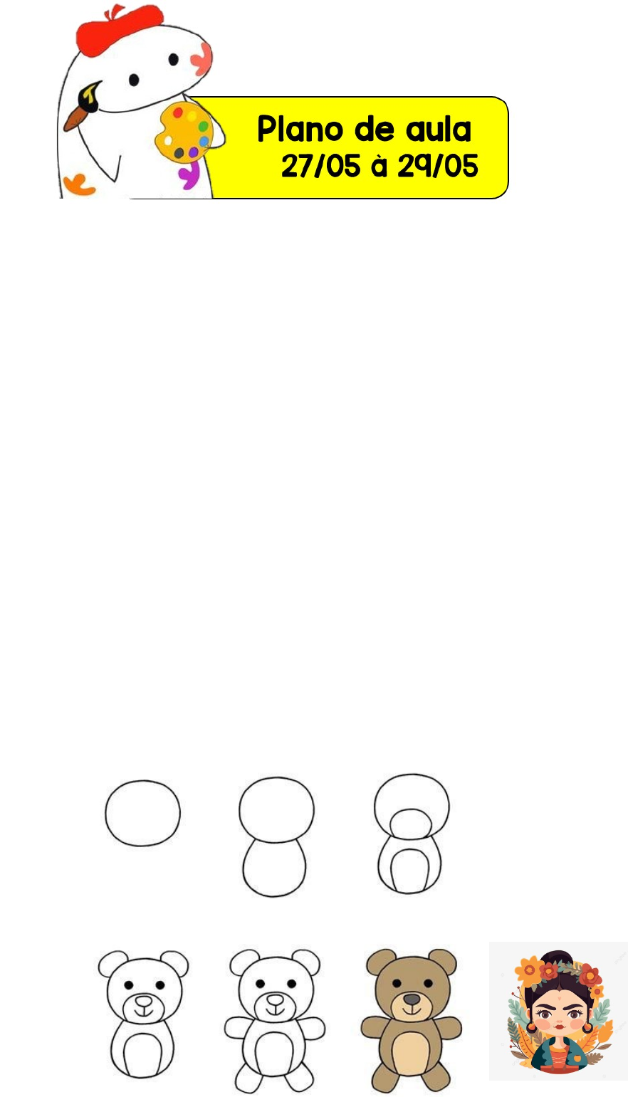 TURMA: 1°ano ao 5° ano Unidade temática: Artes visuais Objetos de conhecimento: Materialidades Conteúdo: Técnicas artísticas + Desenho com interferência Habilidades: (EF15AR04) Experimentar diferentes formas de expressão artística (desenho, pintura, colagem, quadrinhos, dobradura, escultura, modelagem, instalação, vídeo, fotografia etc.), fazendo uso sustentável de materiais, instrumentos, recursos e técnicas convencionais e não convencionais. Objetivos: Explorar as técnicas de desenho, pintura e colagem, utilizando diferentes tipos de materiais (grafite de diferentes gramaturas e densidades, carvão, giz de cera etc.), em diferentes suportes (papel, tecido, muro, chão etc.), de cores, formas, tamanho e texturas diferentes e compreender a diferença entre desenho de observação, desenho de memória e desenho de criação, para experimentar diversas possibilidades de uso de materiais e efeitos ao desenhar e desenvolver a observação, a memória e a imaginação. Metodologia: Oralidade e apresentação de diversos desenhos para comparação de antes e depois. Explicação de que para um desenho seja completado é necessário diversas orientações como: paciência, concentração, postura correta, assim, como os materiais. Proposta de realização de um desenho dirigido para colocar em prática a aprendizagem. image1.png image2.jpeg image3.jpeg image4.png