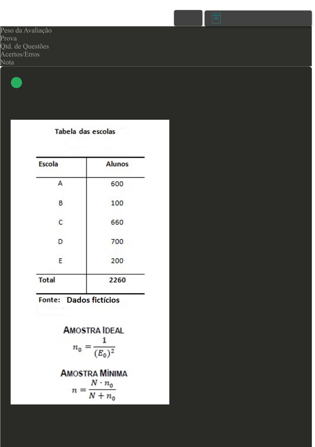 Prova Impressa GABARITO | Avaliação I - Individual (Cod.:990761) Peso da Avaliação 2,00 Prova 91995201 Qtd. de Questões 10 Acertos/Erros 10/0 Nota 10,00 Planeja-se realizar um estudo por amostragem para avaliar diversas características da população de estudantes de escolas públicas de determinada localidade. Utilizando a tabela a seguir, a Amostra Mínima (n) para essa população, tal que possamos admitir que o risco de estarmos errados não ultrapasse 4%, é de: A 660 alunos. B 568 alunos. VOLTAR A+ Alterar modo de visualização 1 14/11/2024, 17:32 Avaliação I - Individual about:blank 1/5 C 720 alunos. D 286 alunos. E 490 alunos. Arredondamentos são de fundamental importância para nossos estudos, principalmente ao calcular valores que têm muitas casas decimais. Muitas vezes, é conveniente suprimir unidades inferiores às de determinada ordem. Essa técnica é denominada arredondamento de dados ou valores. Com base na Resolução nº 886/66, do IBGE, qual o arredondamento por centésimo do número 8,4513? A 8,45. B 8,5. C 8,46. D 8,4. E 8,51. Numa pesquisa para uma eleição presidencial, qual deve ser o tamanho ideal de uma amostra aleatória para garantir um erro amostral não superior a 2%? Acerca do resultado, assinale a alternativa correta: A 5.000 eleitores. B 3.000 eleitores. C 2.000 eleitores. D 1.000 eleitores. E 2.500 eleitores. Em um levantamento amostral sobre determinada população de roedores, um acadêmico considerou um erro amostral de 6%. Com base nesse dado, ele calculou o valor da amostra ideal para esse levantamento como sendo, aproximadamente: 2 3 4 14/11/2024, 17:32 Avaliação I - Individual about:blank 2/5 Use: A 332 roedores. B 404 roedores. C 278 roedores. D 412 roedores. E 225 roedores. O método estatístico é composto de cinco fases: a coleta, a crítica, a apuração, a apresentação e a análise dos dados. Com relação à coleta de dados, analise as afirmativas a seguir: I. Os dados de nascimentos de crianças em uma cidade, no intervalo compreendido entre os anos de 2000 até 2023, são classificados como contínuos. II. O PISA é um exame internacional que avalia o sistema educacional de 65 países. Essa avaliação ocorre a cada três anos e, por isso, pode ser classificada como ocasional, por ser realizada em intervalos de tempo constantes. III. As pesquisas eleitorais realizadas pelo IBOPE são ocasionais. IV. Para a coleta de dados de um surto epidêmico de dengue, costuma-se utilizar a coleta ocasional. É correto o que se afirma em: A I, II e III, apenas. B II e III, apenas. C I, III e IV, apenas. D I, II e IV, apenas. E I, II, III e IV, apenas. Usamos o método estatístico quando é impossível fazer o uso do método experimental, visto que nem sempre temos controle dos fatores envolvidos para fixar seus valores. As fases do método estatístico são: coleta de dados, crítica dos dados, apuração dos dados, apresentação dos dados e análise dos resultados. Com relação a essas fases, analise as afirmativas a seguir: I. A crítica dos dados pode ser de origem externa ou interna. II. A apuração dos dados nada mais é do que a soma e o processamento dos dados obtidos e a sua disposição mediante critérios de classificação. III. A coleta direta de dados pode ser classificada com relação ao fator tempo, como: contínua, periódica, ocasional. 5 6 14/11/2024, 17:32 Avaliação I - Individual about:blank 3/5 IV. A última fase do trabalho estatístico é a apuração dos dados. É correto o que se afirma em: A I, II e IV, apenas. B I, III e IV, apenas. C I, II, III e IV. D I, II e III, apenas. E II, III e IV, apenas. Uma das primeiras etapas necessárias em Estatística é observar como vamos obter os dados depois de definido cuidadosamente o problema. Para isso, existem duas maneiras: usar dados secundários ou coletar os próprios dados. Com relação à coleta de dados, classifique V para as sentenças verdadeiras e F para as falsas: ( ) A coleta é indireta quando é inferida de elementos conhecidos e/ou do conhecimento de outros fenômenos relacionados com o fenômeno estudado. ( ) A coleta é direta quando obtida diretamente da fonte. ( ) A coleta direta de dados pode ser classificada com relação ao fator tempo, como: contínua, periódica ou ocasional. Assinale a alternativa que apresenta a sequência CORRETA: A V - F - V. B F - F - V. C V - V - F. D V - V - V. E F - F - F. Variável é o conjunto de resultados possíveis de um fenômeno, quando são feitas sucessivas medidas. São as características que podem ser observadas (ou medidas) em cada elemento da população. Com relação à classificação de variáveis estatísticas, classifique V para as sentenças verdadeiras e F para as falsas: ( ) A estatura de uma pessoa é uma variável quantitativa contínua. ( ) O peso de uma pessoa é uma variável qualitativa ordinal. ( ) A velocidade de um automóvel é uma variável quantitativa discreta. ( ) A cor de um automóvel é uma variável qualitativa nominal. Assinale a alternativa que apresenta a sequência correta: A V - F - V - F. B F - V - V - F. 7 8 14/11/2024, 17:32 Avaliação I - Individual about:blank 4/5 C V - F - F - V. D F - F - F - F. E F - F - F - V. O medicamento genérico é aquele que contém o mesmo princípio ativo do medicamento de referência. Na maioria das vezes, os medicamentos genéricos apresentam preços bem mais atrativos em relação ao medicamento de referência. Em determinada farmácia, certo medicamento é fabricado por três diferentes laboratórios, A, B e C. O laboratório B custa 20% menos que o laboratório A, e o custo do laboratório C é 10% menor que o laboratório B. Considerando que o medicamento em questão custe R$ 60,00 no laboratório A, quanto custa o mesmo medicamento no laboratório C? A R$ 48,40. B R$ 33,80. C R$ 44,20. D R$ 43,20. E R$ 48,00. Os estudos estatísticos estão relacionados às situações que envolvem planejamentos, coleta de dados, organizaç