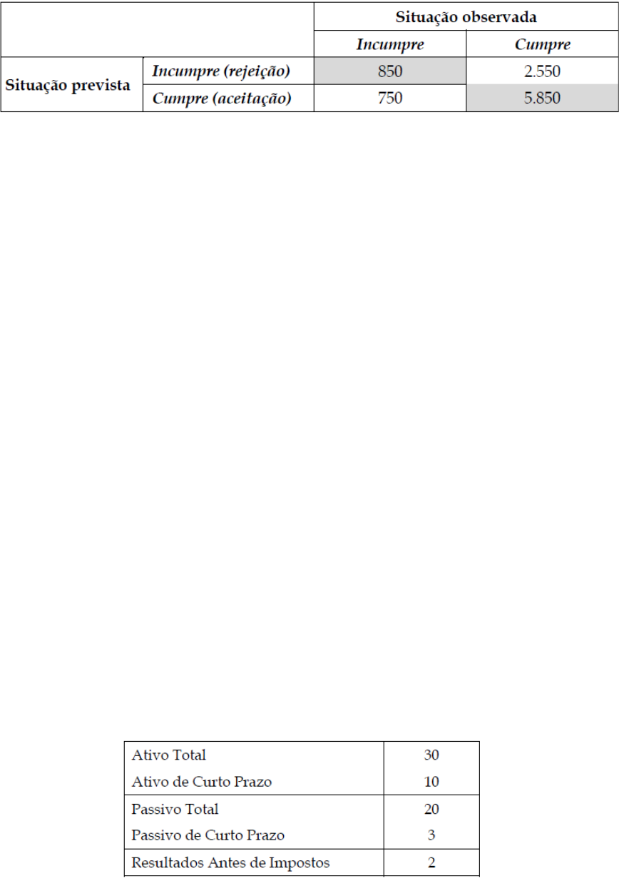Considere os seguintes resultados correspondentes às decisões de crédito do banco Holy Spirit ao segmento de empresas: 1. Determine a taxa de aceitação de Holy Spirit, a taxa de erro das avaliações de crédito e a taxa de falsos positivos. Interprete o último indicador. Resolução: Taxa de aceitação: 66% Taxa de erro: 33% Taxa de falsos positivos = negócios rentáveis desperdiçados: 30,35% 2. Como classifica as avaliações e decisões de crédito de Holy Spirit: boas ou más? Justifique. Resolução: A qualidade das decisões é muito fraca, pois o banco perde demasiadas oportunidades de negócio rentáveis (30,35%) para conseguir apenas identificar cerca de metade dos incumpridores (53,13%). 3. No sentido de melhorar as suas avaliações de crédito, Holy Spirit recorreu a vários métodos de exploração da informação histórica, tendo estimado a seguinte expressão algébrica para prever a falência individual de empresas: 𝑙𝑛 𝑌̂𝑖=− 2,65−0,042 𝑋1𝑖−0,305 𝑋2𝑖+0,189 𝑋3𝑖 𝑌̂ representa a estimativa dos rácio Bad/Good odds da empresa 𝑖 e 𝑋1, 𝑋2 e 𝑋3 correspondem, respetivamente, aos Resultados Antes de Impostos (em milhões), ao rácio (Ativo de Curto Prazo)/(Passivo Total) e ao rácio (Passivo de Curto Prazo)/(Ativo Total) dessa mesma empresa. 3.1 Determine a probabilidade de falência de uma empresa que no último exercício registou os seguintes indicadores (em milhões). Resolução: 𝑃𝐷̂𝑖=11+𝑒− (− 2,65 − 0,042 × 2 − 0,305 × 0,5 + 0,189 × 0,1) =5,3779% 3.2 Calcule a perda esperada dessa mesma empresa, correspondente a uma linha de crédito que lhe foi concedida por Holy Spirit, no valor de 150.000, sabendo que 80% deste valor está a ser utilizado e que, perante uma eventual situação de incumprimento da empresa, Holy Spirit espera ser capaz de conseguir recuperar 25% do crédito. (NB: caso não tenha resolvido a alínea anterior, admita que 𝑃𝐷=6%). Resolução: 𝐸𝐿=0,75×0,053779×150.000×0,8=4.840 A empresa 4ARC, à qual foi atribuído um crédito no valor de 10 milhões, exatamente por 2 anos e com uma taxa de juro de 5%, tem atualmente um rating Baa (Moody’s) e uma taxa de recuperação do crédito em caso de falência de 45%. O reembolso é ao par e as taxas de juro spot sem risco bem como os correspondentes credit spreads, são os seguintes: Considere a seguinte matriz de migração de ratings a 1 ano, semipreenchida. Com base nos dados anteriores, responda às seguintes questões: 1. Determine a. A taxa de default das empresas hoje com rating B b. A proporção de empresas hoje com rating Aaa que sofrem um downgrade de 2 níveis ao fim de 1 ano c. A percentagem de empresas com rating Caa com rating inalterado ao fim de 1 ano Resolução: a: 4,18% b: 0,65% c: 71,07% 2. Considerando um nível de confiança de 99%, determine o Credit Value at Risk de 4ARC no espaço de 1 ano: a. Utilizando a distribuição atual. Interprete o valor que obteve. b. Assumindo a distribuição normal. Resolução: Cálculos de valor (em milhões) Com a distribuição atual, obtém-se: 6,15 - (6,15 - 0,418) x 0,01 - 0,0018/0,0103 - 0,0018 = 620,649. Com a distribuição normal, o resultado é: CVaR = 2,326 x 0,2646 = 615 mil. Uma Instituição Financeira (IF) pretende proteger-se contra um possível default da empresa Risk, a quem concedeu um crédito de 1.000.000€ durante os próximos 2 anos. A informação relevante para o contrato é a seguinte: Sabe-se ainda que em caso de incumprimento, a IF consegue recuperar 68% do crédito concedido à empresa Risk e que a taxa de juro sem risco é de 1%. 1. Calcule a probabilidade de a empresa Risk entrar em default até ao fim do prazo do crédito. Resolução: 2. Calcule o prémio de um Credit Default Swap sobre esta empresa. Resolução: O prémio anual a pagar será então igual a: 0,005785×1.000.000=5.785 3. Admita que a empresa Risk entra em default durante o segundo ano. Represente os fluxos financeiros que terão lugar em cada ano, admitindo que a taxa de recuperação observada corresponde à prevista. Resposta: No primeiro ano o vendedor do CDS recebe 5.785, pagos pelo comprador de proteção (a IF). No segundo ano o vendedor recebe uma proporção dos 5.785 dependendo da quantidade de tempo até ao momento do default, mas como houve default tem que pagar ao comprador do CDS 0,32×1.000.000=320.000. image6.png image7.png image8.png image9.png image1.png image2.png image3.png image4.png image5.png