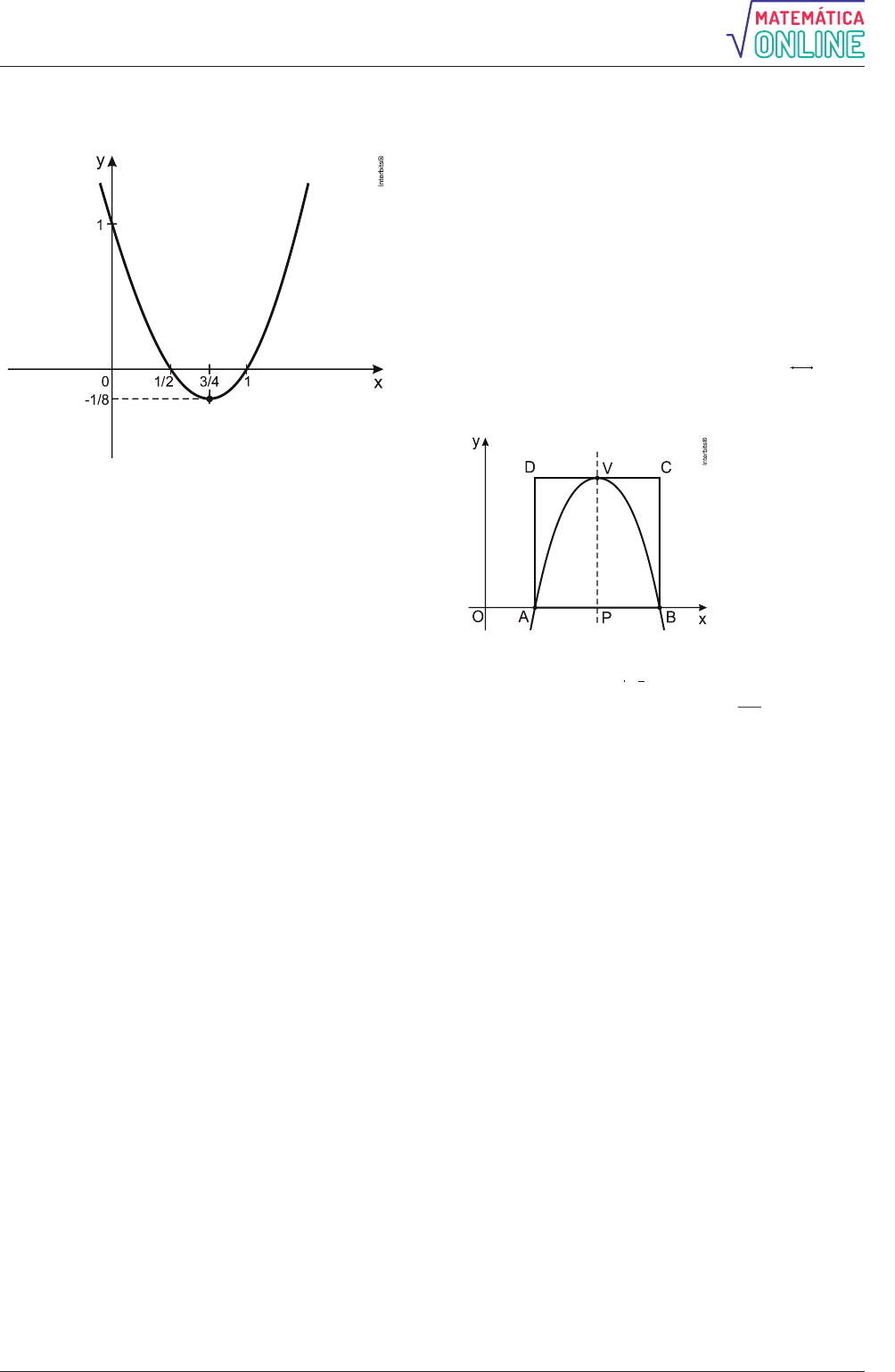 Alisson Marques-online 19 93. (G1 - cftmg 2013) A função real representada pelo gráfico é definida por a) 2f x 2x x 1. b) 2f x 2x 3x 1. c) 2f x x 3x 1. d) 2f x 2x 3x 1. 94. (G1 - ifba 2012) Jael, aluno do curso de Automação do IFBA, ao fazer uma experiência de Física, lançou um foguete obliquamente para cima. Ao fazê-lo, constatou que a equação da trajetória do foguete era 2y 3x 18x, em que y é a altura atingida pelo foguete para um deslocamento x, ambos em metros, na horizontal. Dessa forma, a altura máxima atingida pelo foguete foi: a) 20 b) 25 c) 27 d) 30 e) 31 95. (G1 - ifal 2012) Assinale a alternativa que completa corretamente a frase: “A função real f(x) = x2 – 4x + 5 a) não admite zeros reais”. b) atinge um valor máximo”. c) tem como gráfico uma reta”. d) admite dois zeros reais e diferentes”. e) atinge um valor mínimo igual a –1”. 96. (G1 - epcar (Cpcar) 2012) Considere a parábola que representa a igualdade 2y ax bx c, de eixo de simetria PV, e o quadrado ABCD indicados na figura abaixo. Sabendo-se que os pontos A e B pertencem à parábola e ao eixo Ox e sendo V o ponto onde a parábola tangencia o segmento DC, o valor de 2b 4ac é a) 4 b) 8 c) 16 d) 20 Alisson Marques-online 20 Gabarito: Resposta da questão 1: [E] Resposta da questão 2: [E] Resposta da questão 3: [B] Resposta da questão 4: [B] Resposta da questão 5: [D] Resposta da questão 6: [B] Resposta da questão 7: [D] Resposta da questão 8: [B] Resposta da questão 9: [B] Resposta da questão 10: [D] Resposta da questão 11: [B] Resposta da questão 12: [A] Resposta da questão 13: [A] Resposta da questão 14: [D] Resposta da questão 15: [D] Resposta da questão 16: [A] Resposta da questão 17: [A] Resposta da questão 18: [C] Resposta da questão 19: [B] Alisson Marques-online 21 Resposta da questão 20: [C] Resposta da questão 21: [E] Resposta da questão 22: [B] Resposta da questão 23: [A] Resposta da questão 24: [B] Resposta da questão 25: [E] Resposta da questão 26: [C] Resposta da questão 27: [D] Resposta da questão 28: [C] Resposta da questão 29: [B] Resposta da questão 30: [C] Resposta da questão 31: [E] Resposta da questão 32: [C] Resposta da questão 33: [D] Resposta da questão 34: [A] Resposta da questão 35: [C] Resposta da questão 36: [B] Resposta da questão 37: [B] Resposta da questão 38: [D]