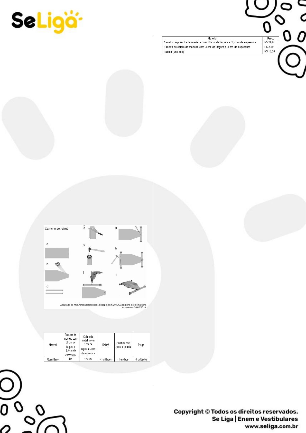 Lista de Exercícios: Matemática | Matemática Básica Página 4 de 32 15. (G1 - cp2 2020) A dinâmica e a estratégia nas partidas de basquete mudaram bastante ao longo dos últimos anos. Atualmente, as equipes tentam mais arremessos de 3 pontos (quando o arremesso é feito antes da “linha de 3 pontos”) do que antigamente. Um exemplo dessa estratégia observou-se numa das partidas finais da liga de basquete norte-americana, a NBA (National Basketball Association), disputada entre as equipes Toronto Raptors e Golden State Warriors. Nessa partida, as duas equipes efetuaram, juntas, 74 arremessos de 3 pontos. Do total desses arremessos, 22 do Golden State Warriors foram errados; do Toronto Raptors, 24 foram errados. Ao longo da partida, as duas equipes juntas totalizaram, nesse tipo de arremesso, a) 75 pontos. b) 84 pontos. c) 87 pontos. d) 90 pontos. 16. (G1 - cotuca 2020) Carrinho de rolimã é um dos brinquedos tradicionais de criança. A figura a seguir ilustra os procedimentos para a confecção de um carrinho. Para confeccionar um carrinho, são necessários: Custo dos materiais na loja: Considere as tabelas apresentadas e calcule o custo mínimo do material necessário para confeccionar um carrinho. a) R$ 88,10 b) R$ 87,10 c) R$ 39,10 d) R$ 48,10 e) R$ 59,10 17. (G1 - cotuca 2020) Uma loja de eletrodomésticos possui uma matriz e onze filiais. Ela comprou 200 televisores idênticos para serem distribuídos igualmente entre as 12 lojas, ficando a matriz também com o resto da divisão. O número de televisores destinados à matriz equivale a: a) 16 b) 18 c) 20 d) 22 e) 24 18. (G1 - cmrj 2020) A direção do Colégio Militar do Rio de Janeiro contratou uma empresa com o objetivo de construir uma nova sala para o Clube Literário. A sala terá 3,36 m de largura e 4,00 m de comprimento. No piso, o pedreiro vai colocar peças de cerâmica quadradas, do mesmo tamanho. Admitindo-se que não haverá perda de material, a menor quantidade dessas peças, que ele vai usar para cobrir completamente o piso, é um número a) ímpar e menor que 500. b) múltiplo de 10. c) maior que 570. d) igual a 525. e) primo. 19. (G1 - cmrj 2020) Uma quadra de tênis apresenta as seguintes medidas: Lista de Exercícios: Matemática | Matemática Básica Página 5 de 32 Para fazer as linhas de marcação (faixas brancas) da quadra, foi usada uma fita branca que adere ao chão. Essa fita, com 5 cm de largura, é vendida em rolos de diferentes metragens, conforme as figuras (meramente ilustrativas). Como houve o mínimo de sobra, que modelo de fita foi utilizado? a) modelo 1 b) modelo 2 c) modelo 3 d) modelo 4 e) modelo 5 20. (G1 - cmrj 2020) Dona Ivani vendia ovos de galinhas caipiras na feira. Em um dia de bastante movimento, dois alunos do Colégio Militar, distraídos com uma conversa animada, esbarraram em sua barraca, derrubando-a e quebrando todos os ovos. Os dois, prontamente, pediram desculpas e se ofereceram para pagar o prejuízo de dona Ivani. A senhora, muito simpática, lembrou-se dos seus tempos de estudante e do quanto se divertia com os desafios matemáticos. Então, propôs aos dois um problema aritmético: “O número total de ovos quebrados foi maior que 200 e menor que 400. Se eu contar de dois em dois, de três em três, de quatro em quatro, de cinco em cinco e de seis em seis, sempre sobrará um. Mas se eu contar de sete em sete, não sobrará nenhum. Eu vendo 7 ovos por R$ 8,50. Quanto vocês me devem ao todo pelos ovos quebrados?” a) R$ 325,00 b) R$ 340,00 c) R$ 365,50 d) R$ 370,00 e) R$ 385,00 21. (G1 - cmrj 2020) Rodrigo escreveu a sequência dos n primeiros números inteiros positivos (1, 2, 3, , n). Em seguida, retirou um desses números e calculou a média aritmética dos restantes, obtendo 92 . 9 Sendo assim, o número retirado é a) 4 b) 5 c) 6 d) 7 e) 8 22. (G1 - cftrj 2020) Uma professora propôs como desafio para sua turma de 7º ano simplificar a fração: 1 2 3 2 4 6 4 8 12 7 14 21 1 3 5 2 6 10 4 12 20 7 21 35 + + + + + + Depois de alguns minutos, três alunos fizeram as seguintes afirmações: I. O resultado na simplificação é um número inteiro. II. O resultado da simplificação é 2 . 5 III. O resultado da simplificação é 5. Sobre as afirmações, é correto dizer que: a) Todas são falsas. b) Duas são verdadeiras. c) Apenas uma é verdadeira. d) Todas são verdadeiras. 23. (G1 - cotuca 2020) Calcule o valor de X, sabendo que a 2020= e b 2018.= Lista de Exercícios: Matemática | Matemática Básica Página 6 de 32 4 4 2 2 2 2 a b a b 2 2X 4a 8ab 4b − + = + + a) 116 b) 1 8 c) 1 4 d) 1 2 e) 1 24. (G1 - ifmt 2020) Desenvolva o produto notável: 3 x 1 5 4 − a) 3 2x 3 3 1 x x 125 100 80 64 − + − b) 3 2x 3 3 1 x x 125 100 80 64 − − + c) 3 2x 3 3 1 x x 125 100 80 64 + + − d) 3 2x 3 3 1 x x 125 100 80 64 − − − e) 3 2x 3 3 1 x x 125 100 80 64 + − + 25. (G1 - ifpe 2020) Os produtos notáveis podem ser utilizados para facilitar o cálculo de expressões numéricas, por exemplo: 2 251 49 (50 1)(50 1) 50 1 2500 1 2499. = + − = − = − = Na conta acima, podemos aplicar o produto notável, 2 2a b (a b)(a b).− = + − Com a ajuda dos produtos notáveis, determine, aproximadamente, o valor de x na seguinte equação: 2 2 2x 6.400.000 6.400.002+ = a) 5.000 b) 8.000 c) 2 d) 400 e) 20 26. (G1 - ifmt 2020) O valor de x na seguinte expressão 3 3 81 72 x 3( 3 2 2) − = − é: a) 0 b) 72 c) 3 d) 1 e) 81 27. (G1 - cftmg 2020) Se x y 4,+ = então 3 2 2 2P x x y x y= + + − é equivalente à expressão algébrica a) 3x 16− b) 3x 8+ c) 23x 2x 1+ − d) 24x 8x 16+ − 28. (G1 - cp2 2019) André trabalha no Centro do Rio de Janeiro e almoça de segunda a sexta-feira nos restaurantes da região. Certo dia, ele encontrou um restaurante self service que oferecia duas modalidades de pagamento: - R$ 29,90 “coma à vontade” (valor fixo, sem pesar o prato) ou - R$ 46,00 por quilo (valor depende do consumo aferido na balança). Para a segunda modalidade de pa