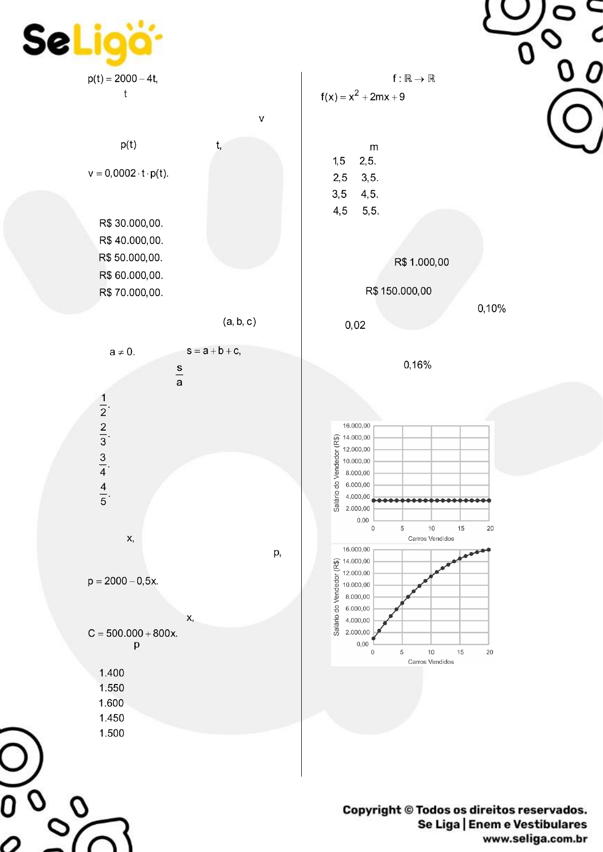 Lista de Exercícios: Matemática | Álgebra Página 14 de 39 em que é o tempo, em dias, que falta para a respectiva data. Considere que a quantidade vendida em cada um desses dias varia em função do preço e do tempo segundo a expressão O valor arrecadado por essa companhia no dia em que a quantidade vendida é máxima é igual a a) b) c) d) e) 66. (Unicamp 2016) Seja uma progressão geométrica de números reais com Definindo o menor valor possível para é igual a a) b) c) d) 67. (Fgv 2016) A quantidade mensalmente vendida em toneladas, de certo produto, relaciona-se com seu preço por tonelada em reais, através da equação O custo de produção mensal em reais desse produto é função da quantidade em toneladas produzidas mediante a relação O preço que deve ser cobrado para maximizar o lucro mensal é: a) b) c) d) e) 68. (Uece 2016) No plano, com o sistema de coordenadas cartesianas usual, o gráfico da função definida por é uma parábola que tangencia o eixo das abcissas, e um de seus pontos com ordenada igual a 9 tem abcissa negativa. Nessas condições, o valor do parâmetro está entre a) e b) e c) e d) e 69. (Insper 2016) O salário mensal de um vendedor de carros de luxo é composto por um valor fixo de mais um valor de comissões sobre os carros vendidos, que custam cada um. O percentual de comissão inicia em e sobe ponto percentual para cada carro que ele consegue vender. Por exemplo, se ele vende 3 carros em um mês, sua comissão será de por carro, sobre o preço dos carros. Dos gráficos a seguir, qual é aquele que melhor representa a relação entre o número de carros vendidos e o salário mensal do vendedor? a) b) Lista de Exercícios: Matemática | Álgebra Página 15 de 39 c) d) e) 70. (Mackenzie 2016) Os gráficos de e se interceptam em a) apenas um ponto. b) dois pontos. c) três pontos. d) quatro pontos. e) nenhum ponto. 71. (Mackenzie 2016) Se é definida por então a) o gráfico de é uma parábola. b) o conjunto imagem de י c) é uma função injetora. d) é uma função sobrejetora. e) é crescente para e, decrescente para 72. (Fgv 2016) Em 2013, uma empresa exportou mil dólares e, em 2014, exportou mil dólares de um certo produto. Suponha que o gráfico das exportações ( em milhares de dólares) em função do ano seja formado por pontos colineares. Desta forma, a exportação triplicará em relação à de 2013 no ano de a) b) c) d) e) 73. (Insper 2016) Uma academia de ginástica mediu os batimentos cardíacos em repouso (BCR) de 9 novos matriculados. Além disso, cada um teve que responder quantas horas de exercício costuma fazer por semana Essas duas informações foram registradas no gráfico a seguir, que também indica uma reta com o padrão ideal esperado de BCR em função de Dos alunos com BCR acima do padrão ideal esperado para a sua prática semanal de exercícios, aquele que está mais afastado do valor ideal ultrapassou o padrão esperado em a) batimentos por minuto. b) batimentos por minuto. c) batimentos por minuto. d) batimentos por minuto. e) batimentos por minuto. 74. (Fgv 2016) No plano cartesiano, a área do polígono determinado pelo sistema de inequações Lista de Exercícios: Matemática | Álgebra Página 16 de 39 é igual a a) b) c) d) e) 75. (Espm 2016) O gráfico abaixo mostra a variação do número de unidades vendidas de uma certa mercadoria conforme o preço cobrado por unidade. Comparando-se as situações descritas pelos pontos e podemos concluir que: a) O aumento no preço unitário causou uma queda de nas unidades vendidas. b) Embora tenha havido uma queda nas vendas, o aumento do preço unitário causou um acréscimo de na receita. c) Com o aumento do preço unitário, a receita sofreu uma queda de d) Com o aumento do preço unitário, a receita diminuiu em e) Mesmo com o aumento do preço unitário, a receita não se alterou. 76. (Fgv 2016) Observe o gráfico da função no plano cartesiano. Dentre as expressões apresentadas nas alternativas a seguir, a única que pode corresponder à lei da função é a) b) c) d) e) 77. (Unesp 2016) No gráfico estão representadas as curvas típicas de velocidade de crescimento, em cm/ano, em função da idade, em anos, para meninos e meninas de 0 a 20 anos de idade. Estão indicados, também, para os dois gêneros, trechos de aceleração e desaceleração do crescimento e os pontos de início do estirão da adolescência e de término de crescimento.