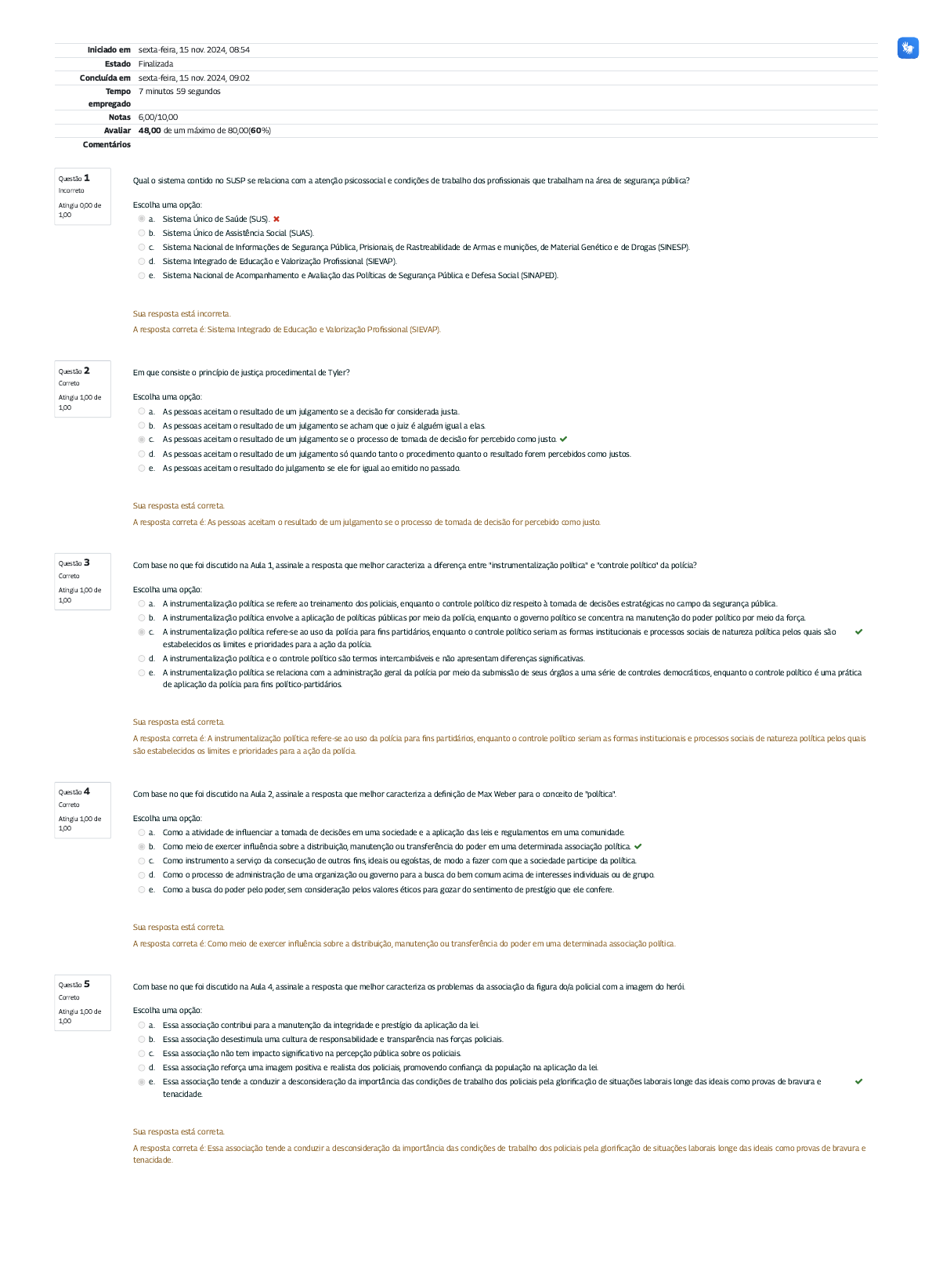 Questão 1 Incorreto Atingiu 0,00 de 1,00 Questão 2 Correto Atingiu 1,00 de 1,00 Questão 3 Correto Atingiu 1,00 de 1,00 Questão 4 Correto Atingiu 1,00 de 1,00 Questão 5 Correto Atingiu 1,00 de 1,00 Iniciado em sexta-feira, 15 nov. 2024, 08:54 Estado Finalizada Concluída em sexta-feira, 15 nov. 2024, 09:02 Tempo empregado 7 minutos 59 segundos Notas 6,00/10,00 Avaliar 48,00 de um máximo de 80,00(60%) Comentários Qual o sistema contido no SUSP se relaciona com a atenção psicossocial e condições de trabalho dos pro�ssionais que trabalham na área de segurança pública? Escolha uma opção: a. Sistema Único de Saúde (SUS). b. Sistema Único de Assistência Social (SUAS). c. Sistema Nacional de Informações de Segurança Pública, Prisionais, de Rastreabilidade de Armas e munições, de Material Genético e de Drogas (SINESP). d. Sistema Integrado de Educação e Valorização Pro�ssional (SIEVAP). e. Sistema Nacional de Acompanhamento e Avaliação das Políticas de Segurança Pública e Defesa Social (SINAPED). Sua resposta está incorreta. A resposta correta é: Sistema Integrado de Educação e Valorização Pro�ssional (SIEVAP). Em que consiste o princípio de justiça procedimental de Tyler? Escolha uma opção: a. As pessoas aceitam o resultado de um julgamento se a decisão for considerada justa. b. As pessoas aceitam o resultado de um julgamento se acham que o juiz é alguém igual a elas. c. As pessoas aceitam o resultado de um julgamento se o processo de tomada de decisão for percebido como justo. d. As pessoas aceitam o resultado de um julgamento só quando tanto o procedimento quanto o resultado forem percebidos como justos. e. As pessoas aceitam o resultado do julgamento se ele for igual ao emitido no passado. Sua resposta está correta. A resposta correta é: As pessoas aceitam o resultado de um julgamento se o processo de tomada de decisão for percebido como justo. Com base no que foi discutido na Aula 1, assinale a resposta que melhor caracteriza a diferença entre "instrumentalização política" e "controle político" da polícia? Escolha uma opção: a. A instrumentalização política se refere ao treinamento dos policiais, enquanto o controle político diz respeito à tomada de decisões estratégicas no campo da segurança pública. b. A instrumentalização política envolve a aplicação de políticas públicas por meio da polícia, enquanto o governo político se concentra na manutenção do poder político por meio da força. c. A instrumentalização política refere-se ao uso da polícia para �ns partidários, enquanto o controle político seriam as formas institucionais e processos sociais de natureza política pelos quais são estabelecidos os limites e prioridades para a ação da polícia. d. A instrumentalização política e o controle político são termos intercambiáveis e não apresentam diferenças signi�cativas. e. A instrumentalização política se relaciona com a administração geral da polícia por meio da submissão de seus órgãos a uma série de controles democráticos, enquanto o controle político é uma prática de aplicação da polícia para �ns político-partidários. Sua resposta está correta. A resposta correta é: A instrumentalização política refere-se ao uso da polícia para �ns partidários, enquanto o controle político seriam as formas institucionais e processos sociais de natureza política pelos quais são estabelecidos os limites e prioridades para a ação da polícia. Com base no que foi discutido na Aula 2, assinale a resposta que melhor caracteriza a de�nição de Max Weber para o conceito de "política". Escolha uma opção: a. Como a atividade de in�uenciar a tomada de decisões em uma sociedade e a aplicação das leis e regulamentos em uma comunidade. b. Como meio de exercer in�uência sobre a distribuição, manutenção ou transferência do poder em uma determinada associação política. c. Como instrumento a serviço da consecução de outros �ns, ideais ou egoístas, de modo a fazer com que a sociedade participe da política. d. Como o processo de administração de uma organização ou governo para a busca do bem comum acima de interesses individuais ou de grupo. e. Como a busca do poder pelo poder, sem consideração pelos valores éticos para gozar do sentimento de prestígio que ele confere. Sua resposta está correta. A resposta correta é: Como meio de exercer in�uência sobre a distribuição, manutenção ou transferência do poder em uma determinada associação política. Com base no que foi discutido na Aula 4, assinale a resposta que melhor caracteriza os problemas da associação da �gura do/a policial com a imagem do herói. Escolha uma opção: a. Essa associação contribui para a manutenção da integridade e prestígio da aplicação da lei. b. Essa associação desestimula uma cultura de responsabilidade e transparência nas forças policiais. c. Essa associação não tem impacto signi�cativo na percepção pública sobre os policiais. d. Essa associação reforça uma imagem positiva e realista dos policiais, promovendo con�ança da população na aplicação da lei. e. Essa associação tende a conduzir a desconsideração da importância das condições de trabalho dos policiais pela glori�cação de situações laborais longe das ideais como provas de bravura e tenacidade. Sua resposta está correta. A resposta correta é: Essa associação tende a conduzir a desconsideração da importância das condições de trabalho dos policiais pela glori�cação de situações laborais longe das ideais como provas de bravura e tenacidade. Questão 6 Incorreto Atingiu 0,00 de 1,00 Questão 7 Correto Atingiu 1,00 de 1,00 Questão 8 Incorreto Atingiu 0,00 de 1,00 Questão 9 Incorreto Atingiu 0,00 de 1,00 Questão 10 Correto Atingiu 1,00 de 1,00 Com base no que foi discutido na Aula 2, assinale a resposta que melhor caracteriza os principais perigos 