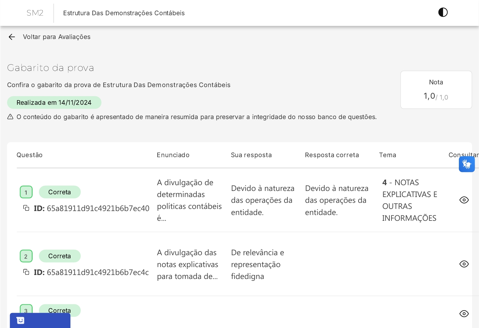 Voltar para Avaliações Gabarito da prova Confira o gabarito da prova de Estrutura Das Demonstrações Contábeis Realizada em 14/11/2024 Nota 1,0/ 1,0 O conteúdo do gabarito é apresentado de maneira resumida para preservar a integridade do nosso banco de questões. Questão Enunciado Sua resposta Resposta correta Tema Consultar Correta ID: 65a81911d91c4921b6b7ec40 A divulgação de determinadas políticas contábeis é... Devido à natureza das operações da entidade. Devido à natureza das operações da entidade. 4 - NOTAS EXPLICATIVAS E OUTRAS INFORMAÇÕES Correta ID: 65a81911d91c4921b6b7ec4c A divulgação das notas explicativas para tomada de... De relevância e representação fidedigna. De relevância e representação fidedigna. 4 - NOTAS EXPLICATIVAS E OUTRAS INFORMAÇÕES Correta No processo de aplicação das Quando substancialmente Quando substancialmente 4 - NOTAS EXPLICATIVAS E 1 2 3 SM2 Estrutura Das Demonstrações Contábeis Feedback https://estacio.saladeavaliacoes.com.br/avaliacoes/ ID: 659ed948d91c4921b6adab94 políticas contábeis d... todos os riscos e benefíci... todos os riscos e benefíci... OUTRAS INFORMAÇÕES Correta ID: 65a81911d91c4921b6b7ec04 De acordo com o que estabelece a Lei n º 6.404/76,... Divulgar os principais critérios de avaliação dos ... Divulgar os principais critérios de avaliação dos ... 4 - NOTAS EXPLICATIVAS E OUTRAS INFORMAÇÕES Correta ID: 659ed948d91c4921b6adab9a Como é conhecido o relatório que gera informações ... Relatório de sustentabilidade. Relatório de sustentabilidade. 4 - NOTAS EXPLICATIVAS E OUTRAS INFORMAÇÕES Correta ID: 659ed948d91c4921b6adab4c Representa entidade ou pessoa considerada parte re... Uma sociedade da qual a companhia detenha direitos... Uma sociedade da qual a companhia detenha direitos... 5 - MENSURAÇÕES DE ATIVOS E PASSIVOS E DEMONSTRAÇÕES DE RESULTADO Correta ID: 65a81911d91c4921b6b7eb50 De acordo com a NBC TG 26 (R5), o conjunto complet... Demonstração das origens e aplicações dos recursos... Demonstração das origens e aplicações dos recursos... 5 - MENSURAÇÕES DE ATIVOS E PASSIVOS E 4 5 6 7 DEMONSTRAÇÕES DE RESULTADO Correta ID: 659ed948d91c4921b6adab5e Provisões, passivos contingentes e ativos conting... I e II, apenas. I e II, apenas. 5 - MENSURAÇÕES DE ATIVOS E PASSIVOS E DEMONSTRAÇÕES DE RESULTADO Correta ID: 65a81911d91c4921b6b7eb80 Dados extraídos da contabilidade da Cia. H S/A em ... 668.316,00 668.316,00 5 - MENSURAÇÕES DE ATIVOS E PASSIVOS E DEMONSTRAÇÕES DE RESULTADO Correta ID: 66fe001cd559ecc48866a667 R$ ... R$ 365.000 R$ 365.000 5 - MENSURAÇÕES DE ATIVOS E PASSIVOS E DEMONSTRAÇÕES DE RESULTADO 8 9 10 Encontrou algum problema? Você pode copiar o ID da questão e abrir um requerimento. Na tela inicial do Campus Virtual �SIA�, acesse "Atendimento > Requerimento > Novo > Currículo/Aula/horário > Analisar ambiente de avaliação/exercícios"