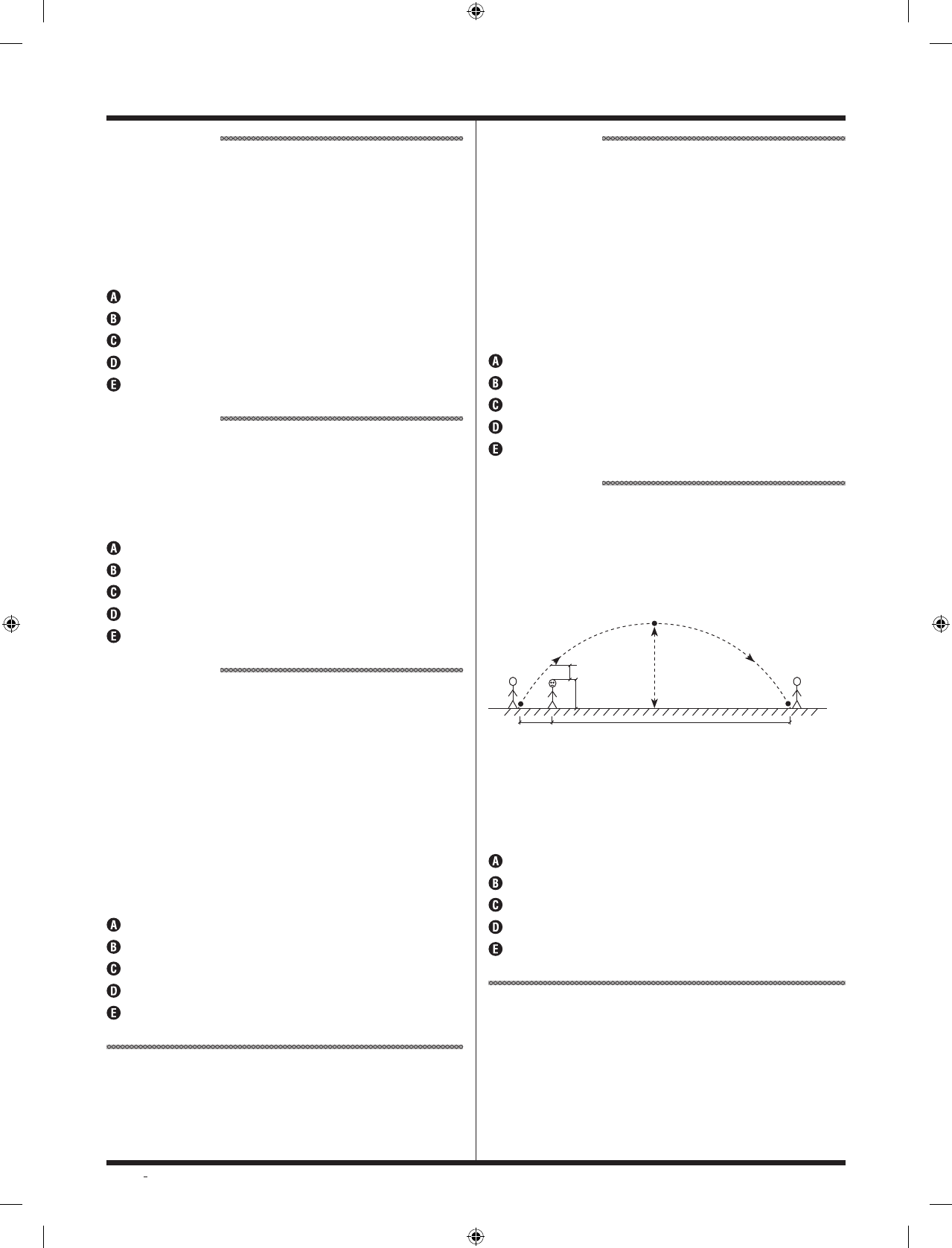 MT – 2o dia | Caderno 1 - Amarelo - Página 32 QUESTÃO 79 A renda per capita de um país é a razão entre seu PIB (Produto Interno Bruto) e sua população. A população chinesa, em 2009, representava 19,7% da população mundial. Nesse ano, o PIB chinês foi de 4,9 trilhões de dólares e a renda per capita chinesa foi de 3.620 dólares. Com base nesses dados, conclui-se que, dentre os números abaixo, o mais próximo da população mundial, em 2009, é: 5,6 · 109. 6,8 · 109. 7,2 · 109. 5,6 · 1012. 6,8 · 1012. QUESTÃO 80 A superfície do planeta Terra é constituída de 30% de terra e 70% de água. Um terço da terra é pastagem, floresta, ou montanha, e dois quintos da terra são desertos ou cobertos por gelo; o resto da terra é usado para o cultivo. Qual é o percentual da superfície total do planeta que é usada para o cultivo? 4%. 6%. 8%. 12%. 18%. QUESTÃO 81 O prefeito de uma cidade deseja construir uma rodovia para dar acesso a outro município. Para isso, foi aberta uma licitação na qual concorreram duas empresas. A primeira cobrou R$100.000,00 por km construído (n), acrescidos de um valor fixo de R$350.000,00, enquanto a segunda cobrou R$120.000,00 por km construído (n), acrescidos de um valor fixo de R$150.000,00. As duas empresas apresentam o mesmo padrão de qualidade dos serviços prestados, mas apenas uma delas poderá ser contratada. Do ponto de vista econômico, qual equação possibilitaria encontrar a extensão da rodovia que tornaria indiferente para a prefeitura escolher qualquer uma das propostas apresentadas? 100n + 350 = 120n + 150. 100n + 150 = 120n + 350. 100(n + 350) = 120(n + 150). 100(n + 350.000) = 120(n + 150.000). 350(n + 100.000) = 150(n + 120.000). QUESTÃO 82 Em certa cidade, acontece anualmente uma corrida, como parte dos eventos comemorativos pela sua emancipação política. Em 2000, o comitê organizador da corrida permitiu a participação de 1.500 pessoas; e, em 2005, a participação de 1.800 pessoas. Devido às condições de infraestrutura da cidade, o comitê decidiu limitar o número de participantes na corrida. Nesse sentido, estudos feitos concluíram que o número máximo n(t) de participantes, no ano t, seria dado pela função afim n(t) = at + b, em que a e b são constantes. Com base nessas informações, conclui-se que, no ano de 2010, o número máximo de participantes na corrida será de: 1.900. 2.100. 2.300. 2.500. 2.700. QUESTÃO 83 Em uma partida de futebol, um jogador, estando na lateral do campo, cruzou a bola para um companheiro de equipe o qual se encontrava na lateral oposta, a uma distância de 64 m. A bola passou 1,20 m acima da cabeça de um jogador, com 1,80 m de altura, da equipe adversária, o qual, nesse instante, estava a 4 m de distância do jogador que realizou o cruzamento, conforme figura abaixo. gramado 60 m4 m Amáx1,20 m 1,80 m Nessa situação, a bola descreveu uma trajetória em forma de arco de parábola até tocar o gramado, quando foi dominada pelo companheiro de equipe. Com base nessas informações, conclui-se que, durante o cruzamento, a bola atinge, no máximo, uma altura de: 12,8 m. 12 m. 11,2 m. 10,4 m. 9,6 m.