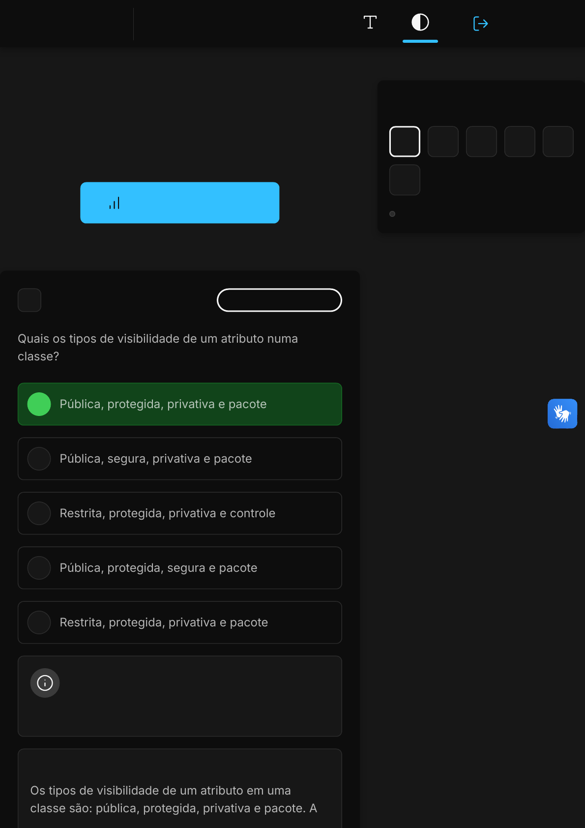Você acertou 0 de 6 questões Verifique o seu desempenho e continue treinando! Você pode refazer o exercício quantas vezes quiser. Verificar Desempenho A B C D E 1 Marcar para revisão Quais os tipos de visibilidade de um atributo numa classe? Pública, protegida, privativa e pacote Pública, segura, privativa e pacote Restrita, protegida, privativa e controle Pública, protegida, segura e pacote Restrita, protegida, privativa e pacote Questão não respondida Opa! A alternativa correta é a letra A. Confira o gabarito comentado! Gabarito Comentado Os tipos de visibilidade de um atributo em uma classe são: pública, protegida, privativa e pacote. A Questão 1 de 6 Em branco �6� 1 2 3 4 5 6 Exercicio Utilizando Uml Para Projetar o Software Sair A B C D E visibilidade pública permite que o atributo seja acessado de qualquer lugar. A visibilidade protegida permite que o atributo seja acessado apenas dentro da mesma classe ou por subclasses. A visibilidade privativa restringe o acesso ao atributo apenas à classe onde ele foi declarado. Por fim, a visibilidade de pacote permite que o atributo seja acessado apenas por classes que estão no mesmo pacote. 2 Marcar para revisão Qual dos passos abaixo não diz respeito à criação de um diagrama de interação: Determine o caso de uso que será modelado e identifique suas operações. Para cada operação, identifique os objetos que farão parte da sua interação. Identifique as classes de análise que serão modeladas no projeto. Identifique as conexões e relacionamentos entre eles e, em seguida, categorize-os. Identifique a sequência de fluxos de mensagens na interação entre os objetos. Questão não respondida Opa! A alternativa correta é a letra C. Confira o gabarito comentado! Gabarito Comentado A alternativa correta é: "Identifique as classes de análise que serão modeladas no projeto". Isso porque a criação de um diagrama de interação envolve a A B C D E identificação de casos de uso, operações, objetos envolvidos na interação, conexões e relacionamentos entre eles, e a sequência de fluxos de mensagens. No entanto, a identificação das classes de análise que serão modeladas no projeto não é um passo diretamente relacionado à criação de um diagrama de interação, mas sim a uma etapa posterior do processo de modelagem. 3 Marcar para revisão Qual das frases abaixo não tem relação com o conceito de componente? Um componente é representado por um quadrado contendo o nome de sua função. Um componente é uma caixa preta e representa um artefato. Um componente tem vida autônoma. Um componente oferece e requer serviços. Os componentes fazem uso de estereótipos. Questão não respondida Opa! A alternativa correta é a letra A. Confira o gabarito comentado! Gabarito Comentado A resposta correta é a que afirma: "Um componente é representado por um quadrado contendo o nome de sua função". No entanto, essa afirmação não está correta. O conceito de componente não está relacionado à sua representação gráfica, mas sim à A B C D E sua funcionalidade e ao papel que desempenha em um sistema. Um componente é uma unidade modular e independente que realiza uma função específica dentro de um sistema maior. Ele pode ser uma "caixa preta", ou seja, um artefato cujo funcionamento interno não é conhecido ou relevante para o restante do sistema, pode ter vida autônoma, pode oferecer e requerer serviços e pode fazer uso de estereótipos. 4 Marcar para revisão O que é um diagrama de implementação? É um conjunto de elementos que define como o sistema funciona. É um conjunto de elementos que define a estrutura de módulos de um sistema. É um conjunto de elementos que define o ambiente do sistema. É um conjunto de elementos que define a arquitetura de execução dos sistemas. É um conjunto de elementos que define o processo de execução do sistema. Questão não respondida Opa! A alternativa correta é a letra D. Confira o gabarito comentado! Gabarito Comentado O diagrama de implementação é um componente do UML �Unified Modeling Language) que é usado para modelar a arquitetura física de um sistema. Ele A B C D E descreve a organização do hardware e como o software é mapeado para o hardware. 5 Marcar para revisão O que é uma associação no diagrama de implantação? Ligações que mostram como os sistemas estão relacionados. Ligações que mostram como os sistemas fazem suas interfaces. Ligações que mostram como os sistemas interagem com o mundo externo. Ligações que mostram como os sistemas fazem uso de uma camada única de comunicação. Ligações que mostram como os sistemas se comunicam e trocam informações. Questão não respondida Opa! A alternativa correta é a letra E. Confira o gabarito comentado! Gabarito Comentado No contexto de um diagrama de implantação, uma associação é representada por ligações que mostram como os sistemas se comunicam e trocam informações. Isso significa que a associação é a representação da comunicação entre diferentes sistemas, permitindo a troca de dados e informações. Portanto, a alternativa correta descreve exatamente A B C D E essa função de uma associação em um diagrama de implantação. 6 Marcar para revisão No diagrama de componentes temos as interfaces. Estas são operações que especificam serviços de um componente. Assinale a alternativa que indica o que elas descrevem: O comportamento do software na interação com outros sistemas O comportamento do software visível externamente As associações de um software A lista de serviços de um software O comportamento interno do software Questão não respondida Opa! A alternativa correta é a letra B. Confira o gabarito comentado! Gabarito Comentado As interfaces em um diagrama de componentes descrevem o comportamento do software que é visível externamente. Isso significa que elas definem como o software se comporta e interage com outros componentes ou si