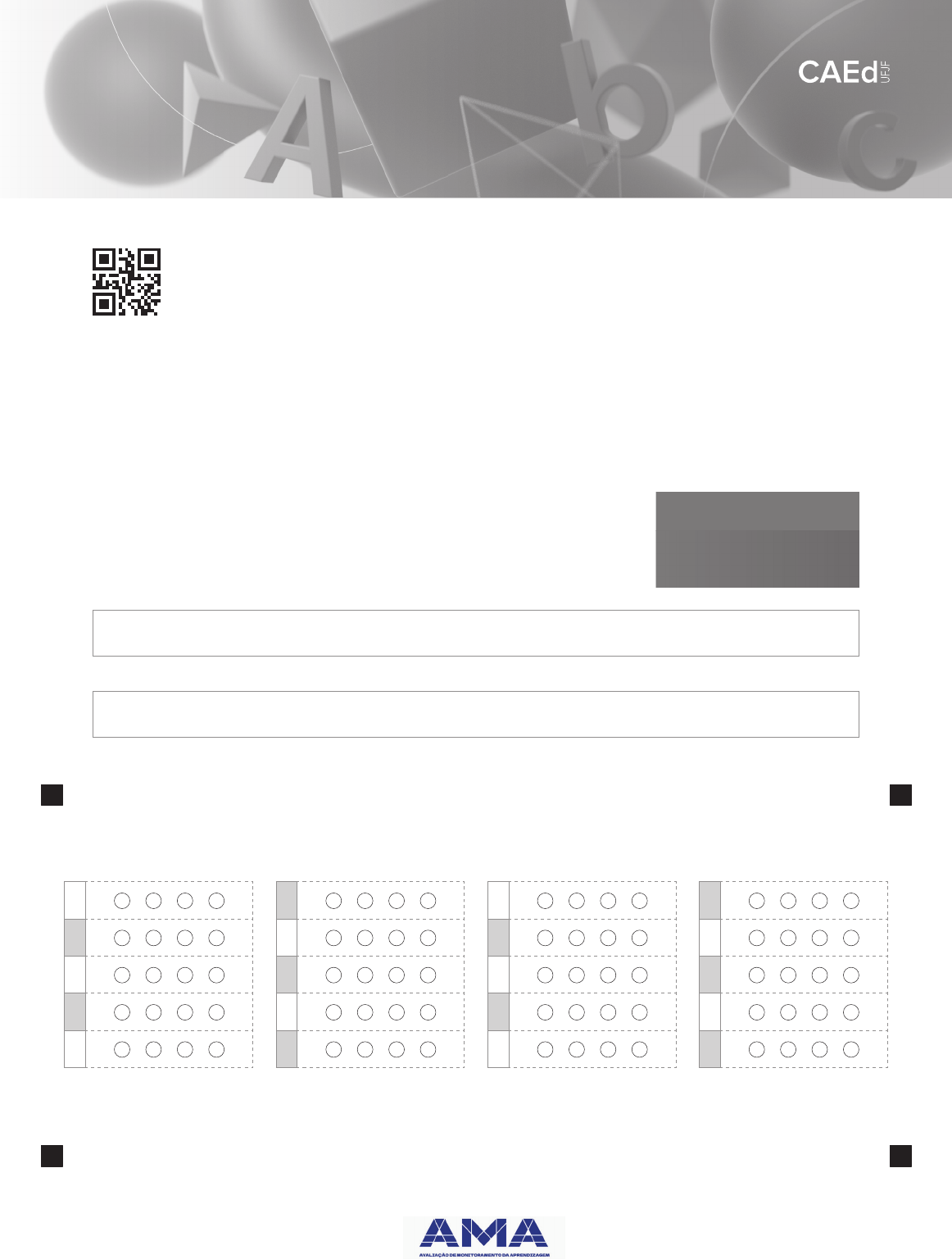 CADERNO Nome do(a) estudante Turma do(a) estudante M 0 5 0 1 AMA - AVALIAÇÃO DE MONITORAMENTO DA APRENDIZAGEM 2024 - 3º TRIMESTRE 2024 1958M0501 5º ano do Ensino Fundamental MATEMÁTICA 44003300333344005522 01 DCBA 02 DCBA 03 DCBA 04 DCBA 05 DCBA 06 DCBA 07 DCBA 08 DCBA 09 DCBA 10 DCBA 11 DCBA 12 DCBA 13 DCBA 14 DCBA 15 DCBA 16 DCBA 17 DCBA 18 DCBA 19 DCBA 20 DCBA BL01M05 01) (M00087279) Joana fez samosas, que são pequenos pastéis de origem indiana. Ela organizou as samosas em 4 recipientes, colocando 56 samosas em cada um dos recipientes. Quantas samosas Joana fez, ao todo? A) 242. B) 224. C) 168. D) 60. 02) (M00087292) Observe a figura, em cinza, apresentada na malha quadriculada abaixo. 1 cm 1 cm Essa figura foi ampliada de forma que seu perímetro foi multiplicado por 3. A figura resultante dessa ampliação está apresentada em A) 1 cm 1 cm B) 1 cm 1 cm C) 1 cm 1 cm D) 1 cm 1 cm 03) (M00087288) Uma lanchonete vende um combo com um sanduíche e um suco. Para montar um combo, o cliente deve escolher 1 entre 12 sabores diferentes de sucos e 1 entre 6 tipos diferentes de sanduíches. No máximo, de quantas formas diferentes um cliente pode montar um combo nessa lanchonete? A) 2. B) 6. C) 18. D) 72. M0501 1 BL01M05 04) (M00087275) Uma confeitaria possui um cardápio de culinária africana e afro-brasileira. Malik encomendou, desse cardápio, 1 554 qumbes, um tipo de doce africano típico da Somália, e 2 188 pérolas negras, um tipo de doce afro-brasileiro. Qual foi o total de doces encomendados por Malik? A) 1 434. B) 3 632. C) 3 742. D) 4 111. 05) (M00087286) Cada unidade de determinado produto custa R$ 2,75. Roberta comprou 12 unidades desse produto. Qual foi o preço total que Roberta pagou por esses produtos? A) R$ 21,90. B) R$ 33,00. C) R$ 42,00. D) R$ 82,50. 06) (M00087280) Em uma papelaria, dois cadernos custam R$ 16,00. Selma comprou 8 cadernos nessa papelaria. Quantos reais Selma pagou, ao todo, pelos 8 cadernos? A) R$ 24,00. B) R$ 44,00. C) R$ 64,00. D) R$ 128,00. M0501 2 BL01M05 07) (M00087291) Observe a figura, em cinza, na malha quadriculada abaixo. 1 cm 1 cm Essa figura sofreu uma redução, de forma que seus lados foram reduzidos à metade. A figura, após essa redução, está apresentada em A) 1 cm 1 cm B) 1 cm 1 cm C) 1 cm 1 cm D) 1 cm 1 cm 08) (M00087289) Caroline foi a uma loja que confecciona jalecos. A vendedora disse que ela deveria escolher 1 entre 3 tipos de tecidos e 1 entre 18 formatos de letras para bordar o nome dela no bolso do jaleco. Qual é a quantidade máxima de possibilidades que Caroline tem para escolher seu jaleco? A) 18. B) 21. C) 42. D) 54. 09) (M00087276) Uma loja de instrumentos africanos tinha 2 015 berimbaus disponíveis em seu estoque, quando foram adquiridos 1 118 novos berimbaus. Essa loja ficou com quantos berimbaus disponíveis em seu estoque após a aquisição dos novos berimbaus? A) 1 103. B) 3 123. C) 3 133. D) 3 151. M0501 3 BL01M05 10) (M00087284) Viviane comprou três esculturas da “Cultura Mulher Negra” e pagou, no total, R$ 177,99. Cada escultura custou o mesmo preço. Qual é o valor que Viviane pagou em cada escultura? A) R$ 59,33. B) R$ 59,99. C) R$ 533,79. D) R$ 593,30. 11) (M00087281) Clara comprou uma caixa com 4 divisórias para guardar seus 84 esmaltes. Os esmaltes foram distribuídos igualmente nas divisórias. Quantos esmaltes foram colocados em cada divisória? A) 12. B) 21. C) 42. D) 80. 12) (M00087294) Observe a figura apresentada na malha quadriculada abaixo. 1 cm 1 cm As medidas dos lados dessa figura serão reduzidas pela metade. O que vai acontecer com a medida da área dessa figura após essa redução? A) Diminuirá em 4 vezes. B) Diminuirá em 2 vezes. C) Aumentará em 4 vezes. D) Aumentará em 2 vezes. 13) (M00087290) Uma gráfica fabrica etiquetas personalizadas, com diferentes formatos e cores. Ao todo, essa gráfica possui 5 opções de formatos e 3 opções de cores, sendo que cada etiqueta possui uma única cor. Qual é a quantidade máxima de etiquetas diferentes que podem ser confeccionadas nessa gráfica? A) 6. B) 8. C) 15. D) 16. M0501 4 BL01M05 14) (M00087278) Renata possui 43 bijuterias de cor dourada e 27 de cor prata. Quantas bijuterias de cor dourada Renata tem a mais do que as de cor prata? A) 16. B) 24. C) 26. D) 70. 15) (M00087283) Carla confeccionou 205 pulseiras. Em cada pulseira, ela utilizou 0,4 metro de fio de silicone. Quantos metros de fio de silicone Carla utilizou na confecção dessas pulseiras? A) 512. B) 205. C) 82. D) 80. 16) (M00087282) Em uma fábrica de doces, 204 bombons foram produzidos e, em seguida, embalados em caixas. Em cada caixa, foram colocados 2 bombons. Quantas caixas foram usadas para embalar todos os bombons produzidos? A) 12. B) 21. C) 102. D) 202. 17) (M00087293) Edna desenhou a primeira letra do seu nome em uma malha quadriculada em que cada quadradinho representa uma unidade de área. Em seguida, ela fez uma ampliação desse desenho, conforme a figura abaixo. Desenho inicial Desenho ampliado A medida da área do desenho ampliado, em relação à medida da área do desenho inicial, foi multiplicada por A) 2. B) 4. C) 45. D) 50. M0501 5 BL01M05 18) (M00087287) Mariana participará de um desfile em comemoração ao Dia da Consciência Negra, no dia 20 de novembro. Ela poderá escolher 1 dos modelos de roupa e 1 dos penteados ilustrados abaixo. Modelos de roupa Modelos de penteado De quantas maneiras diferentes, no máximo, Mariana pode se arrumar para esse desfile, escolhendo 1 modelo de roupa e 1 modelo de penteado? A) 24. B) 11. C) 9. D) 6. 19) (M00087277) Sueli comprou uma cartela com 30 ovos. Ao preparar um bolo, com recheio e cobertura, ela utilizou 13 ovos dessa cartela. Quantos ovos restaram nessa cartela? A) 13. B) 17. C) 23. D) 27. 20) (M00087285) Um grupo de 8 amigos foi a uma pizzaria. O valor total da conta foi de R$ 326,40. Eles dividiram igualmente o valor total da conta entre todos os amigos do grupo. Quantos reais cada amigo pagou? A)