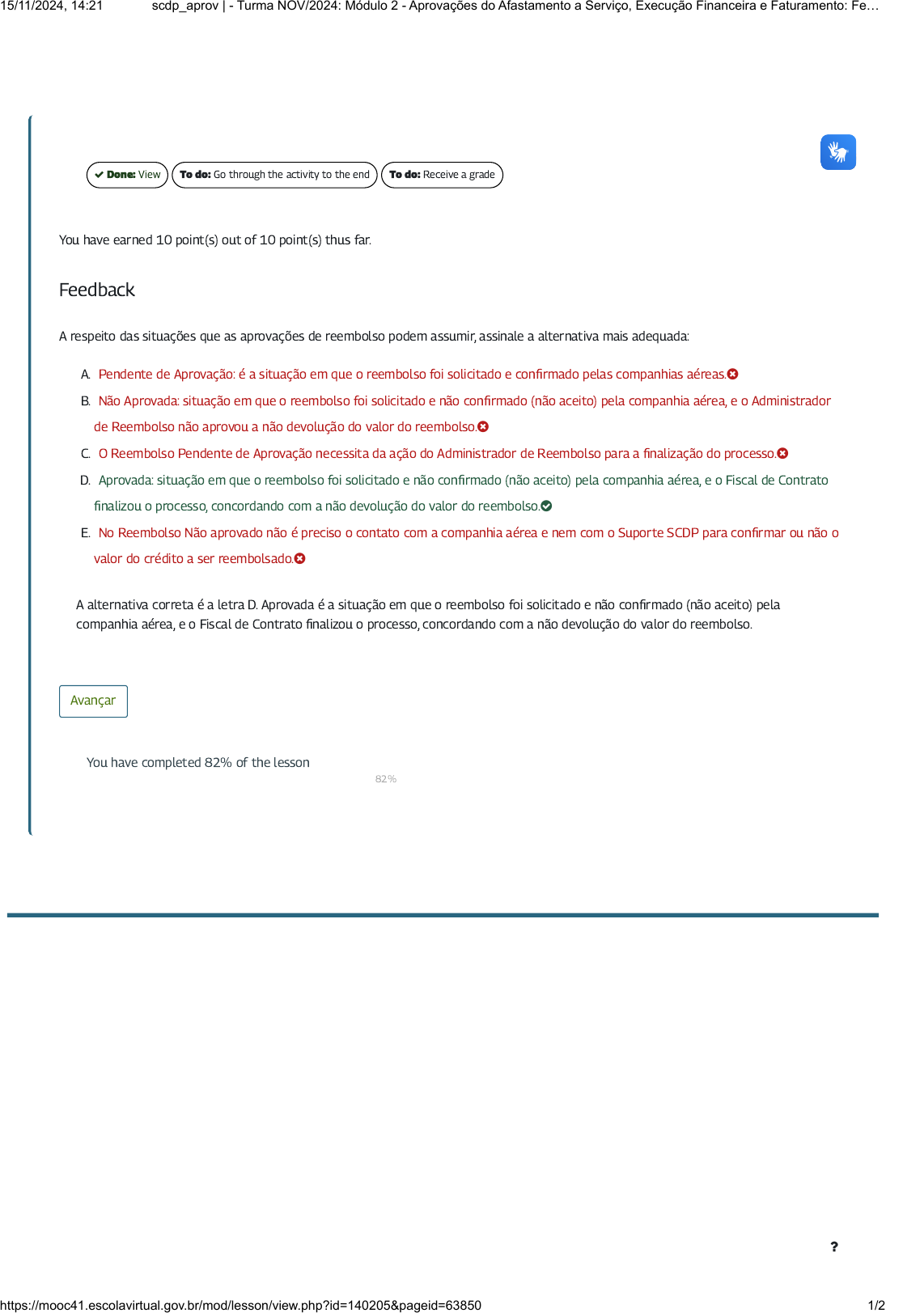 You have earned 10 point(s) out of 10 point(s) thus far. Feedback A respeito das situações que as aprovações de reembolso podem assumir, assinale a alternativa mais adequada: A. Pendente de Aprovação: é a situação em que o reembolso foi solicitado e con�rmado pelas companhias aéreas. B. Não Aprovada: situação em que o reembolso foi solicitado e não con�rmado (não aceito) pela companhia aérea, e o Administrador de Reembolso não aprovou a não devolução do valor do reembolso. C. O Reembolso Pendente de Aprovação necessita da ação do Administrador de Reembolso para a �nalização do processo. D. Aprovada: situação em que o reembolso foi solicitado e não con�rmado (não aceito) pela companhia aérea, e o Fiscal de Contrato �nalizou o processo, concordando com a não devolução do valor do reembolso. E. No Reembolso Não aprovado não é preciso o contato com a companhia aérea e nem com o Suporte SCDP para con�rmar ou não o valor do crédito a ser reembolsado. A alternativa correta é a letra D. Aprovada é a situação em que o reembolso foi solicitado e não con�rmado (não aceito) pela companhia aérea, e o Fiscal de Contrato �nalizou o processo, concordando com a não devolução do valor do reembolso. Avançar You have completed 82% of the lesson 82% Done: View To do: Go through the activity to the end To do: Receive a grade 15/11/2024, 14:21 scdp_aprov | - Turma NOV/2024: Módulo 2 - Aprovações do Afastamento a Serviço, Execução Financeira e Faturamento: Fe… https://mooc41.escolavirtual.gov.br/mod/lesson/view.php?id=140205&pageid=63850 1/2 15/11/2024, 14:21 scdp_aprov | - Turma NOV/2024: Módulo 2 - Aprovações do Afastamento a Serviço, Execução Financeira e Faturamento: Fe… https://mooc41.escolavirtual.gov.br/mod/lesson/view.php?id=140205&pageid=63850 2/2