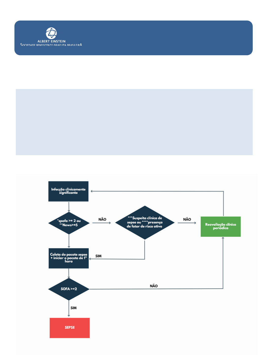 1. TRIAGEM Todos os pacientes com infecção clinicamente relevante que apresentem qualquer um dos escores ou itens abaixo: • Escore News ≥ 5 ou 3 exclusivo; (2) • qSOFA positivo; • Suspeita clínica de sepse (sinais clínicos de disfunção orgânica nova, como hipotensão arterial, saturação de oxigênio baixa pela oximetria de pulso, dispneia com aumento da necessidade de oxigênio/suporte respiratório, alteração do nível de consciência ou oligúria) [3]; • Presença de quaisquer fatores de risco ativos (imunossupressão, quimioterapia, hepatopatia grave) devem ter o protocolo de sepse aberto imediatamente, com a coleta do Pacote Sepse. Guia do Episódio de Cuidado Protocolo Gerenciado de Sepse e Choque Séptico para o Diagnóstico e Tratamento A sepse é definida pela presença de uma infecção associada a uma disfunção orgânica nova determinada pelo Sequential Sepsis-related Organ Failure Assessment - Escore SOFA ≥ 2. Para o diagnóstico de choque séptico, utiliza-se como critério a presença de hipotensão arterial com necessidade de vasopressor para manter pressão arterial média ou igual a 65 mmHg e lactato sérico acima de 18 mg/dL, após reposição volêmica adequada (1). I- ASSISTENCIAL Fluxograma de atendimento inicial dos pacientes com suspeita de sepse 2. ESCORES O escore SOFA, desenvolvido para a avaliação inicial e progressiva de disfunções orgânicas deve ser calculado após coleta dos exames do protocolo sepse. O qSOFA é considerado positivo quando há pelo menos dois dos seguintes critérios clínicos: • Frequência respiratória maior ou igual a 22 incursões por minuto; • Alteração do nível de consciência (escore segundo a Escala de Coma de Glasgow menor do que 15); • Pressão arterial sistólica menor ou igual a 100 mmHg. O NEWS 2 (National Early Warning Score) baseia-se na alteração de sinais vitais como um alerta de risco de deterioração do estado de saúde do paciente. Esses escores são ferramentas de simples acesso que avaliam padrões fisiológicos e podem ser utilizados à beira do leito, avaliando o risco de deterioração clínica e alertando a necessidade de maior atenção ao estado de saúde do paciente. 0 1 2 3 4 Pa 02/FiO2 ≥ 400 300 a 399 200 a 299 100 a 199 15 ou Noradrenalina ² >0,1 Tabela 1. SOFA Tabela 2. NEWS Pacote de 1 hora: Deve ser garantida a coleta de lactato sérico (dentro de 30 minutos), coleta de culturas e início de antibiótico endovenoso apropriado dentro de 1 hora. Os pacientes que apresentem hipotensão arterial ou hipoperfusão tecidual (lactato sérico maior ou igual que 36 mg/dL), devem receber expansão volêmica inicial com, no mínimo, 1000 ml de cristaloides em 1 hora (4), preferencialmente soro Ringer lactato. Deve-se atentar também, adicionalmente ao início da antibioticoterapia, à necessidade de procedimentos cirúrgicos para controlar o foco da infecção se indicado, como drenagem de abscessos, retirada de dispositivos invasivos, desbridamentos de feridas, dentre outros. Pacote de 6 horas: Os pacientes que não apresentem estabilidade hemodinâmica sustentada após a expansão volêmica inicial ou tiverem lactato inicial maior ou igual a 36 mg/dL, devem ser conduzidos dentro do PACOTE DE 6 HORAS (5). Este perfil de pacientes está contido nos critérios de alocação em Unidade de Terapia Intensiva. Nesse pacote, após expansão volêmica inicial, deve-se reavaliar constantemente o paciente para definir nova necessidade de expansão volêmica adicional, com 500-1000 ml de cristaloides, conforme a presença de sinais de má perfusão periférica (sinais vitais, tempo de enchimento capilar > 3 segundos, extremidades frias ou presença de livedo) e/ou hipotensão arterial. Vale lembrar que a Surviving Sepsis Campaign preconiza a expansão volêmica nas primeiras 3 horas com 30 ml/Kg de cristaloides (5) 3. EXAMES DO PACOTE SEPSE: Bilirrubinas totais e frações, culturas apropriadas (ao menos dois pares de hemoculturas) gasometria com lactato arterial ou venoso, glicemia, hemograma com plaquetas, PCR, tempo de protrombina, ureia e creatinina. 5. APOIO A DECISÃO 5.1- UNIDADES DE PRONTO ATENDIMENTO Para facilitar o processo sugerimos a utilização da ferramenta de apoio a decisão deflagrada pelo Millenium que traz informações relevantes do paciente, e de acordo com o provável infeccioso provável, sugere opções de antibioticoterapia, além da expansão volêmica, exames e cuidados. O profissional pode aceitar ou não as sugestões de atendimento, no entanto em caso de recusa, uma justificativa deve ser preenchida no prontuário eletrônico. 5.2 UNIDADES DE INTERNAÇÃO e DEPARTAMENTO DE PACIENTES GRAVES No momento da prescrição de antibioticoterapia, o Millenium buscará critérios de disfunção orgânica e irá sugerir a coleta do pacote sepse, facilitando o processo e o acréscimo automatizado dos itens a serem coletados. II. INDICADORES DE QUALIDADE • Taxa de adesão ao pacote sepse nas UPAs • Taxa de mortalidade hospitalar por sepse e choque séptico • Taxa de eventos adversos com dano grave ou catastrófico relacionados à Sepse III. GLOSSÁRIO 4. TRATAMENTO SOFA: avaliação sequencial de falência orgânica PaO2: pressão arterial de oxigênio FiO2: fração inspirada de oxigênio PCR: proteína C reativa V. REFERÊNCIAS 1. The Third International Consensus Definitions for Sepsis and Septic Shock (Sepsis-3). Singer M, Deutschman CS, Seymour CW, Shankar-Hari M, Annane D, Bauer M, Bellomo R, Bernard GR, Chiche JD, Coopersmith CM, Hotchkiss RS, Levy MM, Marshall JC, Martin GS, Opal SM, Rubenfeld GD, van der Poll T, Vincent JL, Angus DC. JAMA. 2016 Feb 23;315(8):801-10 2. National Early Warning Score (NEWS) 2: Standardising the assessment of acute-illness severity in the NHS. Royal College of Physicians; 2017 [cited 2019 Jan 02]. Available from: Available from: https://www.rcplondon.ac.uk/projects/outputs/national- early-warning-score-news-2 3. Machado FR