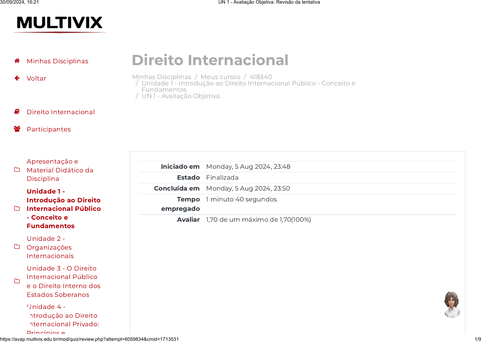 Minhas Disciplinas / Meus cursos / 418340 / Unidade 1 - Introdução ao Direito Internacional Público - Conceito e Fundamentos / UN 1 - Avaliação Objetiva Direito Internacional Iniciado em Monday, 5 Aug 2024, 23:48 Estado Finalizada Concluída em Monday, 5 Aug 2024, 23:50 Tempo empregado 1 minuto 40 segundos Avaliar 1,70 de um máximo de 1,70(100%) Minhas Disciplinas Voltar Direito Internacional Participantes Apresentação e Material Didático da Disciplina Unidade 1 - Introdução ao Direito Internacional Público - Conceito e Fundamentos Unidade 2 - Organizações Internacionais Unidade 3 - O Direito Internacional Público e o Direito Interno dos Estados Soberanos Unidade 4 - Introdução ao Direito Internacional Privado: Princípios e 30/09/2024, 16:21 UN 1 - Avaliação Objetiva: Revisão da tentativa https://avap.multivix.edu.br/mod/quiz/review.php?attempt=6059834&cmid=1713531 1/9 https://avap.multivix.edu.br/my/ https://avap.multivix.edu.br/course/view.php?id=29244 https://avap.multivix.edu.br/course/view.php?id=29244§ion=2 https://avap.multivix.edu.br/mod/quiz/view.php?id=1713531 https://avap.multivix.edu.br/my/ https://avap.multivix.edu.br/course/view.php?id=29244 https://avap.multivix.edu.br/user/index.php?id=29244 https://avap.multivix.edu.br/course/view.php?id=29244§ion=1 https://avap.multivix.edu.br/course/view.php?id=29244§ion=2 https://avap.multivix.edu.br/course/view.php?id=29244§ion=3 https://avap.multivix.edu.br/course/view.php?id=29244§ion=4 https://avap.multivix.edu.br/course/view.php?id=29244§ion=5 https://avap.multivix.edu.br/ https://avap.multivix.edu.br/ https://avap.multivix.edu.br/ https://avap.multivix.edu.br/ https://avap.multivix.edu.br/ https://avap.multivix.edu.br/ https://avap.multivix.edu.br/ https://avap.multivix.edu.br/ https://avap.multivix.edu.br/ https://avap.multivix.edu.br/ Questão 1 Correto Atingiu 0,34 de 0,34 Foram criadas algumas teorias a respeito dos fundamentos do Direito Internacional Público, entre elas, uma diz que é constituída pelo estudo que justi�ca o fundamento do Direito Internacional na vontade dos Estados, uma vontade comum nascida da união dessas vontades particulares apta a cumprir a norma internacional. A característica refere-se a teoria Escolha uma opção: a. jusnaturalista b. da autoeliminação c. interpretativa d. voluntarista e. sociológica Minhas Disciplinas Voltar Direito Internacional Participantes Apresentação e Material Didático da Disciplina Unidade 1 - Introdução ao Direito Internacional Público - Conceito e Fundamentos Unidade 2 - Organizações Internacionais Unidade 3 - O Direito Internacional Público e o Direito Interno dos Estados Soberanos Unidade 4 - Introdução ao Direito Internacional Privado: Princípios e 30/09/2024, 16:21 UN 1 - Avaliação Objetiva: Revisão da tentativa https://avap.multivix.edu.br/mod/quiz/review.php?attempt=6059834&cmid=1713531 2/9 https://avap.multivix.edu.br/my/ https://avap.multivix.edu.br/course/view.php?id=29244 https://avap.multivix.edu.br/user/index.php?id=29244 https://avap.multivix.edu.br/course/view.php?id=29244§ion=1 https://avap.multivix.edu.br/course/view.php?id=29244§ion=2 https://avap.multivix.edu.br/course/view.php?id=29244§ion=3 https://avap.multivix.edu.br/course/view.php?id=29244§ion=4 https://avap.multivix.edu.br/course/view.php?id=29244§ion=5 https://avap.multivix.edu.br/ https://avap.multivix.edu.br/ https://avap.multivix.edu.br/ https://avap.multivix.edu.br/ https://avap.multivix.edu.br/ https://avap.multivix.edu.br/ https://avap.multivix.edu.br/ https://avap.multivix.edu.br/ https://avap.multivix.edu.br/ https://avap.multivix.edu.br/ Questão 2 Correto Atingiu 0,34 de 0,34 Leia o trecho de uma matéria publicada no Jornal O Globo, em abril de 2019: “O presidente dos Estados Unidos, Donald Trump , prometeu nesta sexta- feira revogar o status dos Estados Unidos de signatário do Tratado sobre Comércio de Armas (TCA), a�rmando que pedirá ao Senado que não rati�que o pacto assinado pelo seu antecessor, o democrata Barack Obama. O anúncio foi feito durante a reunião anual da Associação Nacional do Ri�e (NRA), forte opositora ao tratado, que proíbe que os governos trans�ram armas convencionais e munições para países em que elas poderão ser utilizadas em situações que violem os direitos humanos [...].” Fonte: https://oglobo.globo.com/mundo/trump-anuncia-que-vai-retirar-eua- de-tratado-internacional-sobre-comercio-de-armas-23624974 Considerando o exposto, é correto a�rmar que o tratado mencionado é regulado pelo Direito Escolha uma opção: a. Empresarial b. Internacional Público c. Administrativo d. Público Minhas Disciplinas Voltar Direito Internacional Participantes Apresentação e Material Didático da Disciplina Unidade 1 - Introdução ao Direito Internacional Público - Conceito e Fundamentos Unidade 2 - Organizações Internacionais Unidade 3 - O Direito Internacional Público e o Direito Interno dos Estados Soberanos Unidade 4 - Introdução ao Direito Internacional Privado: Princípios e 30/09/2024, 16:21 UN 1 - Avaliação Objetiva: Revisão da tentativa https://avap.multivix.edu.br/mod/quiz/review.php?attempt=6059834&cmid=1713531 3/9 https://oglobo.globo.com/mundo/trump-anuncia-que-vai-retirar-eua-de-tratado-internacional-sobre-comercio-de-armas-23624974 https://oglobo.globo.com/mundo/trump-anuncia-que-vai-retirar-eua-de-tratado-internacional-sobre-comercio-de-armas-23624974 https://avap.multivix.edu.br/my/ https://avap.multivix.edu.br/course/view.php?id=29244 https://avap.multivix.edu.br/user/index.php?id=29244 https://avap.multivix.edu.br/course/view.php?id=29244§ion=1 https://avap.multivix.edu.br/course/view.php?id=29244§ion=2 https://avap.multivix.edu.br/course/view.php?id=29244§ion=3 https://avap.multivix.edu.br/course/view.php?id=29244§ion=4 https://avap.multivix.edu.br/course/view.php?id=29244§ion=5 https://avap.multivix.edu.br/ https://avap.multivix.edu.br/ https://avap.multivix