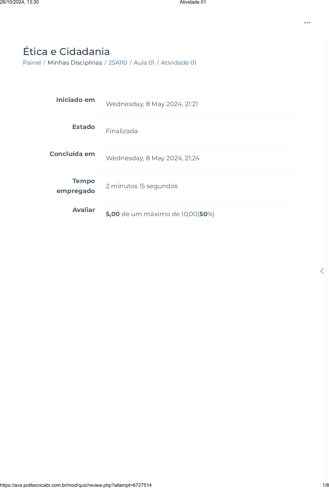 Painel / Minhas Disciplinas / 25A110 / Aula 01 / Atividade 01 Ética e Cidadania Iniciado em Wednesday, 8 May 2024, 21:21 Estado Finalizada Concluída em Wednesday, 8 May 2024, 21:24 Tempo empregado 2 minutos 15 segundos Avaliar 5,00 de um máximo de 10,00(50%) 26/10/2024, 13:30 Atividade 01 https://ava.politecnicabr.com.br/mod/quiz/review.php?attempt=6727514 1/8 https://ava.politecnicabr.com.br/my/ https://ava.politecnicabr.com.br/my/ https://ava.politecnicabr.com.br/course/view.php?id=993 https://ava.politecnicabr.com.br/course/view.php?id=993#section-2 https://ava.politecnicabr.com.br/mod/quiz/view.php?id=27063 https://ava.politecnicabr.com.br/ Questão 1 Correto Atingiu 1,50 de 1,50 Tratando-se da nova comunidade, marque a única resposta correta. Escolha uma opção: a. O homem continua em evolução, mas o legado que deixa à humanidade jovem e às gerações futuras é muito preocupante. b. Nos dias atuais, cada vez mais nossa integração, nossa governabilidade tem sido comandada virtualmente, portanto somos guiados de longe. c. Hoje, o novo sentido de comunidade e de valor implica uma leitura do indivíduo em seu espaço vivido. d. A Idade Média caracterizou-se pelo regime feudal, baseado na rígida hierarquia de suseranos, vassalos e servos. 26/10/2024, 13:30 Atividade 01 https://ava.politecnicabr.com.br/mod/quiz/review.php?attempt=6727514 2/8 https://ava.politecnicabr.com.br/ Questão 2 Incorreto Atingiu 0,00 de 1,50 Podemos sintetizar que o ser humano vive em grupos para, exceto a opção: Escolha uma opção: a. Desenvolver suas necessidades, pois, mesmo depois de adulto, depende de estudos e casos verídicos que comprovam que a vida em sociedade é fundamental para que se adquiram certas características humanas. b. Compartilhar a evolução humana, pois todo progresso humano apenas parece ser possível com a vida em sociedade. A História já nos mostrou que o convívio em sociedade possibilitou em um processo coletivo muitos avanços e aperfeiçoamentos. c. Aprender a viver como gente, pois estudos e casos verídicos, como o do menino lobo da Índia, comprovam que a vida em sociedade é fundamental para que se adquiram certas características humanas, sem as quais o indivíduo não se comportará como ser humano que é. d. Satisfazer suas necessidades, pois, mesmo depois de adulto, depende dos outros para alimentar-se, vestir-se, abrigar-se, para promover suas necessidades espirituais, afetivas e tantas outras para que viva adequadamente. e. Sobreviver e fazer-se adulto, pois é fraco e indefeso e morre facilmente, se não for protegido e se não receber cuidados. 26/10/2024, 13:30 Atividade 01 https://ava.politecnicabr.com.br/mod/quiz/review.php?attempt=6727514 3/8 https://ava.politecnicabr.com.br/ Questão 3 Correto Atingiu 1,50 de 1,50 Tratando-se do homem a ser feito, marque a única resposta correta. Escolha uma opção: a. Já não podemos fazer muitas coisas para mudar essa tendência, mas pelo menos podemos questionar quais valores, que tipo de cidadão queremos formar. b. O homem continua em evolução, mas o legado que deixa à humanidade jovem e às gerações futuras é muito preocupante.. c. Nos dias atuais, cada vez mais nossa integração, nossa governabilidade tem sido comandada virtualmente, portanto somos guiados de longe. d. A Idade Média caracterizou-se pelo regime feudal, baseado na rígida hierarquia de suseranos, vassalos e servos. 26/10/2024, 13:30 Atividade 01 https://ava.politecnicabr.com.br/mod/quiz/review.php?attempt=6727514 4/8 https://ava.politecnicabr.com.br/ Questão 4 Incorreto Atingiu 0,00 de 1,50 Julgue as a�rmações a seguir em verdadeiro ou falso e marque a única resposta correta. ( ) Com a adequação ou não à norma estabelecida, o ato será considerado moral ou imoral. ( ) O comportamento moral varia de acordo com o tempo e o lugar, conforme as exigências das condições nas quais os homens se organizam ao estabelecer formas efetivas e práticas de trabalho. ( ) Cada vez que as relações de produção são alteradas, sobrevêm modi�cações nas exigências das normas de comportamento individual. ( ) A moral possibilita o estabelecimento e a prevenção de relações entre os indivíduos. Escolha uma opção: a. V, V, F, F b. V, F, F, F c. V, V, F, V d. F, V, V, F e. V, V, V, F 26/10/2024, 13:30 Atividade 01 https://ava.politecnicabr.com.br/mod/quiz/review.php?attempt=6727514 5/8 https://ava.politecnicabr.com.br/ Questão 5 Correto Atingiu 2,00 de 2,00 Tratando-se da origem histórica e social da moral marque a única alternativa incorreta. Escolha uma opção: a. Exterior e anterior ao indivíduo não há, portanto, a moral constituída, que orienta seu comportamento por meio de normas. b. A moral foi estabelecida para viabilizar a ação coletiva, isto é, com a �nalidade de possibilitar o estabelecimento e a preservação de relações entre os indivíduos. c. O homem deve garantir a própria sobrevivência por meio do trabalho e, como vive em grupos. d. É de tal importância a existência desse mundo moral que se torna impossível imaginar um povo sem qualquer conjunto de regras. 26/10/2024, 13:30 Atividade 01 https://ava.politecnicabr.com.br/mod/quiz/review.php?attempt=6727514 6/8 https://ava.politecnicabr.com.br/ Questão 6 Incorreto Atingiu 0,00 de 2,00 Julgue as a�rmações a seguir e marque a única resposta correta. Escolha uma opção: a. Tratando-se do Primeiro Eu, Seja qual for a de�nição ou conteúdo conceitual do eu ou pessoa na cultura e nas �loso�as ditas ocidentais, e do lugar que ele ocupa na hierarquia de valores e�cazes. b. Tratando-se de Visão de Futuro, novo sentido de comunidade e de valor implica uma leitura do indivíduo em seu espaço vivido. c. Tratando-se da nova comunidade, a natureza encontra atalhos que diferem das experiências que um laboratório apresenta. d. Tratando-se da origem histórica e social da moral, a Idade Média caracterizou-se pelo regime feudal, baseado na r