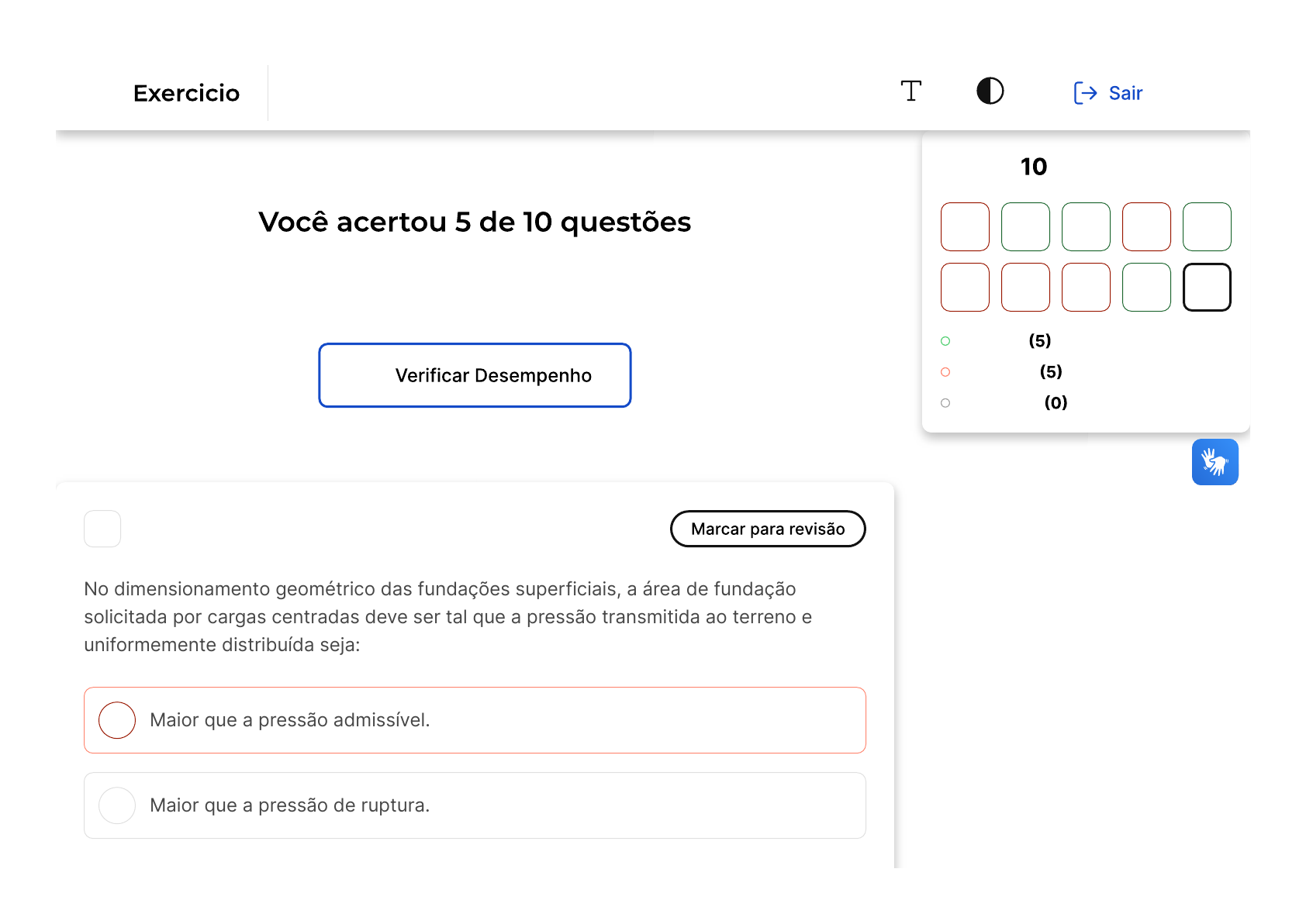 Verifique o seu desempenho e continue treinando! Você pode refazer o exercício quantas vezes quiser. A B 1 No dimensionamento geométrico das fundações superficiais, a área de fundação solicitada por cargas centradas deve ser tal que a pressão transmitida ao terreno e uniformemente distribuída seja: Maior que a pressão admissível. Maior que a pressão de ruptura. Questão de 10 Corretas Incorretas Em branco 1 2 3 4 5 6 7 8 9 10 Processos De Projeto De Fundações Firefox https://estacio.saladeavaliacoes.com.br/exercicio/6629445e257ea9c026895154/gabarito/ 1 of 16 24/04/2024, 14:51 C D E Menor que a pressão admissível ou igual a ela. Menor que a pressão de recalque ou igual a ela. Menor que a pressão de ruptura ou igual a ela. Opa! A alternativa correta é a letra C. Confira o gabarito comentado! A resposta correta é a alternativa C� "Menor que a pressão admissível ou igual a ela". Isso se deve ao fato de que, no dimensionamento geométrico das fundações superficiais, a pressão transmitida ao terreno deve ser controlada para evitar danos estruturais. A pressão admissível é a máxima pressão que o solo pode suportar sem sofrer deformações que possam comprometer a estabilidade da estrutura. Portanto, a pressão transmitida deve ser menor ou igual à pressão admissível para garantir a segurança e a integridade da fundação e da estrutura que ela suporta. 2 Firefox https://estacio.saladeavaliacoes.com.br/exercicio/6629445e257ea9c026895154/gabarito/ 2 of 16 24/04/2024, 14:51 A B C D E Aponte as questões a seguir como verdadeiras �V� ou falsas �F�. I. Sapatas, blocos e radiers são considerados fundações superficiais indiretas. II. Os principais tipos de fundações profundas incluem as estacas, os blocos e os tubulões. III. A escolha da fundação da edificação levará em conta apenas a tensão do solo admissível. Marque a alternativa correta: V, V, V. V, F, V. F, V, F. V, V, F. F, F, F. Parabéns, você selecionou a alternativa correta. Confira o gabarito comentado! Firefox https://estacio.saladeavaliacoes.com.br/exercicio/6629445e257ea9c026895154/gabarito/ 3 of 16 24/04/2024, 14:51 A B Todas as afirmações são falsas. Na primeira afirmação, sapatas, blocos e radiers são considerados fundações superficiais diretas, e não indiretas. Na segunda afirmação, os blocos não são considerados como fundações profundas, apenas as estacas e os tubulões. Na terceira afirmação, a escolha da fundação de uma edificação não leva em conta apenas a tensão do solo admissível, mas também outros fatores como a carga da edificação, o tipo de solo, a presença de água no solo, entre outros. Portanto, a alternativa correta é: F, F, F. 3 Sobre estacas moldadas in loco, assinale a alternativa correta. A estaca hélice contínua é de concreto moldada in loco e executada por meio de trado contínuo. A escavação da estaca do tipo estação pode ser executada com equipamento rotativo acoplado a um guindaste e sem a utilização de lama bentonítica para qualquer tipo de solo. Firefox https://estacio.saladeavaliacoes.com.br/exercicio/6629445e257ea9c026895154/gabarito/ 4 of 16 24/04/2024, 14:51 C D E As estacas do tipo broca são as mais complexas e, devido a esse fato, não possuem limitações de execução em profundidades abaixo do nível d'água. A estaca do tipo strauss é executada a partir da cravação de um tubo por meio de sucessivos golpes de um pilão em uma bucha seca de pedra e areia aderida ao tubo. A estaca ômega é de concreto moldada in loco e executada por meio de trado contínuo. Parabéns, você selecionou a alternativa correta. Confira o gabarito comentado! A alternativa A é a correta porque a estaca hélice contínua é de fato uma estaca de concreto moldada in loco, ou seja, no próprio local da obra. Sua execução é realizada por meio de um trado contínuo, que é uma espécie de broca em formato de hélice. Este equipamento perfura o solo e, simultaneamente, injeta o concreto, formando a estaca. As demais alternativas apresentam informações incorretas ou incompletas sobre os tipos de estacas mencionados. Firefox https://estacio.saladeavaliacoes.com.br/exercicio/6629445e257ea9c026895154/gabarito/ 5 of 16 24/04/2024, 14:51 A B C 4 Sobre as fundações profundas (estacas), analise se as afirmativas abaixo são verdadeiras ou falsas. I � A capacidade de carga de uma estaca pré-moldada de concreto pode ser dada tanto em função do valor fornecido pelo fabricante quanto pelo valor calculado devido às suas resistências de ponta e lateral. Dos dois casos, se adota o de maior valor. II � Quando se fala sobre fundações profundas, sabe-se que deve existir um fator de segurança �FS� adequado em relação à carga que provoca a ruptura do elemento de fundação; além disso, precisa haver um FS adequado quanto à carga que provoca a ruptura do solo de fundação. Devido a esses fatores, os recalques não precisam ser verificados. III � As estacas metálicas possuem maior facilidade de manuseio e armazenamento por conta do menor peso e do volume das peças na comparação com os elementos pré- moldados de concreto. Assinale a alternativa correta: I. II. III. Firefox https://estacio.saladeavaliacoes.com.br/exercicio/6629445e257ea9c026895154/gabarito/ 6 of 16 24/04/2024, 14:51 D E I e III. Todas as afirmativas estão corretas. Opa! A alternativa correta é a letra C. Confira o gabarito comentado! A afirmativa III é a correta. As estacas metálicas realmente possuem maior facilidade de manuseio e armazenamento devido ao seu menor peso e volume, quando comparadas aos elementos pré-moldados de concreto. As afirmativas I e II, no entanto, não são totalmente corretas. A capacidade de carga de uma estaca pré- moldada de concreto não é determinada apenas pelo valor fornecido pelo fabricante ou pelo valor calculado devido às suas resistências de ponta e lateral, mas também por outros fatores, como o tipo de sol