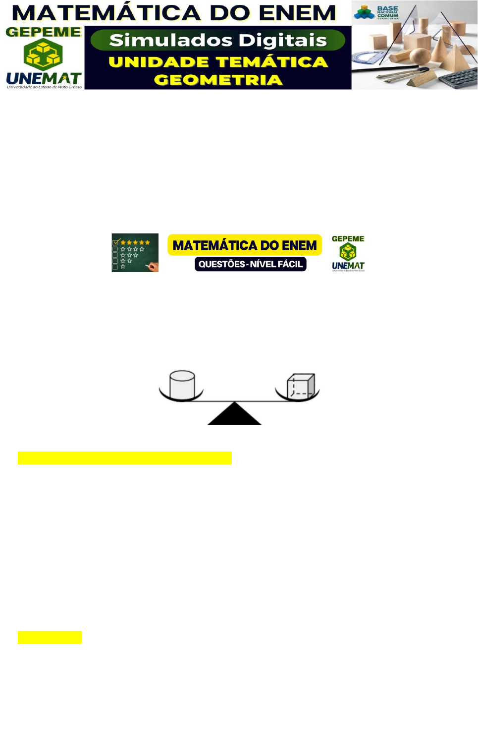 MATEMÁTICA DO ENEM – GEOMETRIA - HABILIDADE DA BNCC - (EM13MAT504) Investigar processos de obtenção da medida do volume de prismas, pirâmides, cilindros e cones, incluindo o princípio de Cavalieri, para a obtenção das fórmulas de cálculo da medida do volume dessas figuras. (EM13MAT309) Resolver e elaborar problemas que envolvem o cálculo de áreas totais e de volumes de prismas, pirâmides e corpos redondos em situações reais (como o cálculo do gasto de material para revestimento ou pinturas de objetos cujos formatos sejam composições dos sólidos estudados), com ou sem apoio de tecnologias digitais. SIMULADO- CILINDROS UNIDADE TEMÁTICA - GEOMETRIA HABILIDADE DA BNCC – (EM13MAT504) Investigar processos de obtenção da medida do volume de prismas, pirâmides, cilindros e cones, incluindo o princípio de Cavalieri, para a obtenção das fórmulas de cálculo da medida do volume dessas figuras. (EM13MAT309) Resolver e elaborar problemas que envolvem o cálculo de áreas totais e de volumes de prismas, pirâmides e corpos redondos em situações reais (como o cálculo do gasto de material para revestimento ou pinturas de objetos cujos formatos sejam composições dos sólidos estudados), com ou sem apoio de tecnologias digitais. QUESTÃO 1 – (Ano: 2022 Banca: Associação dos Municípios do Alto Uruguai Catarinense Prova: Prefeitura de Lindoia do Sul – Engenheiro Agrônomo) O esquema abaixo mostra duas peças maciças em uma balança que está em perfeito equilíbrio. Se o volume do cilindro é de 27.000 cm³, quanto mede a aresta do cubo? (A) A aresta do cubo mede 9 centímetros. (B) A aresta do cubo mede 30 centímetros. (C) A aresta do cubo mede 10 centímetros. (D) A aresta do cubo mede 25 centímetros. (E) A aresta do cubo mede 15 centímetros. QUESTÃO 2 – (Ano: 2023 Banca: Fundação Universidade Empresa de Tecnologia e Ciências - FUNDATEC – Prova: prefeitura de São João do Polêsine) O volume de um cilindro circular reto é igual a 785 cm3 e a sua altura mede 10 cm. Sabendo disso, a área da base desse cilindro é? (Utilize 𝜋 = 3,14). (A) 80 cm2. (B) 68,5 cm2. (C) 31,4 cm2. (D) 78,5 cm2. (E) 1962,5 cm2. MATEMÁTICA DO ENEM – GEOMETRIA - HABILIDADE DA BNCC - (EM13MAT504) Investigar processos de obtenção da medida do volume de prismas, pirâmides, cilindros e cones, incluindo o princípio de Cavalieri, para a obtenção das fórmulas de cálculo da medida do volume dessas figuras. (EM13MAT309) Resolver e elaborar problemas que envolvem o cálculo de áreas totais e de volumes de prismas, pirâmides e corpos redondos em situações reais (como o cálculo do gasto de material para revestimento ou pinturas de objetos cujos formatos sejam composições dos sólidos estudados), com ou sem apoio de tecnologias digitais. QUESTÃO 3 – (Ano: 2022 Banca: Instituto Nosso Rumo de Educação e Desenvolvimento Social – NOSSO RUMO. Prova: Prefeitura de Indaiatuba). Assinale a alternativa que apresenta o volume de um cilindro com 7 metros de altura e 12 metros de raio. Utilize π = 3, 14. (A) 504,08 m3 (B) 588,09 m3 (C) 1.008,1 m3 (D) 1.846,14 m3 (E) 3.165,12 m3 QUESTÃO 4 – (Ano: 2023 Banca: Fundação Universidade Empresa de Tecnologia e Ciências – FUNDATEC. Prova: Câmara de São Gabriel). Considerando o valor de 𝜋 = 3,14, qual o diâmetro, em metros, de um cilindro circular reto cujo volume é 4.521,6 cm3 e altura igual a 10 cm? (A) 0,12 m. (B) 0,24 m. (C) 0,26 m. (D) 12 m. (E) 24 m. QUESTÃO 5 – (Ano: 2023 Banca: Fundação Universidade Empresa de Tecnologia e Ciências – FUNDATEC. Prova: Prefeitura de Casca). Considere um cilindro circular reto cujo raio da base é r e altura é h. Quando se duplica simultaneamente r e h, o volume do cilindro: (A) Não se altera. (B) Duplica. (C) Quadruplica. (D) Fica multiplicado por 6. (E) Fica multiplicado por 8. MATEMÁTICA DO ENEM – GEOMETRIA - HABILIDADE DA BNCC - (EM13MAT504) Investigar processos de obtenção da medida do volume de prismas, pirâmides, cilindros e cones, incluindo o princípio de Cavalieri, para a obtenção das fórmulas de cálculo da medida do volume dessas figuras. (EM13MAT309) Resolver e elaborar problemas que envolvem o cálculo de áreas totais e de volumes de prismas, pirâmides e corpos redondos em situações reais (como o cálculo do gasto de material para revestimento ou pinturas de objetos cujos formatos sejam composições dos sólidos estudados), com ou sem apoio de tecnologias digitais. QUESTÃO 6 – (Ano: 2017 Banca: Instituto de Desenvolvimento Educacional, Cultural e Assistencial Nacional – IDECAN). Numa promoção em um supermercado foram feitas embalagens contendo 3 latas de refrigerantes sendo estas em formato cilíndrico reto. A figura a seguir representa a vista superior da embalagem na qual as áreas hachuradas representam os espaços vazios. Sendo o raio do cilindro igual a 3 cm e sua altura 10 cm, qual o volume ocupado pela área vazia no interior da embalagem? (Considere: √ 3 = 1,73 e π = 3,14.). (A) 126,9 cm³. (B) 128,1 cm³. (C) 130,5 cm³. (D) 132,4 cm³. (E) 142,4 cm³. QUESTÃO 7 - (Ano: 2017. Banca: Ministério Público de Goiás - MPE GO) Para evitar o desperdício de água potável em sua casa, o Sr. José construiu um sistema de captação de água das chuvas. Essa água será armazenada em uma cisterna cilíndrica cujas dimensões internas são três (3) metros de altura e dois (2) metros de diâmetro, conforme esquema na figura a seguir. Lembre-se que: V = π . R2. H (para efeito de cálculo, adote: π = 3,14) Poucos dias após o término da construção da cisterna, quando ela ainda estava totalmente vazia, choveu dois dias seguidos, o que deixou o Sr. José muito contente, pois ele observou que: • no primeiro dia, o índice pluviométrico foi de 36 mm/m2, o que fez o nível da água na cisterna atingir a marca de 72 cm; • no segundo dia, o índice pluviométrico foi de 30 mm/m2. Considere que: • não foi retirada água da cister