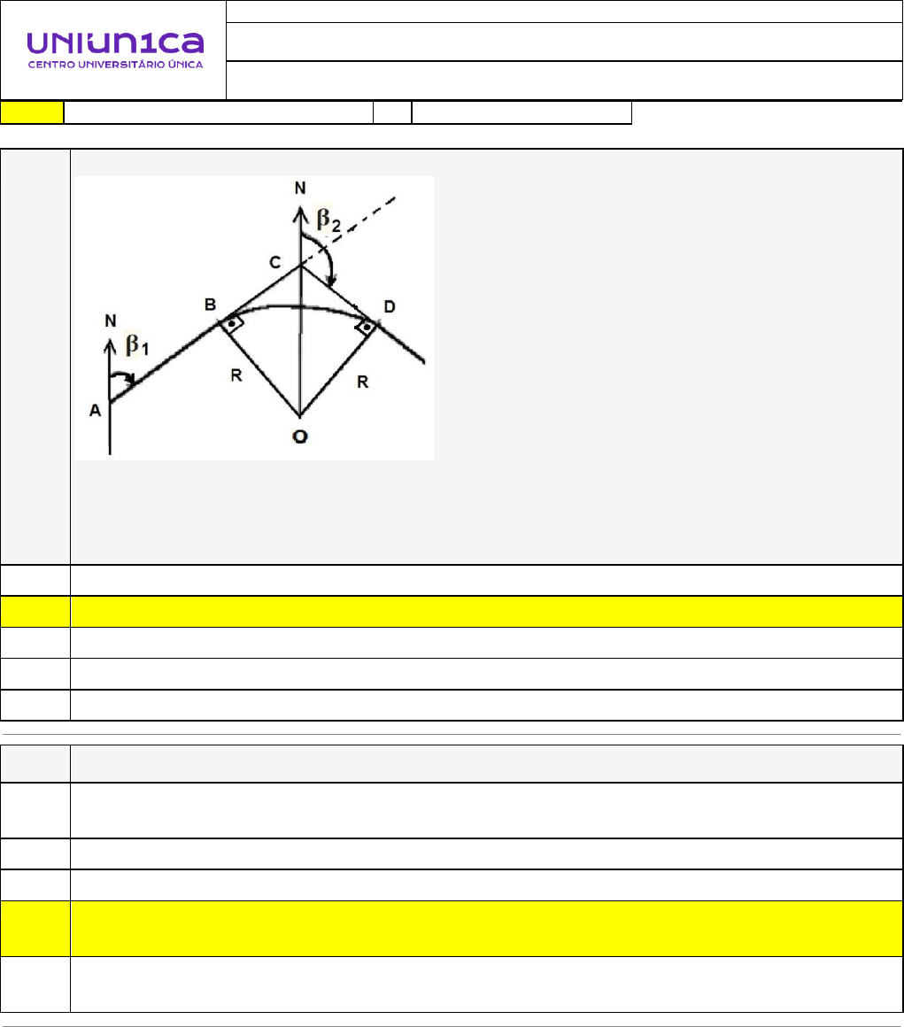 09/11/2024 16:44:58 1/3 REVISÃO DE SIMULADO Nome: Disciplina: Estradas Respostas corretas são marcadas em amarelo X Respostas marcardas por você. Questão 001 Observe o desenho abaixo: Figura 39. Trecho de estrada. Fonte o próprio autor. Considerando que β1= 600; β2= 1200; as distâncias BC=CD= 180m; π = 3,14; é possível afirmar que, os valores aproximados do raio R e o arco BD, são respectivamente: A) 311m e 163m. X B) 311m e 326m. C) 104m e 109m. D) 311m e 109m. E) 104m e 326m. Questão 002 Sobre o perfil longitudinal de uma estrada, é correto o que se afirma em: A) Nele devem ser indicados o tipo de vegetação, as áreas cultivadas, a presença de fábricas, instalações militares entre outros. B) Nele constam as dimensões e indicações transversais das faixas de tráfego. C) As curvas circulares, tangentes, raios e outros elementos planimétricos importantes. X D) Devem constar neste perfil o estaqueamento e o desenho esquemático da planta, para a localização dos acidentes do perfil em relação aos da planta. E) No perfil longitudinal são indicadas as linhas dos bordos da plataforma da estrada e a sua faixa de domínio. 09/11/2024 16:44:58 2/3 Questão 003 Uma estrada está sendo projetada. A equipe de topografia locou um trecho conforme apresentado abaixo: Figura 38. Trecho de estrada. Fonte o próprio autor. Considerando que as distâncias entre A e B é 50m, entre A e C é 221m, o ângulo Ï´ é 1400, o comprimento aproximado do raio R em metros é (considerar π = 3,14): A) 90. X B) 70. C) 170. D) 20. E) 47. Questão 004 (FUNDATEC - Prefeitura de Capão da Canoa - Engenheiro Civil - 2019) adaptado. Considere as seguintes definições a seguir. I. O alinhamento horizontal é o greide da rodovia, com suas características altimétricas. II. As seções transversais devem conter as dimensões e indicações transversais das faixas de tráfego, pistas, acostamentos, separadores centrais e demais elementos que compõem a plataforma da estrada entre outras informações. III. As plantas devem conter as linhas de bordo da plataforma e sua faixa de domínio. IV. As seções transversais são representações gráficas dos cortes feitos nos planos horizontais em uma perpendicular ao eixo da rodovia. Estão corretas as definições: X A) II, III e IV apenas. B) I e III apenas. C) I, II e III apenas. D) I, III e IV apenas. E) II e III apenas. Questão 005 Sobre as seções transversais de uma estrada, avalie as afirmações a seguir. I- Estas seções normalmente contêm as dimensões e indicações transversais das faixas de tráfego, comprimento das curvas e suas tangentes, comprimento dos acostamentos, etc. II- Nas seções transversais é comum a indicação dos dispositivos de segurança e das obras de arte da estrada. III- Elas devem conter a posição de início de taludes, as faixas de domínio, os azimutes de alinhamento. IV- Nestas seções são mostrados os dispositivos de drenagem como também os taludes de cortes, de aterros e mistos. É possível afirmar que estão corretas as afirmativas: X A) II, III e IV apenas. B) I e II apenas. C) I e III apenas. D) II e IV apenas, 09/11/2024 16:44:58 3/3 E) III e IV apenas. Questão 006 Sobre os elementos planimétricos de uma estrada, avalie as afirmações a seguir. I- A deflexão indica a posição absoluta que é o ângulo formado pelo seu alinhamento com o eixo Norte-Sul. II- Alinhamentos são trechos retos situados entre duas curvas de concordância. III- Azimutes são ângulos formados por um alinhamento precedente e um alinhamento. É possível afirmar que estão corretas as afirmativas: A) I apenas. B) II apenas. C) III apenas, D) I e II apenas X E) Todas as alternativas são corretas. Questão 007 Sobre as principais atividades de um projeto, viários listados pelo DNIT em 2006; relacione a primeira coluna com a segunda, baseado nas informações abaixo: 1. Projeto de drenagem ( ) Uma das etapas desenvolvidas é a representação de seções transversais típicas em pontos importantes. 2. Estudos topográficos ( ) É onde são apontadas as diferenças de nível do terreno com o um todo, seus ângulos e suas medidas planas. 3. Projetos de interseções, retornos e acessos ( ) Nesta etapa é que são previstas soluções estruturais, características geométricas, extensões, etc., de intervenções para facilitar o fluxo de veículos na região escolhida. 4. Projetos de obras de arte ( ) Entre as etapas que devem ser efetuadas está a representação planialtimétrica, com devido dimensionamento e o tratamento de todos os elementos geométricos do projeto. 5. Projetos de interseções, retornos e acessos ( ) É onde efetuado o dimensionamento e a quantificação para a solução dos problemas de escoamento identificados. Assinale a alternativa que indica a sequência correta, de cima para baixo. A) 3 – 5 – 4 – 1 – 2. X B) 3 – 2 – 4 – 5 – 1. C) 3 – 4 – 2 – 5 – 1. D) 2 – 3 – 5 – 4 – 1. E) 2 – 4 – 5 – 1 – 3. Questão 008 (UFG 2022 – adaptado) O projeto de um perfil longitudinal deve ser desenhado com uma deformação nas escalas para destacar os acidentes verticais presentes no trecho analisado. Assim as escalas horizontais e verticais de um perfil longitudinal guardam uma proporção de: A) 3:2. B) 5:1. C) 2:3. D) 10:1. X E) 1:10.