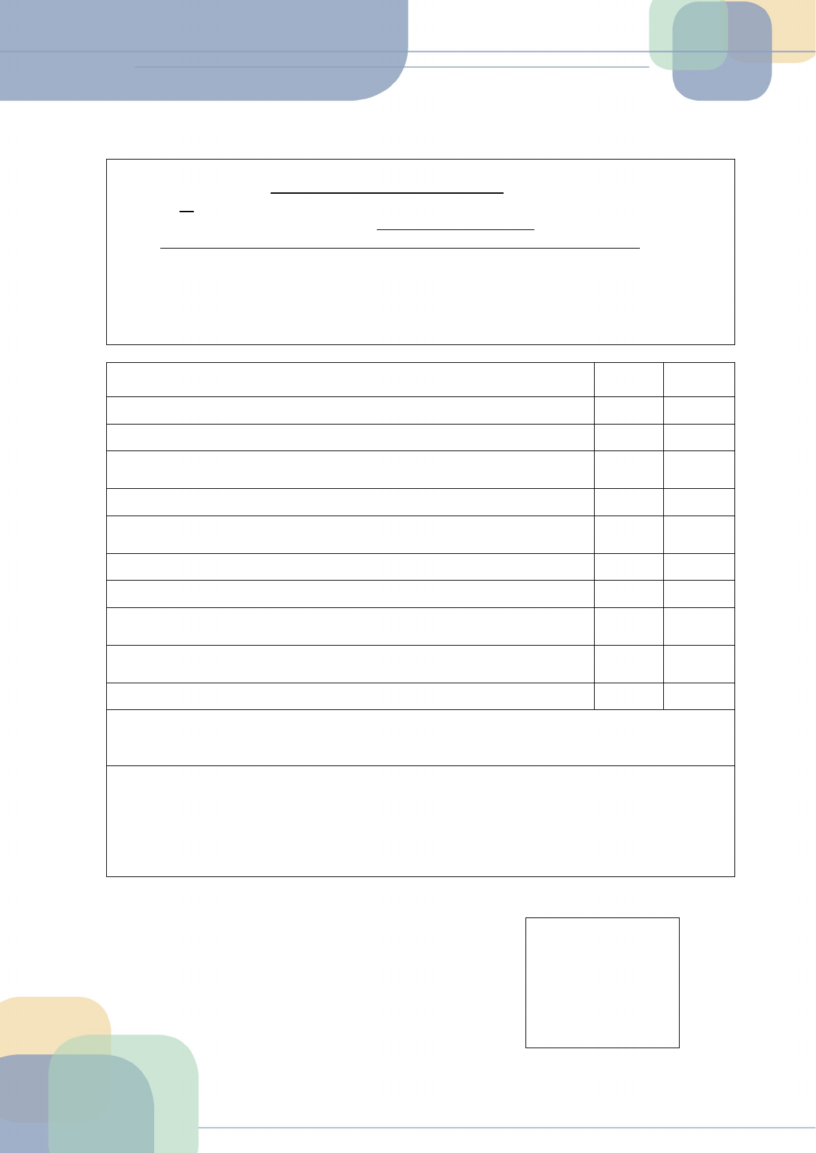 FICHA DE AVALIAÇÃO Nome do(a) estagiário(a) LUANA CRISTINA DE OLIVEIRA SULINO Semestre: 6º Professor Regente (Supervisor de Campo): VÂNIA DE OLIVEIRA SILVA Escola: CENTRO MUNICIPAL DE EDUCAÇÃO INFANTIL MAGDA CICHINI DE MENDONÇA Série: _______ Turno: ___________ ( ) EDUCAÇÃO INFANTIL ( ) Ensino Médio Número total de aulas ministradas pelo estagiário: ______ aulas Datas das Aulas ministradas: ____________________________________________________________ Critérios para apreciação das aulas ATENDE NÃO ATENDE 1. Clareza e relevância dos objetivos. 1. Conhecimento do conteúdo aplicado. 1. Abordagem dos conceitos quanto à correta aplicação, profundidade e adequação à idade/série. 1. Atividades realizadas (variedade / adequação / andamento). 1. Recursos materiais adequados (mapas, filmes, músicas, imagens, textos, etc.) ao assunto abordado. 1. Interação com alunos. 1. Adequação da linguagem (pronúncia correta, clara, fluente). 1. Manejo de classe, disciplina, engajamento (inclusive quando surgem situações imprevistas). 1. Organização sequencial de atividades (inclusive com a estimativa de tempo). 1. Postura coerente com a que se espera de um futuro profissional da área. Critérios de aprovação: O aluno precisa atender, no mínimo, seis (6) critérios. Observações do Supervisor de Campo: Assinaturas: ___________________________ Assinatura do Professor Regente (Supervisor de Campo) ____________________________ Assinatura do Polo de Apoio Presencial CARIMBO DA ESCOLA ____________________________ Assinatura do Diretor da Escola ____________________________ Assinatura do(a) Estagiário(a) image1.jpeg FICHA DE AVALIAÇÃO Nome do(a) estagiário(a ) LUANA CR ISTINA DE OL IVEIRA SULINO Semestre: 6º Professor Regente (Supervisor de Campo): VÂNIA DE OLIVEIRA SILVA Escola: CENTRO MUNICIPAL DE EDUCAÇÃO IN FANTIL MAGDA CI CHINI DE MENDONÇA Série: _______ Turno: ___________ ( ) E D UCAÇÃO IN FANT IL ( ) Ensino Médio Número total de aulas ministradas pelo estagiário: ______ aulas Datas das Aulas ministradas: ________________________________________________ ____________ Critérios para apreciação das aulas ATENDE NÃO ATENDE 1. Clareza e relevância dos objetivos. 2. Conhecimento do conteúdo aplicado. 3. Abordagem dos conceitos quanto à correta aplicação, profundidade e adequação à idade/série. 4. Atividades realizadas (variedade / adequação / andamento). 5. Recursos materiais adequados (mapas, filmes, músicas, imagens, textos, etc.) ao assunto abordado. 6. Interação com alunos. 7. Adequação da linguagem (pronúncia correta, clara, fluente). 8. Manejo de classe, disciplina, engajamento (inclusive quando surgem situações imprevistas). 9. Organização sequencial de atividades (inclusive com a estimativa de tempo). 10. Postura coerente com a que se espera de um futuro profissional da área. Critérios de aprovação: O aluno precisa atender, no mínimo, seis (6) critérios. Observações do Supervisor de Campo: A ssinaturas: ___________________________ Assinatura do Professor Regente (Supervisor de Campo) ____________________________ Assinatura do Polo de Apoio Presencial CARIMBO DA ESCOLA ____________________________ Assinatura do Diretor da Escola ____________________________ Assinatura do(a) Estagiário(a) FICHA DE AVALIAÇÃO Nome do(a) estagiário(a) LUANA CRISTINA DE OLIVEIRA SULINO Semestre: 6º Professor Regente (Supervisor de Campo): VÂNIA DE OLIVEIRA SILVA Escola: CENTRO MUNICIPAL DE EDUCAÇÃO INFANTIL MAGDA CICHINI DE MENDONÇA Série: _______ Turno: ___________ ( ) EDUCAÇÃO INFANTIL ( ) Ensino Médio Número total de aulas ministradas pelo estagiário: ______ aulas Datas das Aulas ministradas: ____________________________________________________________ Critérios para apreciação das aulas ATENDE NÃO ATENDE 1. Clareza e relevância dos objetivos. 2. Conhecimento do conteúdo aplicado. 3. Abordagem dos conceitos quanto à correta aplicação, profundidade e adequação à idade/série. 4. Atividades realizadas (variedade / adequação / andamento). 5. Recursos materiais adequados (mapas, filmes, músicas, imagens, textos, etc.) ao assunto abordado. 6. Interação com alunos. 7. Adequação da linguagem (pronúncia correta, clara, fluente). 8. Manejo de classe, disciplina, engajamento (inclusive quando surgem situações imprevistas). 9. Organização sequencial de atividades (inclusive com a estimativa de tempo). 10.Postura coerente com a que se espera de um futuro profissional da área. Critérios de aprovação: O aluno precisa atender, no mínimo, seis (6) critérios. Observações do Supervisor de Campo: Assinaturas: ___________________________ Assinatura do Professor Regente (Supervisor de Campo) ____________________________ Assinatura do Polo de Apoio Presencial CARIMBO DA ESCOLA ____________________________ Assinatura do Diretor da Escola ____________________________ Assinatura do(a) Estagiário(a)