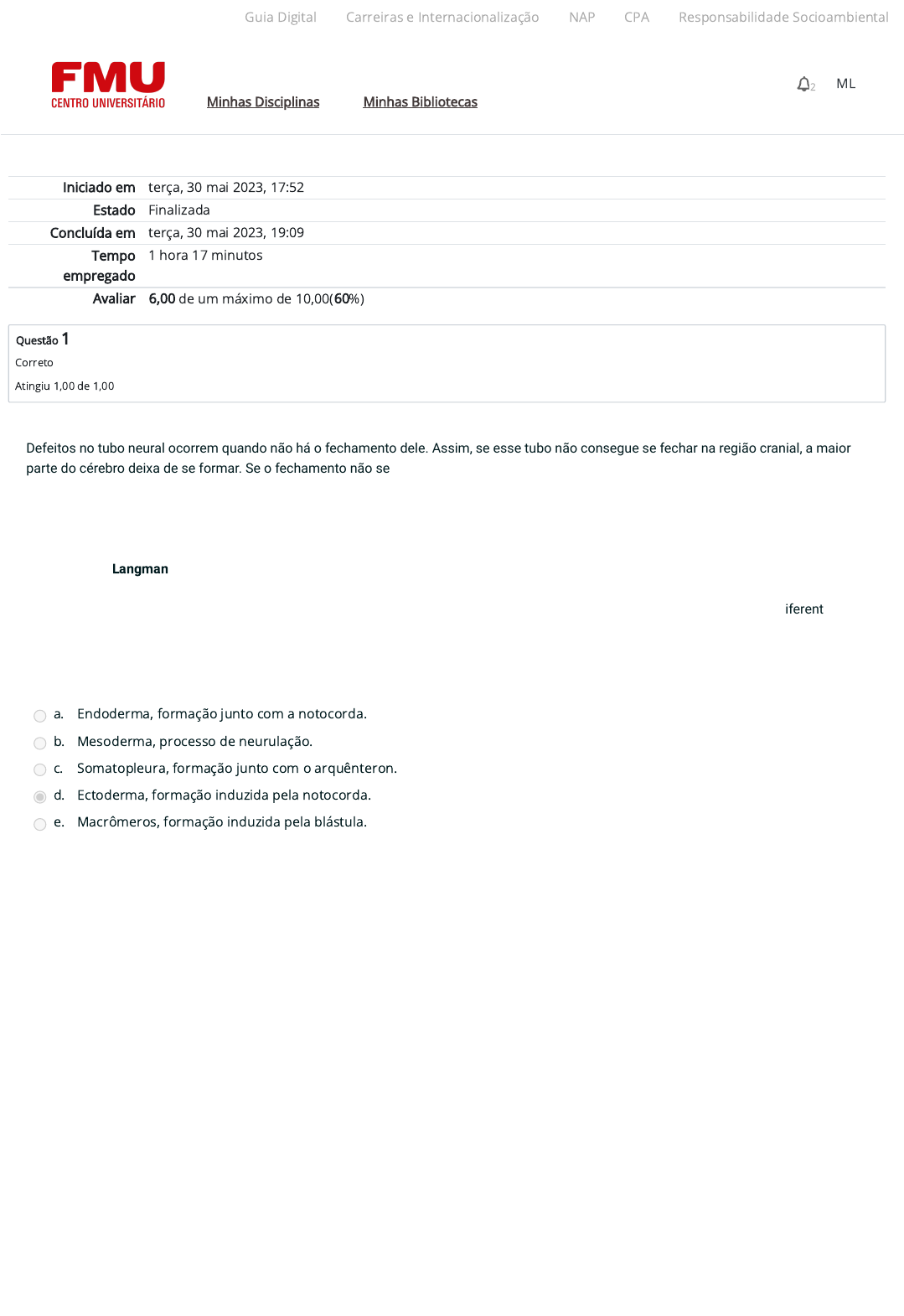 Iniciado em terça, 30 mai 2023, 17:52 Estado Finalizada Concluída em terça, 30 mai 2023, 19:09 Tempo empregado 1 hora 17 minutos Avaliar 6,00 de um máximo de 10,00(60%) Questão 1 Correto Atingiu 1,00 de 1,00 Defeitos no tubo neural ocorrem quando não há o fechamento dele. Assim, se esse tubo não consegue se fechar na região cranial, a maior parte do cérebro deixa de se formar. Se o fechamento não se dá em qualquer outra parte, ocorre um defeito denominado espinha bífida. Crianças com defeitos no tubo neural perdem funções neurológicos, e as disfunções dependem do nível e da gravidade da lesão. Esses defeitos podem ser decorrentes de fatores genéticos e/ou ambientais. A deficiência do ácido fólico na gestação, por exemplo, pode causar problemas no fechamento do tubo neural, provocando alterações como anencefalia ou espinha bífida. SADLER, T. W. Langman: embriologia médica. 13. ed. Rio de Janeiro: Guanabara Koogan, 2017. Na embriogênese, uma etapa importante é a neurulação, em que se inicia a formação do sistema nervoso. Durante essa fase, diferentes folhetos embrionários dão origem a estruturas distintas. Assinale a alternativa que associa corretamente o local de origem e o processo de formação do tubo neural. a. Endoderma, formação junto com a notocorda. b. Mesoderma, processo de neurulação. c. Somatopleura, formação junto com o arquênteron. d. Ectoderma, formação induzida pela notocorda. e. Macrômeros, formação induzida pela blástula. Guia Digital Carreiras e Internacionalização NAP CPA Responsabilidade Socioambiental Minhas Disciplinas Minhas Bibliotecas 2 ML https://codely-fmu-content.s3.amazonaws.com/Moodle/GuiaDigital/Guia+digital/index.html https://carreiras.fmu.br/ https://codely-fmu-content.s3.amazonaws.com/Moodle/NAP/inicial/nap/fmu/index.html https://codely-fmu-content.s3.amazonaws.com/Moodle/CPA/landing_CPA/index.html https://portal.fmu.br/sustentabilidade https://ambienteacademico.com.br/ https://ambienteacademico.com.br/ https://ambienteacademico.com.br/course/view.php?id=236 Questão 2 Correto Atingiu 1,00 de 1,00 A importância da embriologia está relacionada à aplicabilidade dos estudos sobre a origem da estrutura humana normal e das malformações congênitas relacionadas. A embriologia humana tem como objeto de estudo a fase pré-natal do desenvolvimento, que inclui desde a formação do zigoto até o nascimento. O zigoto é uma célula altamente especializada e que sofre transformação por meio de vários processos – multiplicação, crescimento, diferenciação e rearranjo celulares – até a formação de um organismo multicelular. Fonte: MEIRA, M. S. et al. Intervenção com modelos didáticos no processo de ensino-aprendizagem do desenvolvimento embrionário humano: uma contribuição para a formação de licenciados em ciências biológicas. Ciência e Natura, v. 37, n. 2, maio/ago. 2015, p. 301-311. Disponível em: . Acesso em: 10/03/2019. A figura a seguir representa uma das fases iniciais na primeira semana de desenvolvimento. Fonte: Sakurra, Shutterstock, 2019. [PRG1] Cada uma das fases iniciais do desenvolvimento embrionário tem características próprias. Assinale a alternativa que associa corretamente a fase do desenvolvimento embrionário representada na figura e as características dela. a. Nêurula - estágio caracterizado por trofoblasto, embrioblasto e mesoderma. b. Mórula - estágio composto por quatro células formadas por divisões mitóticas. c. Blastocisto - caracterizado pela presença de uma cavidade entre camadas de células denominadas embrioblasto e trofoblasto. d. Gástrula - estágio formado por 16 células, com uma massa celular interna e uma massa celular externa. e. Blastocisto - estágio formado por uma bola compacta de oito células mantidas por uma junção de oclusão. Guia Digital Carreiras e Internacionalização NAP CPA Responsabilidade Socioambiental Minhas Disciplinas Minhas Bibliotecas 2 ML https://codely-fmu-content.s3.amazonaws.com/Moodle/GuiaDigital/Guia+digital/index.html https://carreiras.fmu.br/ https://codely-fmu-content.s3.amazonaws.com/Moodle/NAP/inicial/nap/fmu/index.html https://codely-fmu-content.s3.amazonaws.com/Moodle/CPA/landing_CPA/index.html https://portal.fmu.br/sustentabilidade https://ambienteacademico.com.br/ https://ambienteacademico.com.br/ https://ambienteacademico.com.br/course/view.php?id=236 Questão 3 Correto Atingiu 1,00 de 1,00 Leia com atenção o trecho a seguir. “A fertilização, processo pelo qual os gametas masculino e feminino se fundem, ocorre na região ampular da tuba uterina – porção mais larga da tuba e próxima ao ovário. Os espermatozoides podem permanecer viáveis no sistema genital feminino por vários dias. Apenas 1% do esperma depositado na vagina penetra no colo do útero, onde os espermatozoides podem sobreviver por muitas horas. O movimento deles do colo do útero para a tuba uterina ocorre pelas contrações musculares do útero e da tuba uterina, e muito pouco pela sua própria propulsão”. SADLER, T. W. Langman: embriologia médica. 13. ed. Rio de Janeiro: Guanabara Koogan, 2017, p. 3. Após a fertilização, seguem-se eventos que caracterizam o processo inicial do desenvolvimento embrionário. Muitas mudanças acontecem nas primeiras semanas da embriogênese. Analise as afirmações a seguir sobre os eventos que acontecem na embriogênese e assinale V para as verdadeiras, e F para as falsas. ( ) A ovogênese termina quando o espermatozoide penetra no oócito secundário, liberado pelo ovário quando se inicia a segunda divisão meiótica. ( ) Em torno de seis a sete horas após a fecundação, inicia-se a implantação da blástula no endométrio uterino, que encontra-se na fase secretora. ( ) O ectoderma é o folheto embrionário que origina sistemas digestório, respiratório e a bexiga urinária. ( ) O endoderma é o folheto embrionário que origina tecidos corporais relacionados a funções de sust