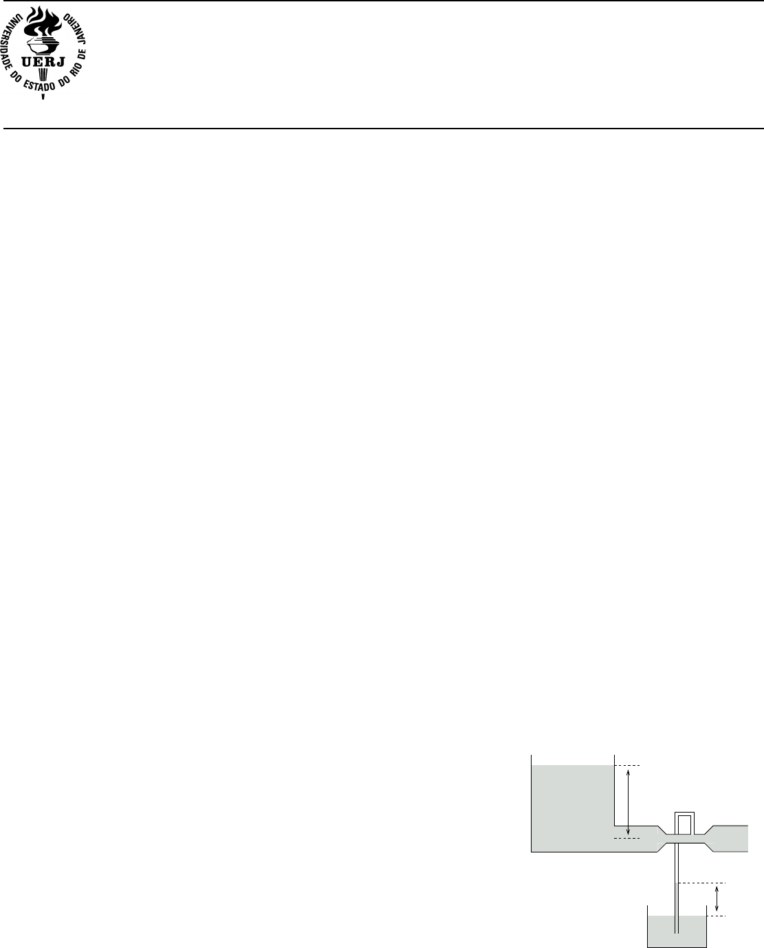 Instituto de F́ısica Mecânica F́ısica IIA Prof. Marcelo Chiapparini Lista 2 - Hidrodinâmica de fluidos perfeitos 1. Água flui a 0,65 m/s por uma mangueira de 3 cm de diâmetro. Na ponta da mangueira há um bocal de 0,30 cm de diâmetro: (a) A que velocidade a água passa pelo bocal? (b) Se a bomba ligada em uma das extremidades da mangueira e o bocal ligado na outra estiverem à mesma altura, e se a pressão do bocal for de 1 atm, qual será a pressão da bomba? 2. O sangue flui a 30 cm/s em uma aorta de 9 mm de raio. (a) Calcule a vazão do sangue em litros por minuto. (b) Embora a área de seção transversal de um vaso capilar seja muito menor do que a da aorta, há muitos vasos capilares, e assim a área total das seções transversais desses vasos é muito maior. O sangue da aorta flui nos vasos capilares a uma velocidade de 1,0 mm/s. Calcule a área total das seções transversais dos vasos capilares. 3. Uma fonte projetada para lançar uma coluna de água de 12 m no ar tem um bocal de 1 cm de diâmetro localizado no ńıvel do solo. A bomba de água está a 3 m abaixo do ńıvel do solo. O tubo para o bocal tem 2 cm de diâmetro. Calcule a pressão necessária da bomba. 4. Um reservatório de paredes verticais, colocado sobre um terreno horizontal, contém água até uma altura h. Se abrirmos um pequeno orif́ıcio numa parede lateral, (a) A que distância máxima d da parede o jato de água poderá atingir o chão? (b) Em que altura deve estar o orif́ıcio para que essa distância máxima seja atingida? 5. Um tubo horizontal de 10,0 cm de diâmetro passa por uma redução suave para um tubo de 5,00 cm de diâmetro. Se a pressão da água no tubo maior for 8, 00×104 Pa e a pressão no tubo menor for 6, 00×104 Pa, em qual taxa a água flui através dos tubos? 6. Um filete de água escorre verticalmente de uma torneira de raio a, com escoamento estacionário e vazâo Q. Ache a forma do jato de água que cai, determinando o raio ρ da seção transversal do jato em função da altura z da queda (medida desde o bocal da torneira). h1 h2 7. Um medidor de Venturi: um grande tanque tem um tubo de es- coamento na sua base. Ao longo do tubo existe uma constrição cujo diâmetro é um terço do diâmetro do resto do cano. Nesta constrição existe um tubo que leva a um segundo tanque que contém o mesmo fluido que o primeiro. Quando o ĺıquido escoa do primeiro tanque, que altura h2 o fluido atinge no tubo? Ex- presse sua resposta em termos de h1. 8. Um tanque de água encontra-se sobre um carrinho que pode mover-se sobre um trilho horizontal sem atrito. Há um pequeno orif́ıcio numa parede, a uma profundidade h abaixo do ńıvel da água no tanque. A área do orif́ıcio é A, a massa inicial de água é M0 e a massa do carrinho e do tanque é m0. Qual a aceleração inicial do carrinho? 9. Um bombeiro segura uma mangueira com uma determinada cur- vatura, ilustrada na figura. Essa mangueira tem uma seção reta de 1,5 cm de raio e jorra água a uma velocidade de 30 m/s. (a) Que massa de água flui da mangueira em 1 s? (b) Qual o momento linear horizontal dessa massa de água? (c) Antes de alcançar a curva da mangueira, a água tem mo- mento dirigido na vertical para cima e, posteriormente, seu momento está na horizontal. Desenhe o diagrama vetorial dos momentos inicial e final, e calcule a variação do momento da água na curva durante 1 s. Calcule a força exercida pela mangueira sobre a água. h v 10. Dois tubinhos do mesmo diâmetro, muito menor que o do tubo principal, um retiĺıneo e outro com um cotovelo, estão imersos numa correnteza horizontal de água de velocidade v. A diferença entre o ńıveis de água nos dois tubinhos é h = 5 cm. Calcule v. h v 11. A figura ilustra uma variante do tubo de Pitot, empregada para medir a velocidade v de escoamento de um fluido de densidade ρ. Calcule v em função do desńıvel h entre os dois ramos do manômetro e da densidade ρf do fluido manométrico. O diâmetro do tubinho é muito menor que o do tubo principal. h0 h1 p 0 C B A 12. Um sifão é estabelecido aspirando um ĺıquido de densidade ρ através de um tubo curvado ABC e fazendo-o jorrar em C, com velocidade de escoamento v. (a) Calcule v em função dos parâmetros da figura. (b) Calcule a pressão nos pontos A e B. (c) Qual é o valor máximo de h0 para o qual o sifão funciona? 13. Um avião tem uma massa total de 2000 kg e a área total coberta por suas asas é de 30 m2. O desenho de suas asas é tal que a velocidade de escoamento acima delas é 1,25 vezes maior que abaixo, quando o avião está decolando. A densidade da atmosfera é de 1,3 kg/m3. Que velocidade mı́nima de escoamento (em km/h) acima das asas precisa ser atingida para que o avião decole? 14. O prinćıpio de Bernoulli pode ter consequências importantes para o projeto de edif́ıcios. Por exemplo, o vento pode mover-se em torno de um arranha-céu com velocidade bastante alta, criando baixa pressão. A pressão atmosférica mais elevada do ar parado dentro dos edif́ıcios pode fazer com que as janelas estourem para fora. Como originalmente constrúıdo, o edif́ıcio John Hancock em Boston estourou suas janelas, que cáıram muitos andares até a calçada abaixo. (a) Suponha que um vento horizontal se desloca com uma velocidade de 11,2 m/s fora de uma grande janela de vidro com dimensões de 4,00 m × 1,50 m. Suponha que a densidade do ar é de 1,30 kg/m3. O ar dentro do edif́ıcio está na pressão atmosférica. Qual é a força total exercida pelo ar na placa de vidro da janela? (b) Se um segundo arranha-céu for constrúıdo próximo, a velocidade do ar pode ser especialmente elevada onde o vento passa por um intervalo estreito entro os edif́ıcios. Resolva o item (a) outra vez, considerando a velocidade do vento como de 22,4 m/s, duas vezes maior.